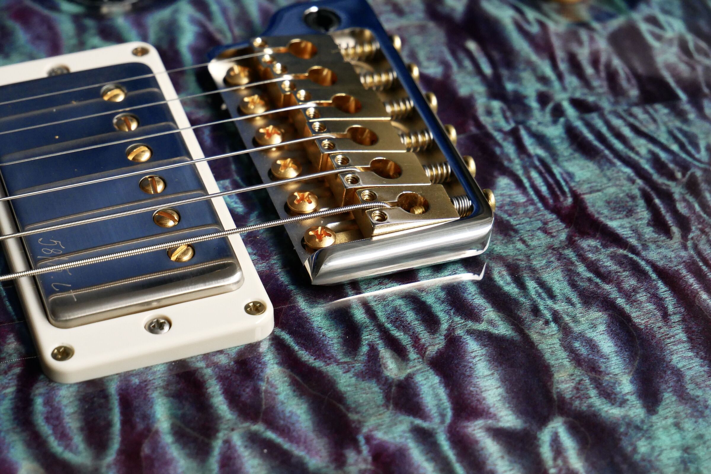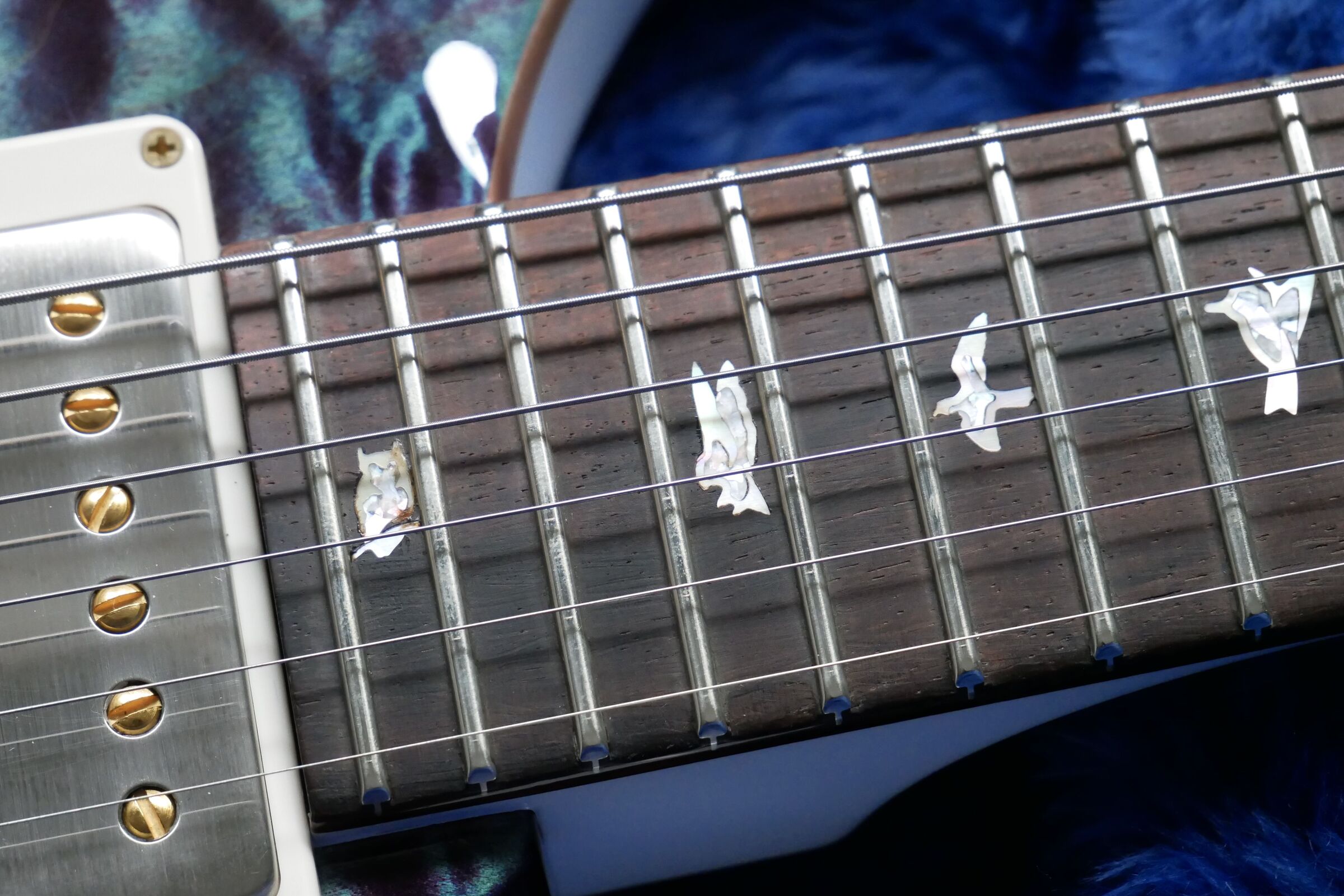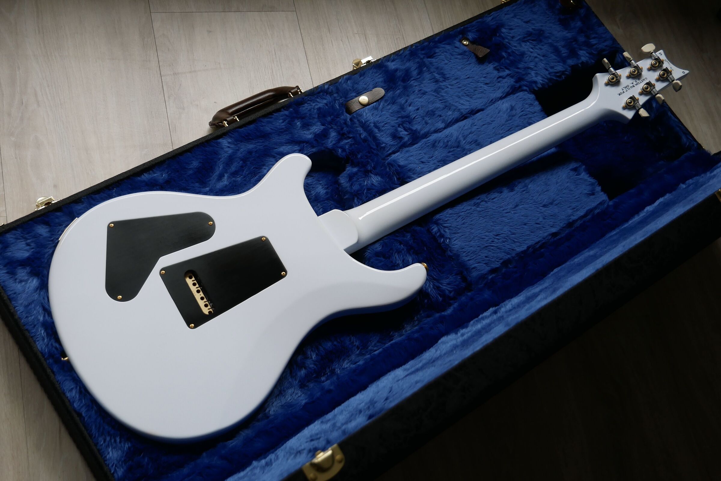 Custom24是PRS一直以來最受歡迎的系列,不只音色上出眾,外觀也相當華麗,配色為市場上稀有的Violet,搭配少見的雲狀楓木,琴身背後選配全白色烤漆,相當特別。琴身為桃花心木,指板為巴西玫瑰木,琴頸規格為Pattern Thin Neck。原廠配置一組擁有全新TCI技術的PRS 85/15 Pickups拾音器,TCI系統能使高低頻各自擁有非常均衡、線性統一的出力,不會有傳統拾音器低頻混濁、高頻過尖的問題,也解決了傳統拾音器雙單線圈切換時造成瞬間輸出率落差問題,共五段音色,清甜顆粒感十足的單線圈音色到出力突出的雙線圈破音都能勝任,音色相當全面的一款PRS。