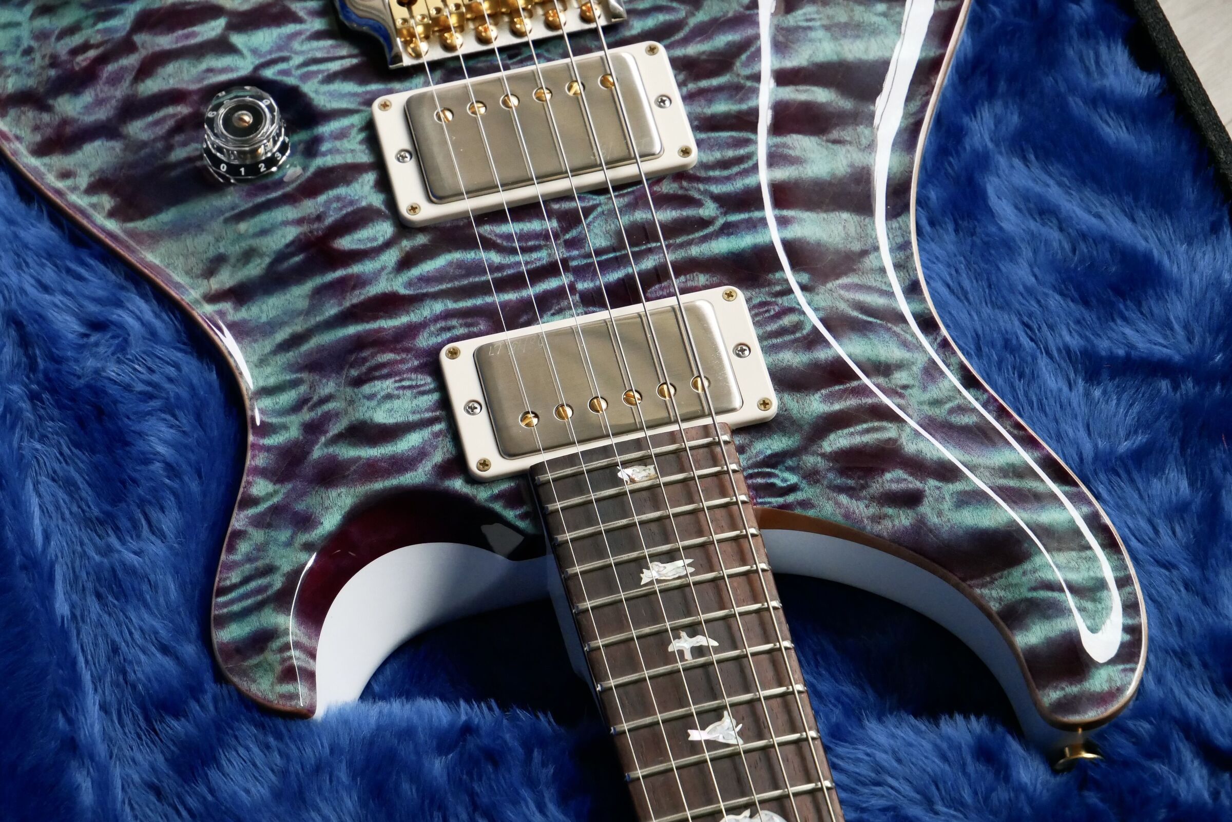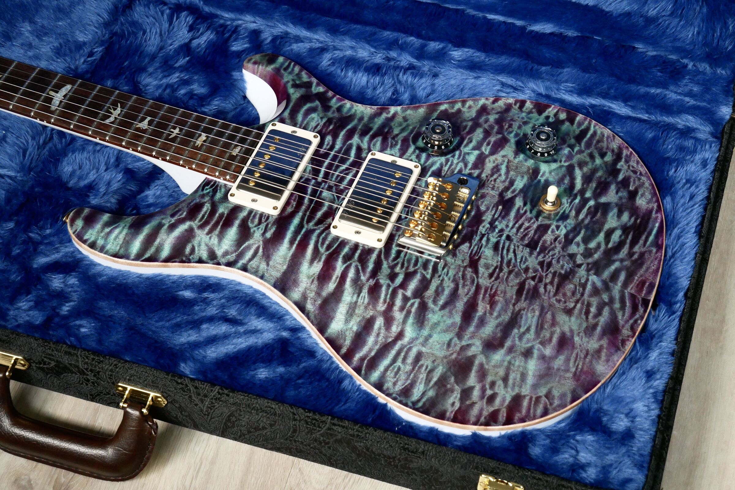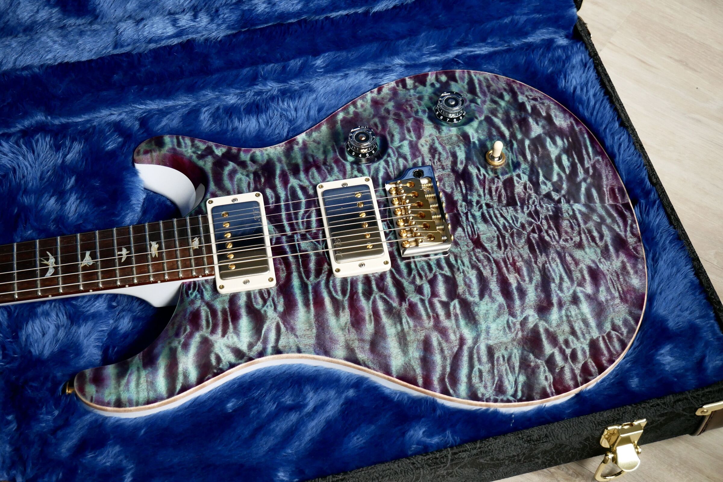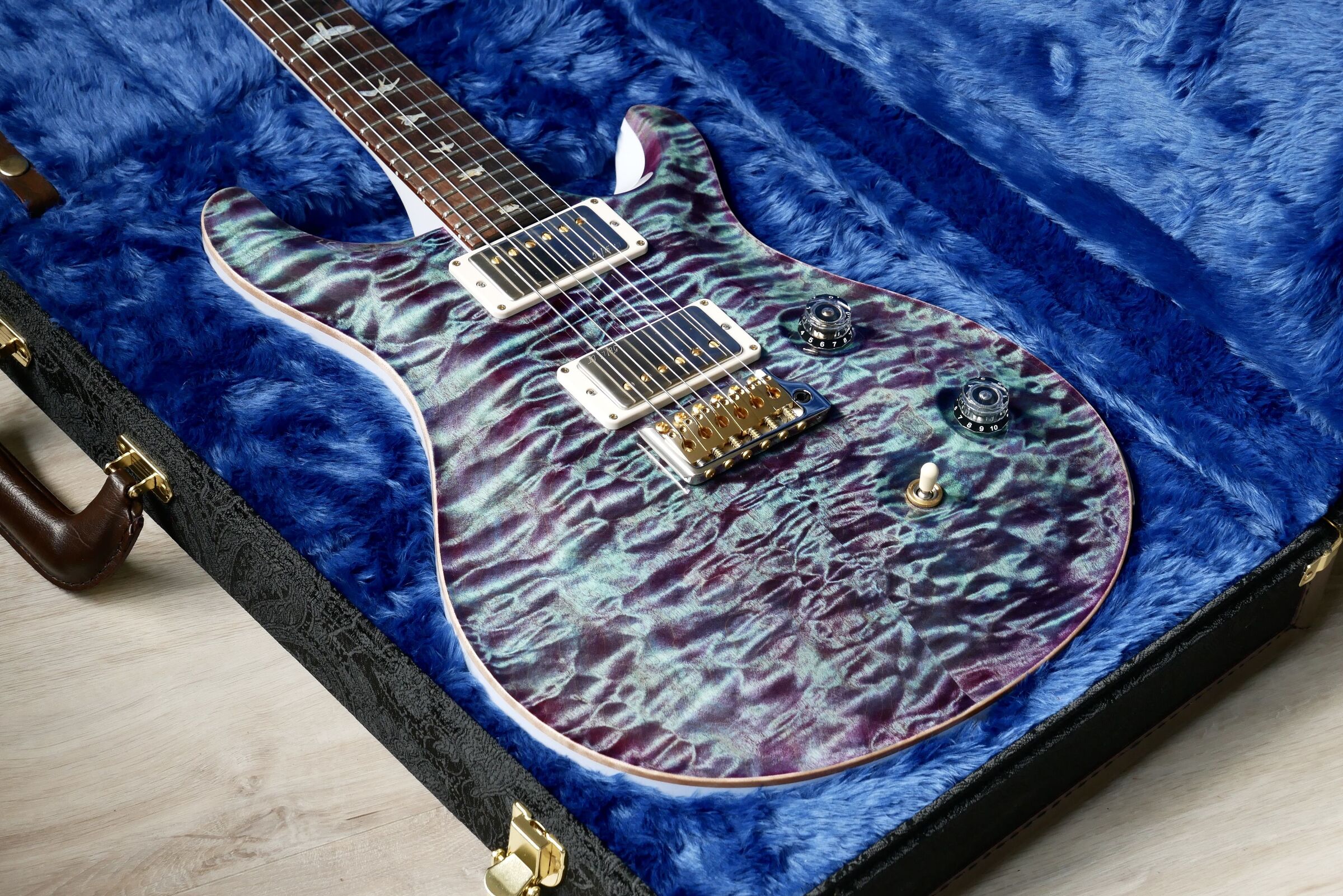 2025 PRS Custom 24 10Top Wood Library Violet Quilted with Brazilian Rosewood, featuring a stunning artist grade quilted maple top, and a Brazilian rosewood fretboard. This exclusive USA-only edition is custom built. Equipped with PRS 85/15 TCI pickups. The 2025 showroom guitar. Please note that this instrument was built in late 2024 and left the factory in January 2025, so the year shown on the back of the headstock differs from the actual shipping year. On the back edge of the body, the white finish shows a slightly faint discoloration as pictured, which is reflected in the price. Aside from that, the guitar is nearly brand new.