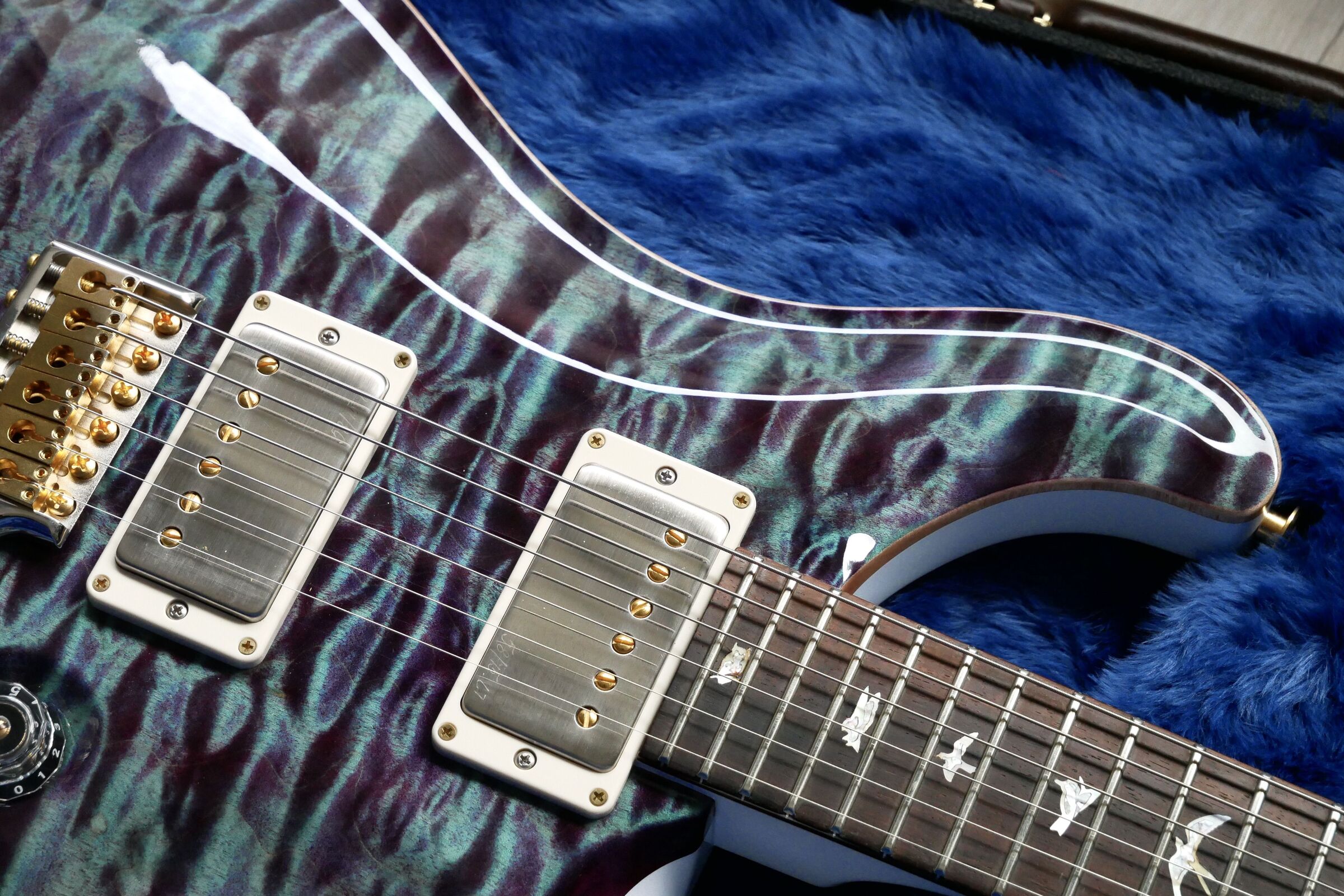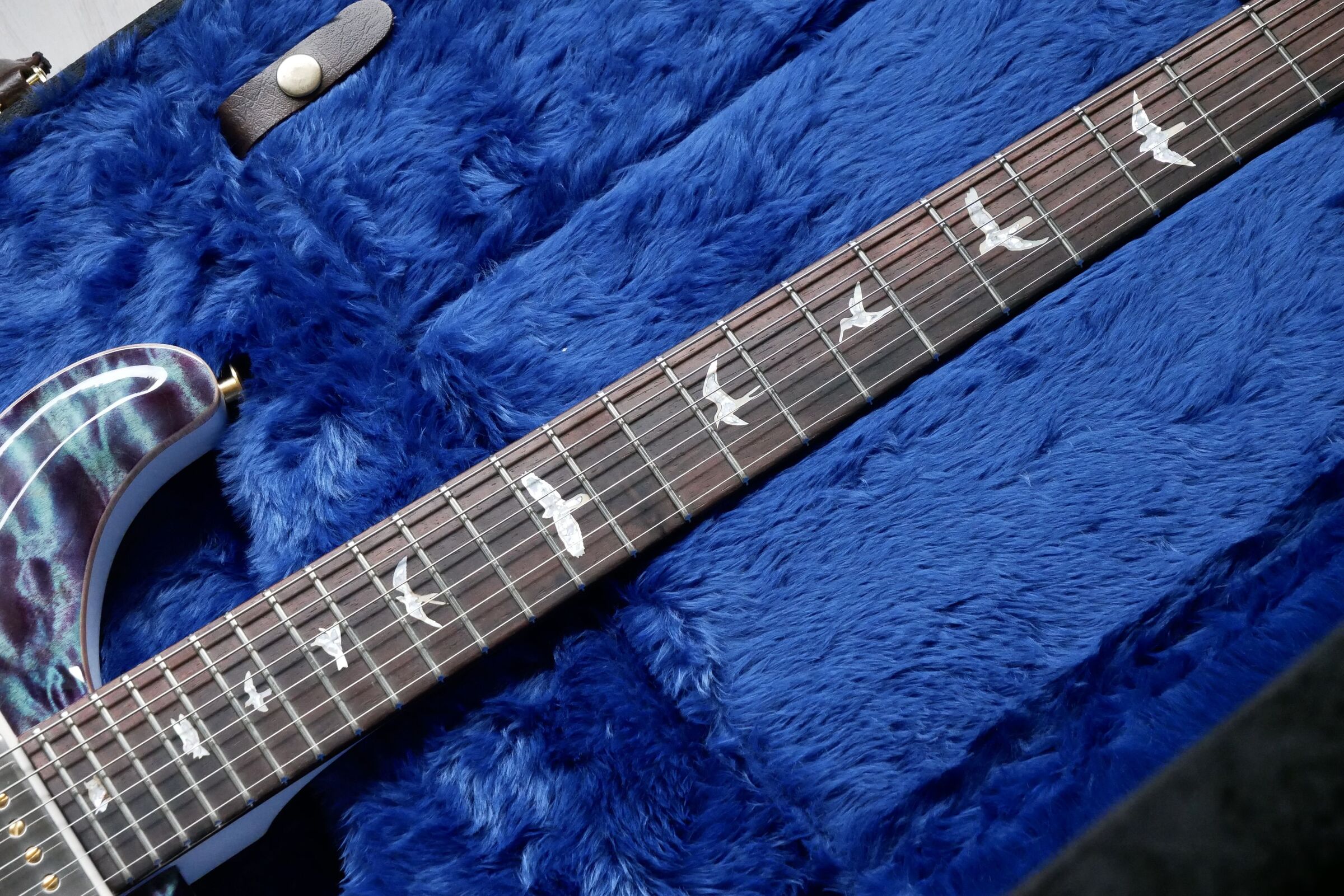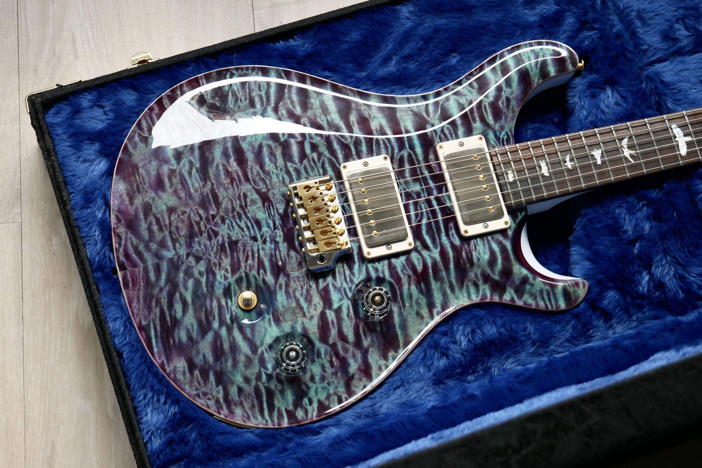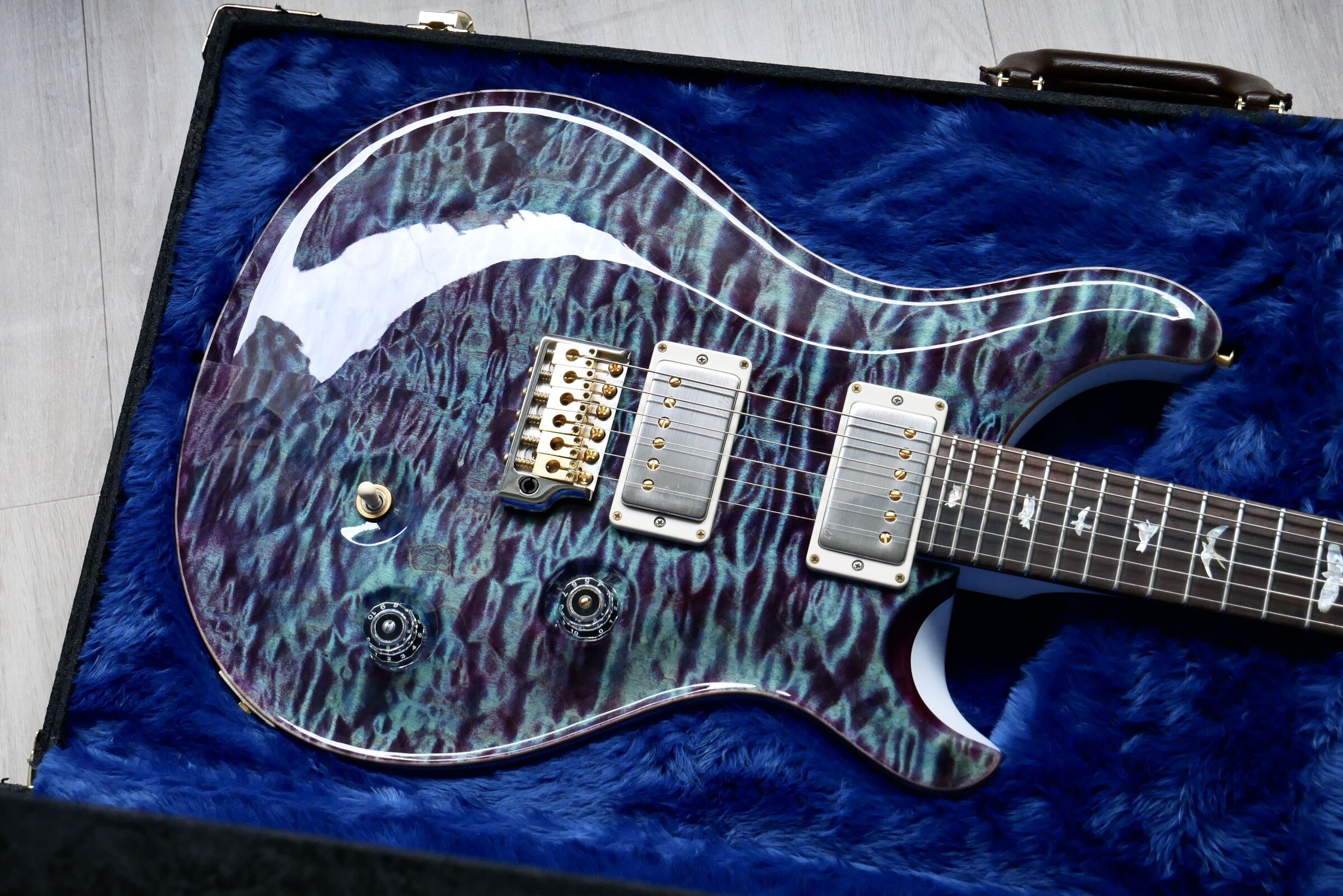 2025 PRS Custom 24 10Top Wood Library Violet Quilted with Brazilian Rosewood, featuring a stunning artist grade quilted maple top, and a Brazilian rosewood fretboard. This exclusive USA-only edition is custom built. Equipped with PRS 85/15 TCI pickups. The 2025 showroom guitar. Please note that this instrument was built in late 2024 and left the factory in January 2025, so the year shown on the back of the headstock differs from the actual shipping year. On the back edge of the body, the white finish shows a slightly faint discoloration as pictured, which is reflected in the price. Aside from that, the guitar is nearly brand new.