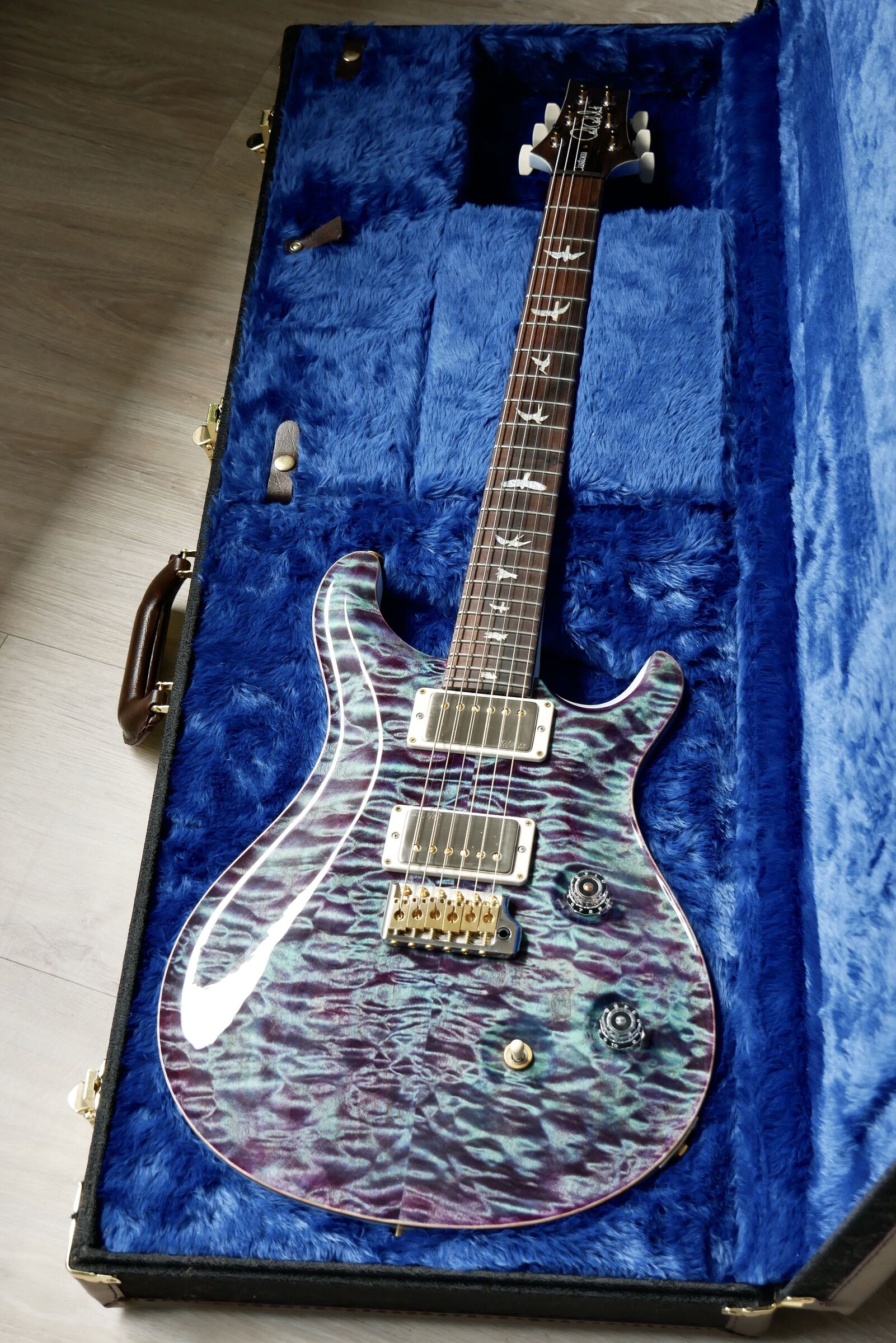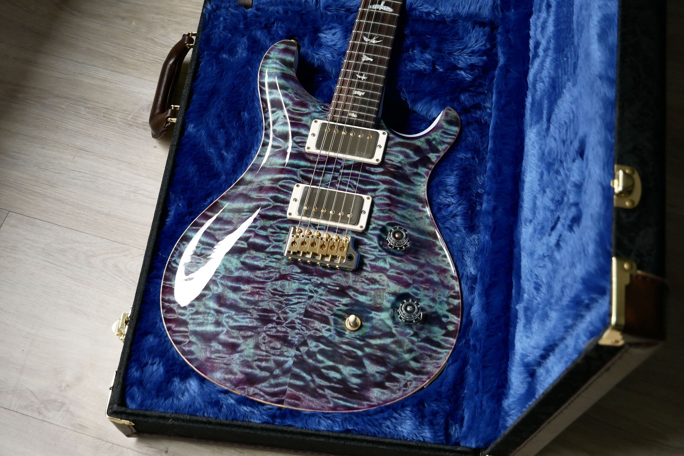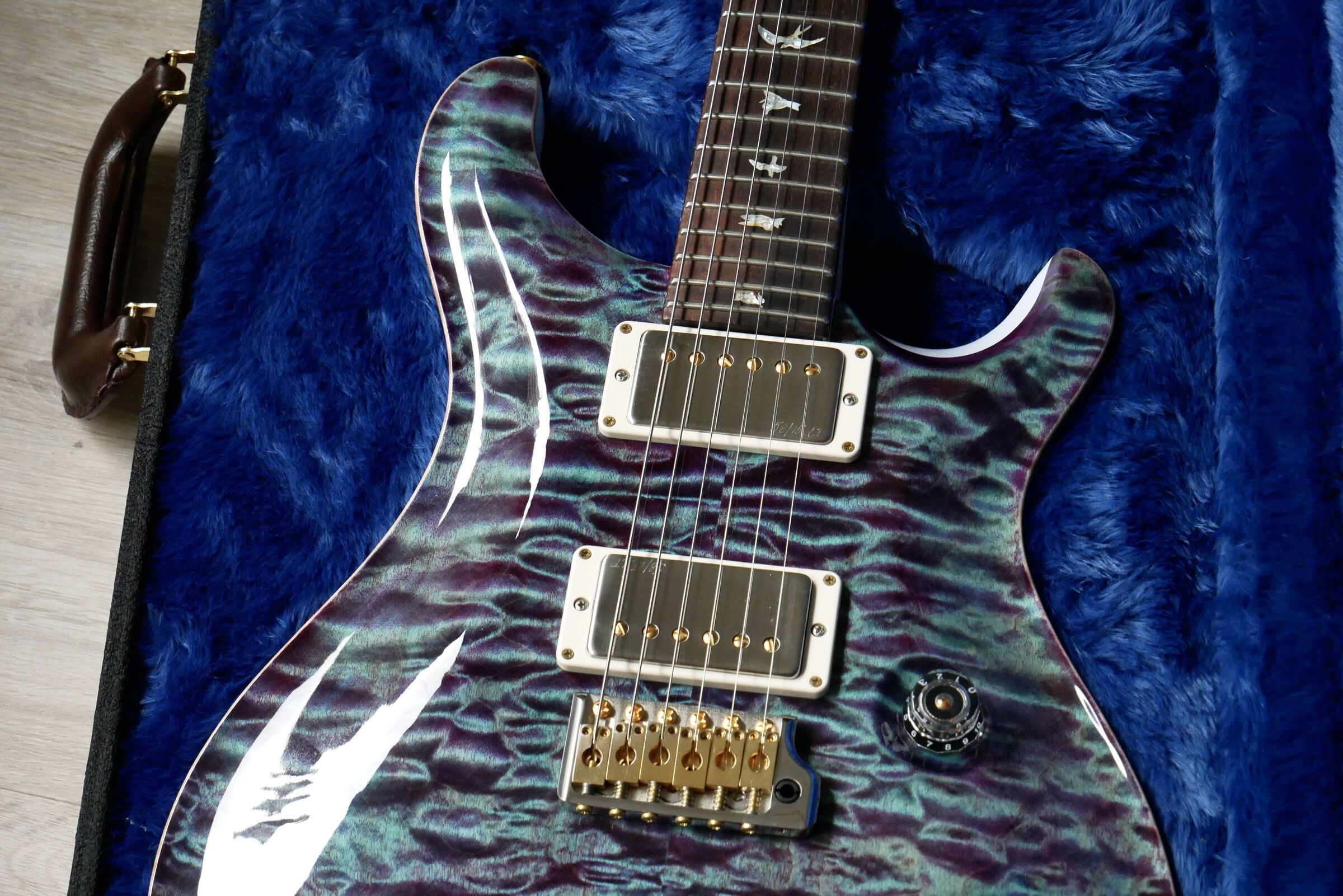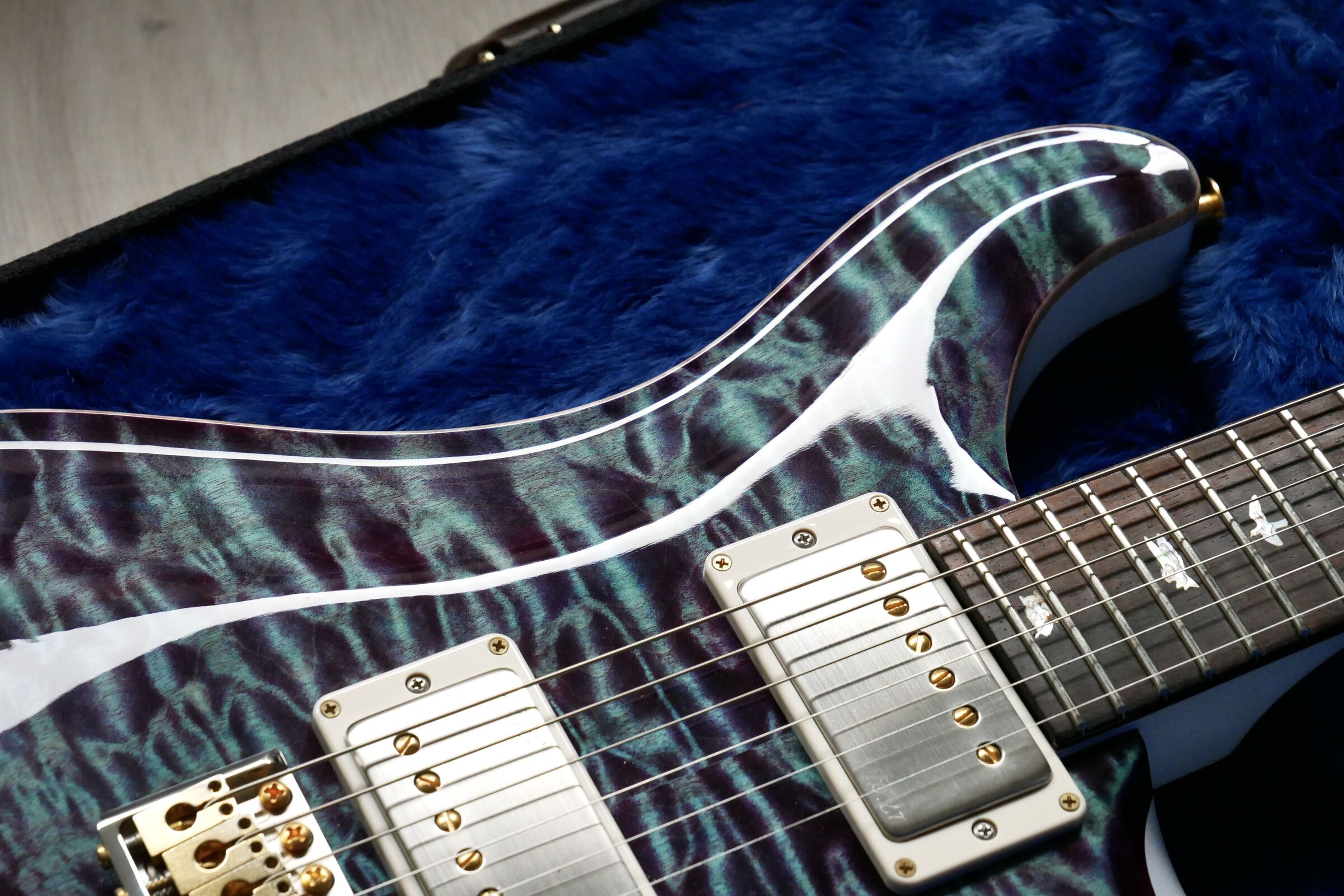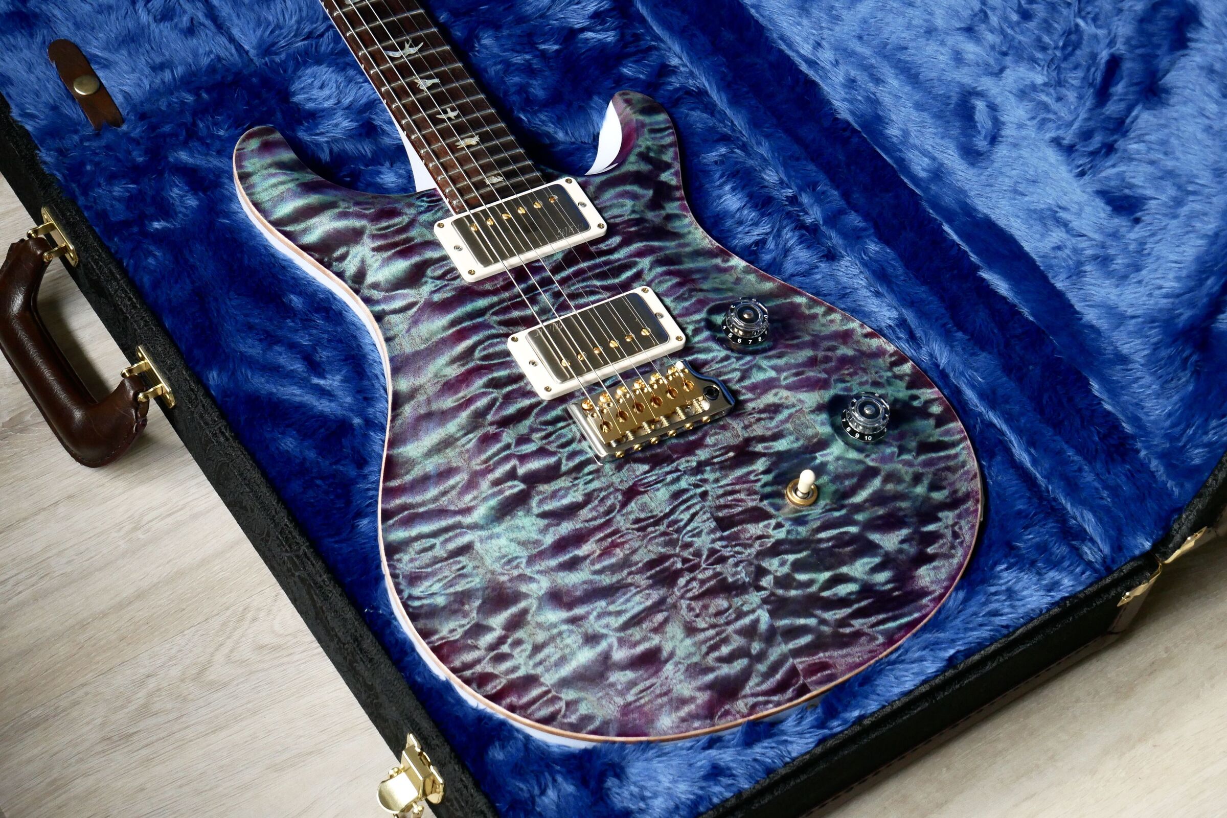 2025 PRS Custom 24 10Top Wood Library Violet Quilted with Brazilian Rosewood, featuring a stunning artist grade quilted maple top, and a Brazilian rosewood fretboard. This exclusive USA-only edition is custom built. Equipped with PRS 85/15 TCI pickups. The 2025 showroom guitar. Please note that this instrument was built in late 2024 and left the factory in January 2025, so the year shown on the back of the headstock differs from the actual shipping year. On the back edge of the body, the white finish shows a slightly faint discoloration as pictured, which is reflected in the price. Aside from that, the guitar is nearly brand new.
