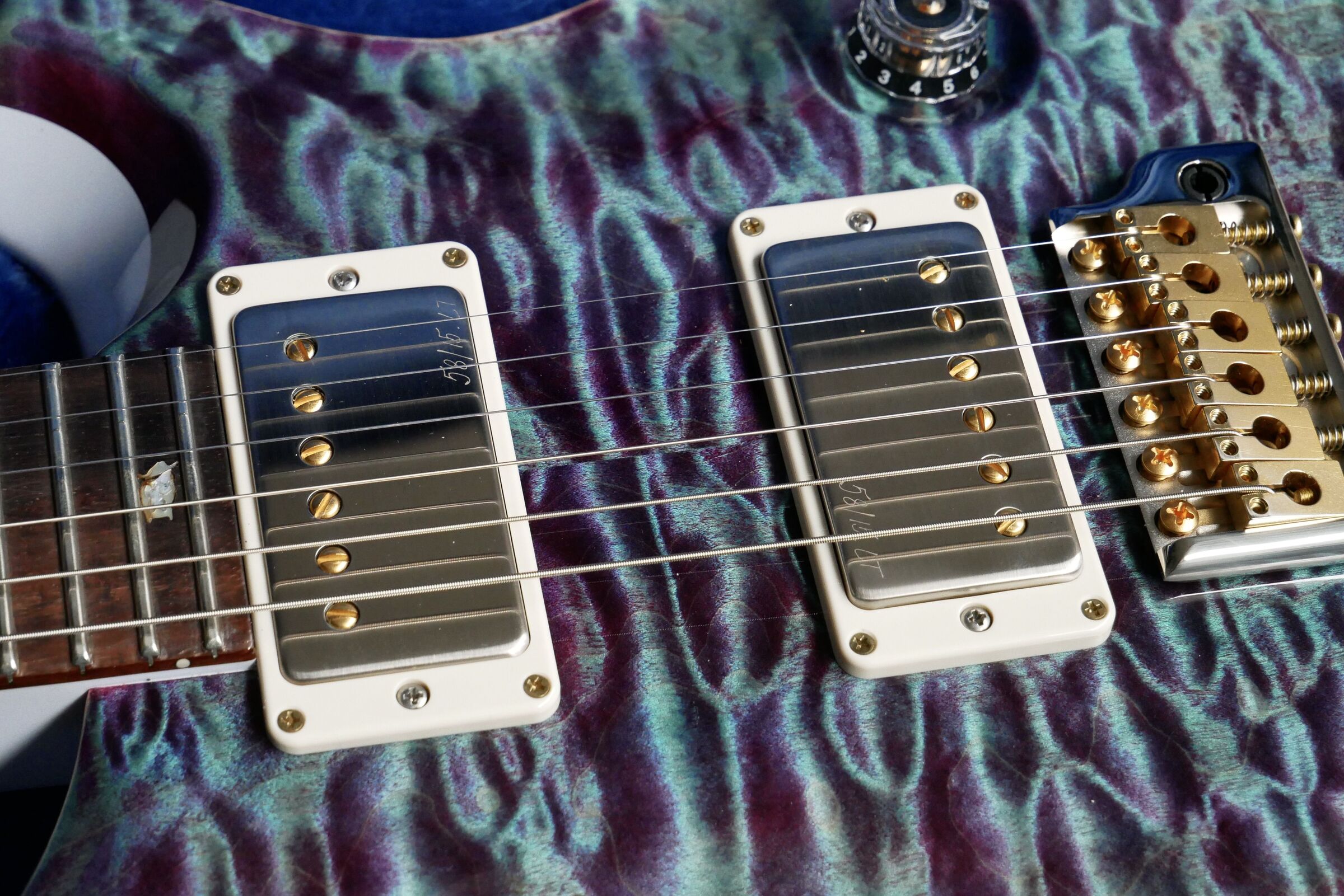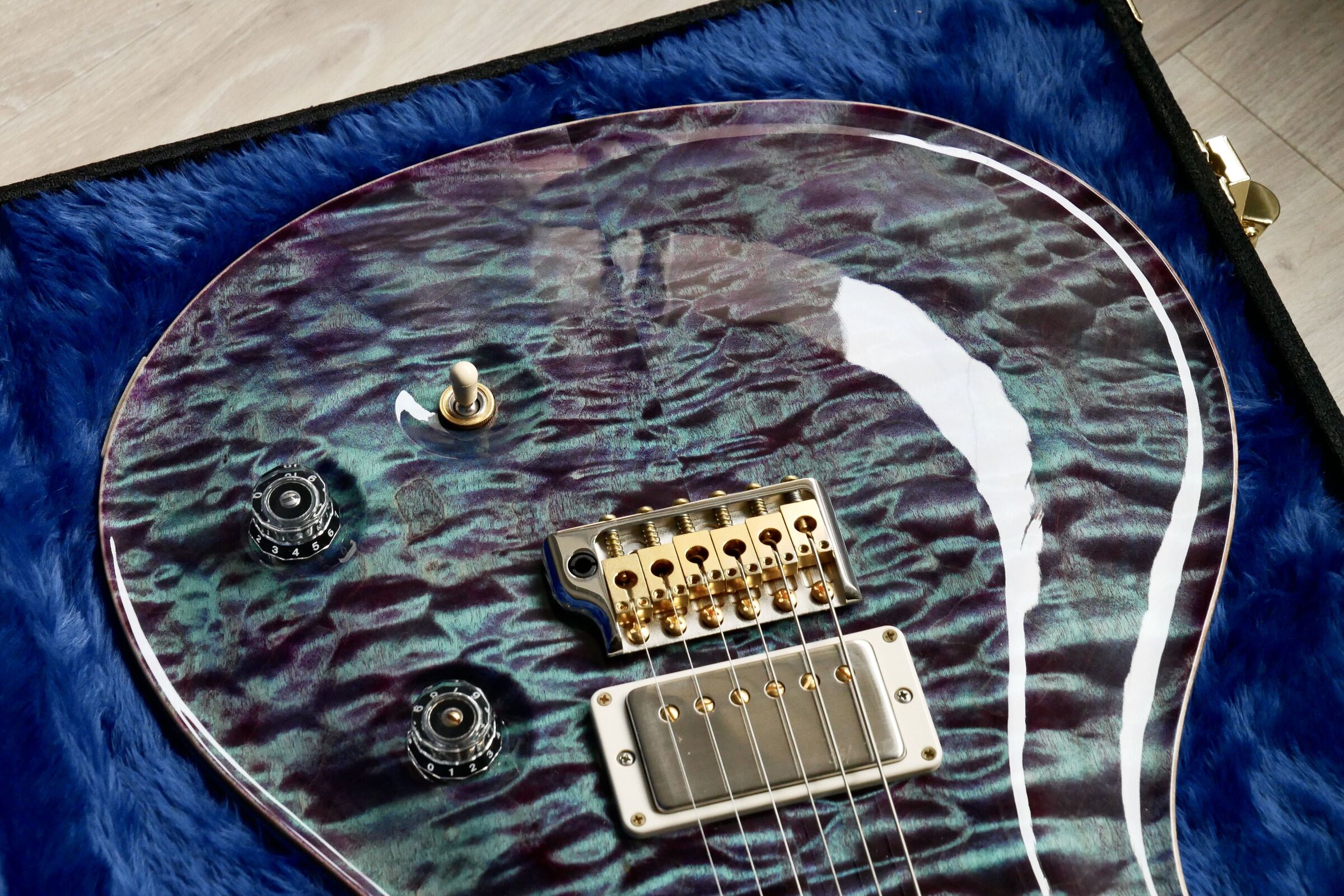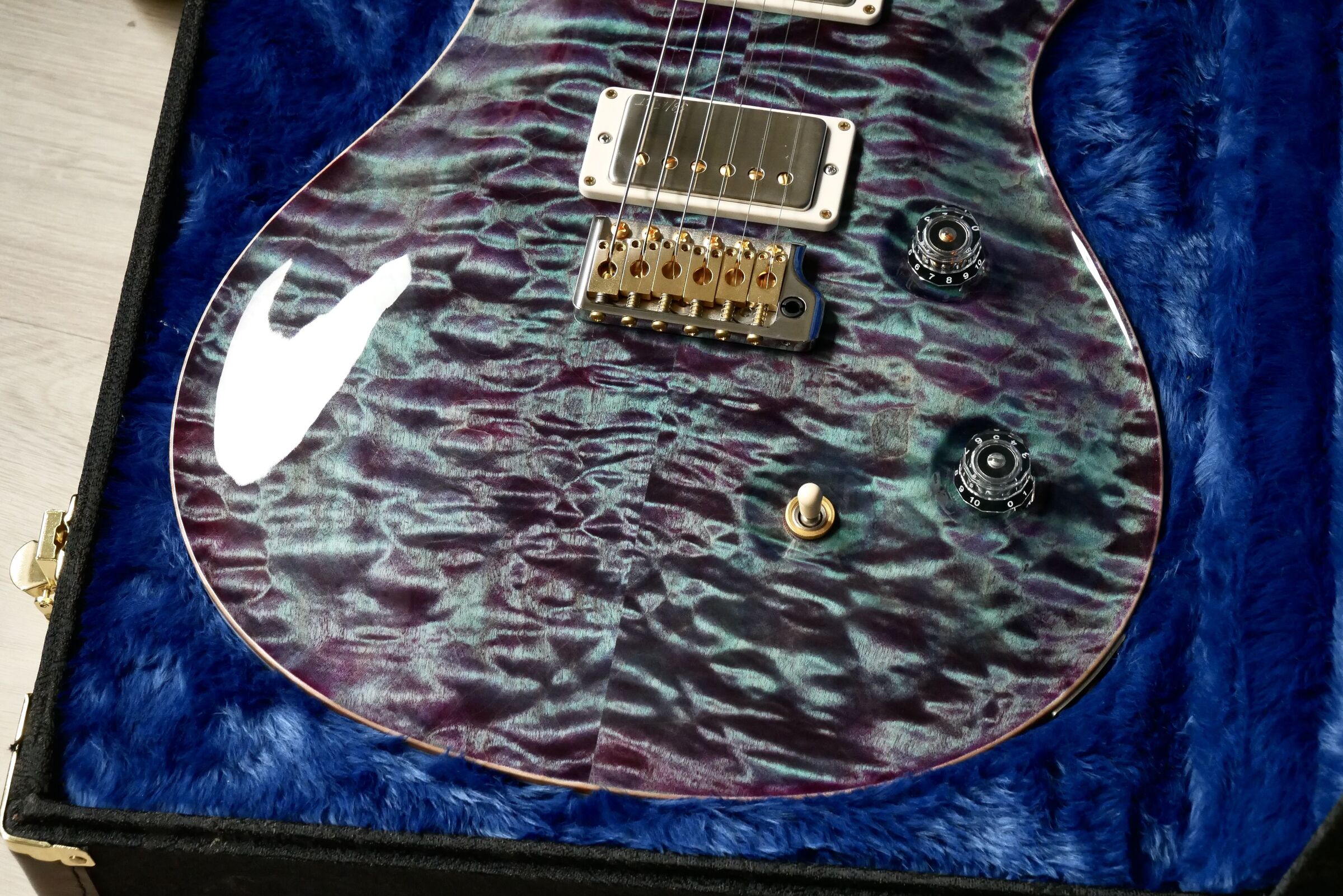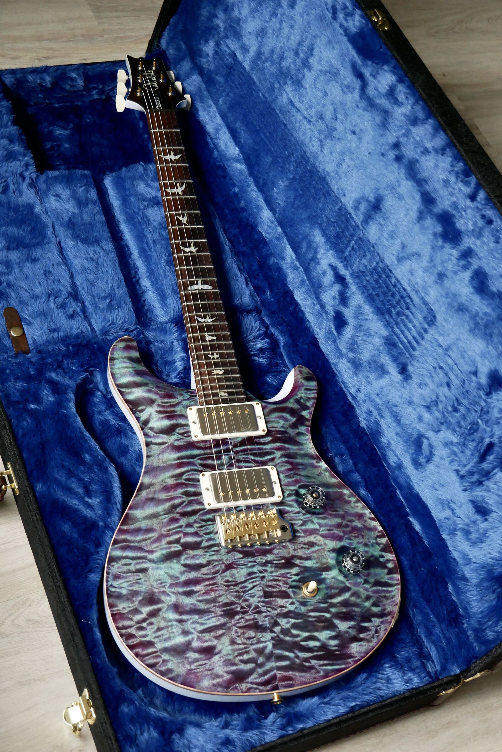 2025 PRS Custom 24 10Top Wood Library Violet Quilted with Brazilian Rosewood, featuring a stunning artist grade quilted maple top, and a Brazilian rosewood fretboard. This exclusive USA-only edition is custom built. Equipped with PRS 85/15 TCI pickups. The 2025 showroom guitar. Please note that this instrument was built in late 2024 and left the factory in January 2025, so the year shown on the back of the headstock differs from the actual shipping year. On the back edge of the body, the white finish shows a slightly faint discoloration as pictured, which is reflected in the price. Aside from that, the guitar is nearly brand new.