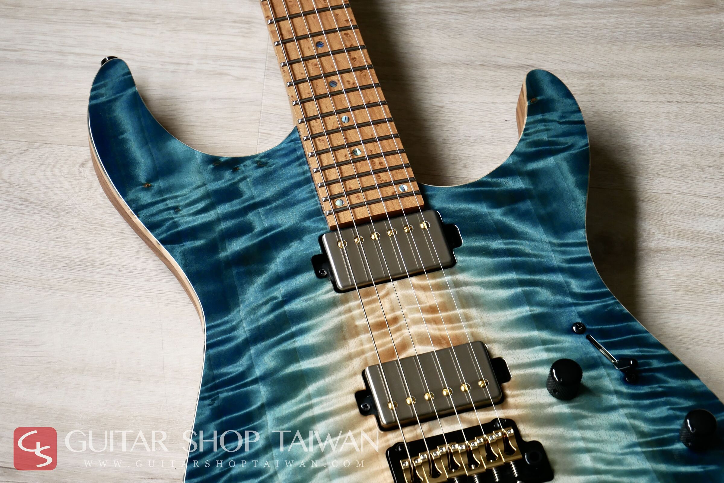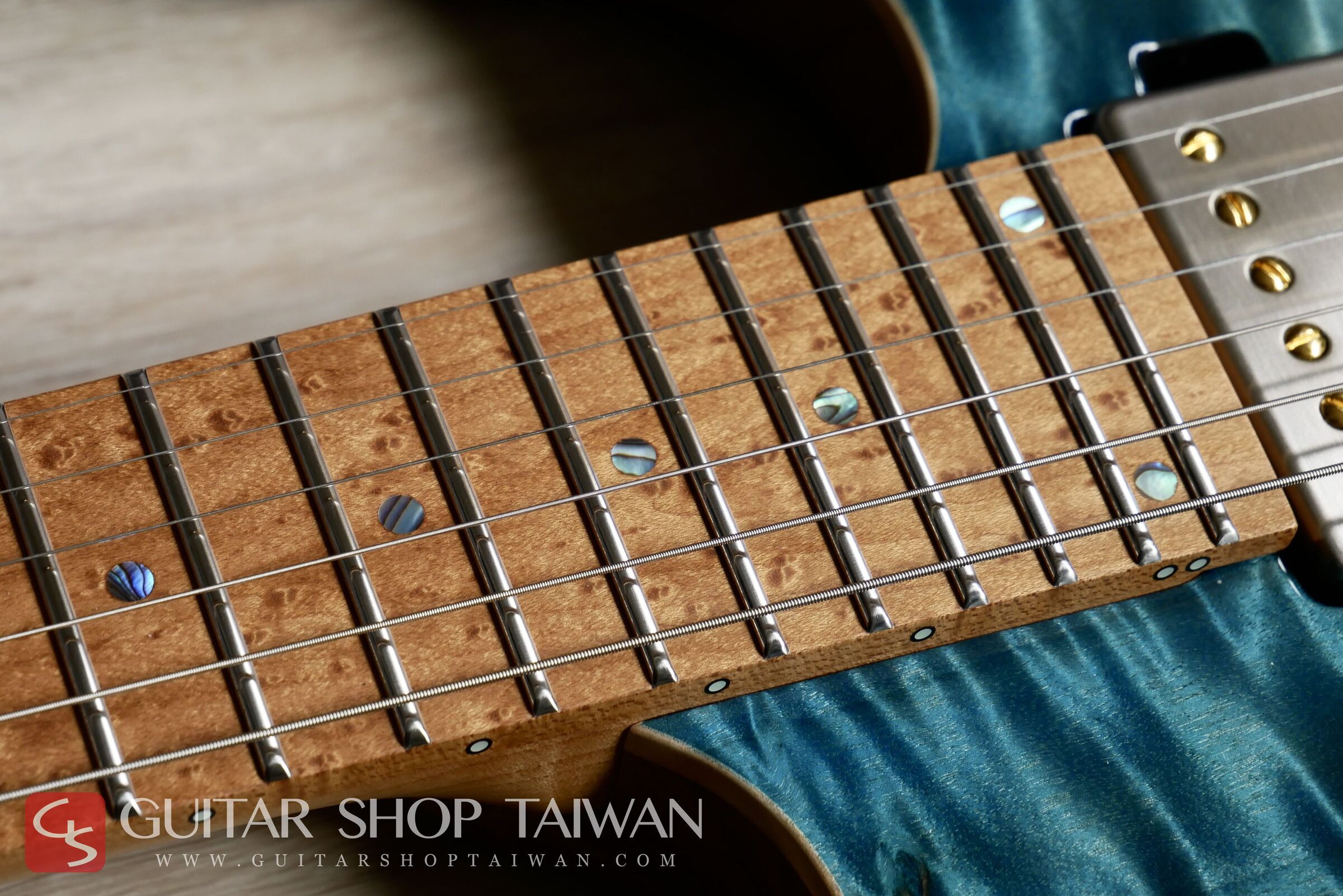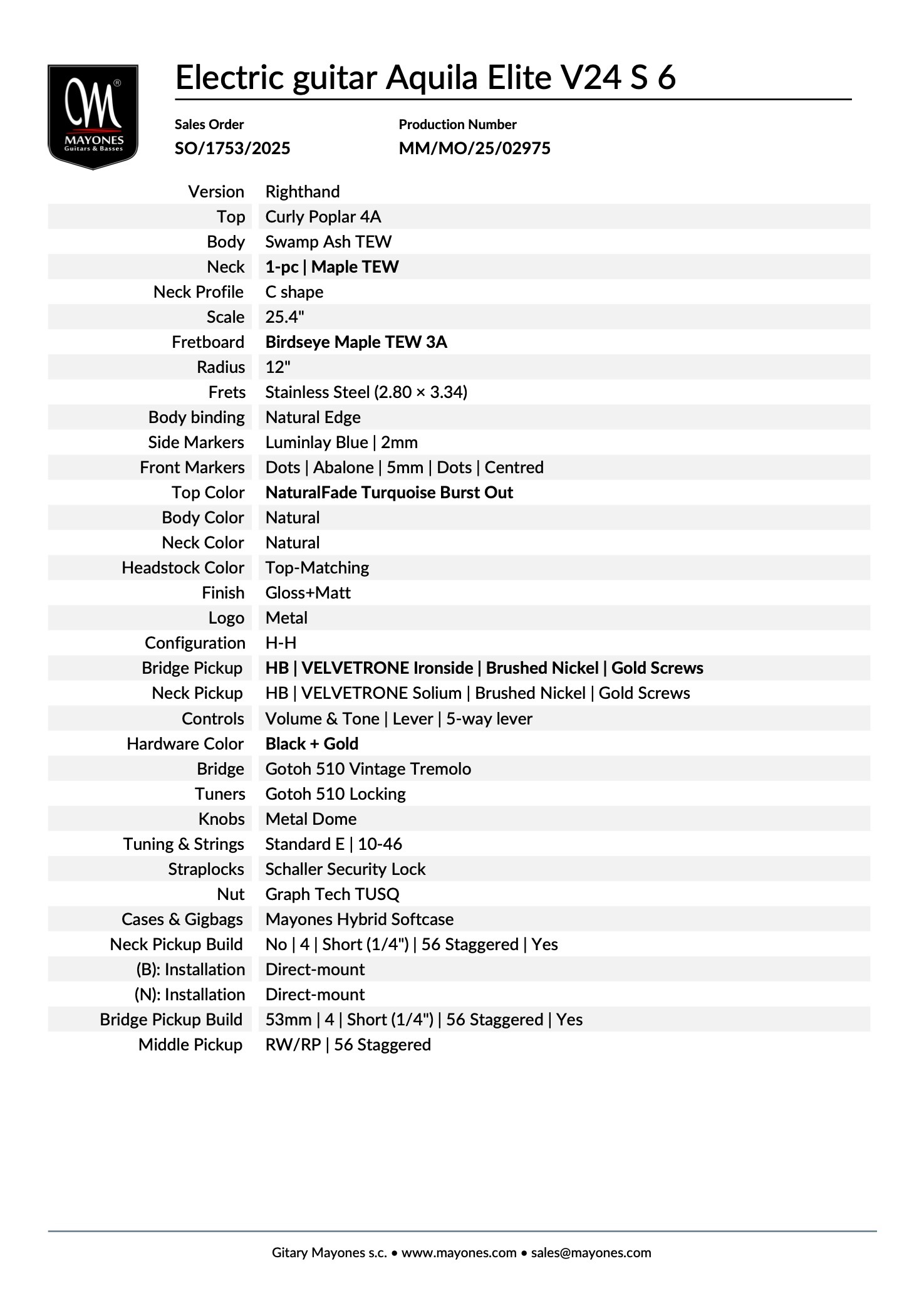 全新 Mayones Aquila Elite V24 S 6-Natural Fade Turquoise Burst Out 4A Curly Poplar Top