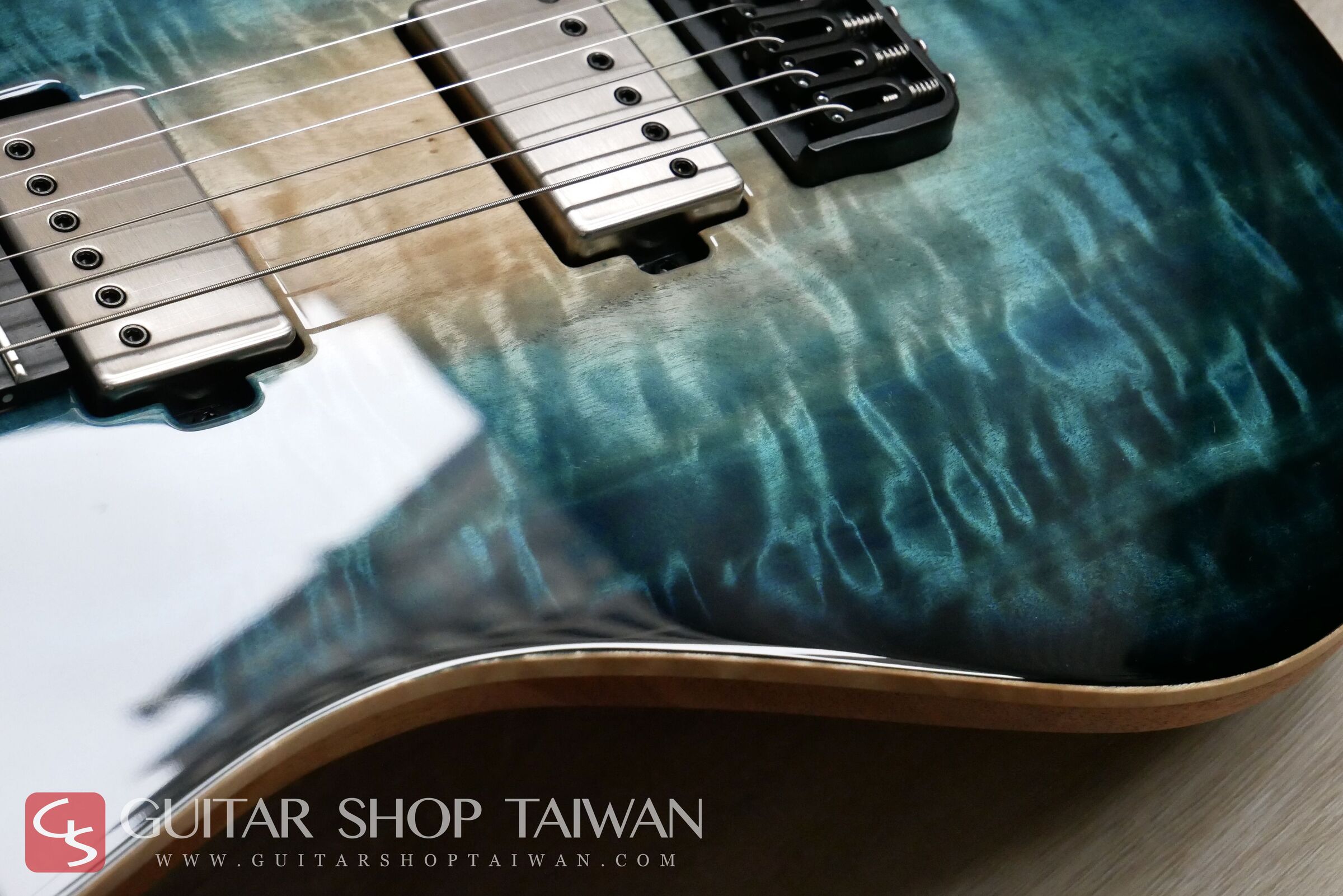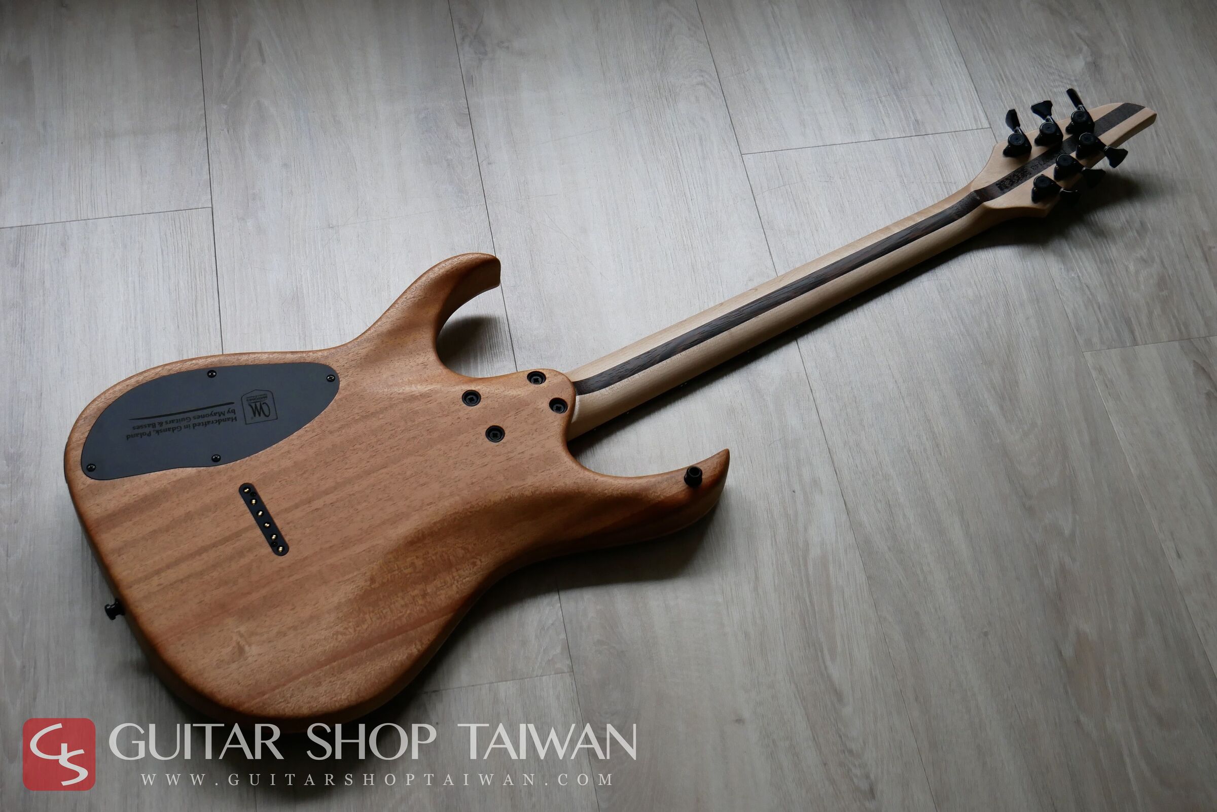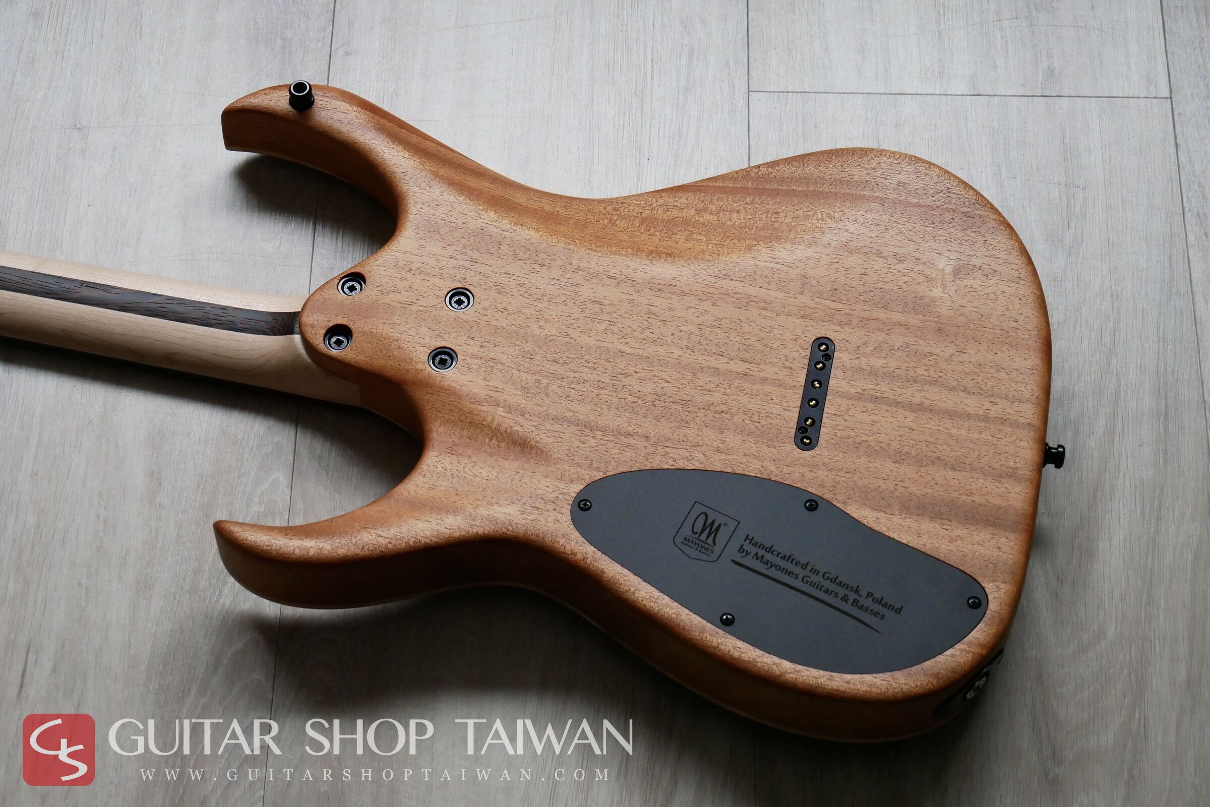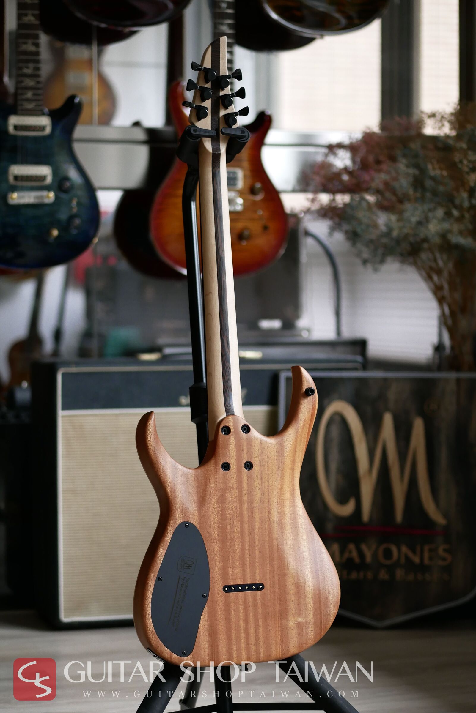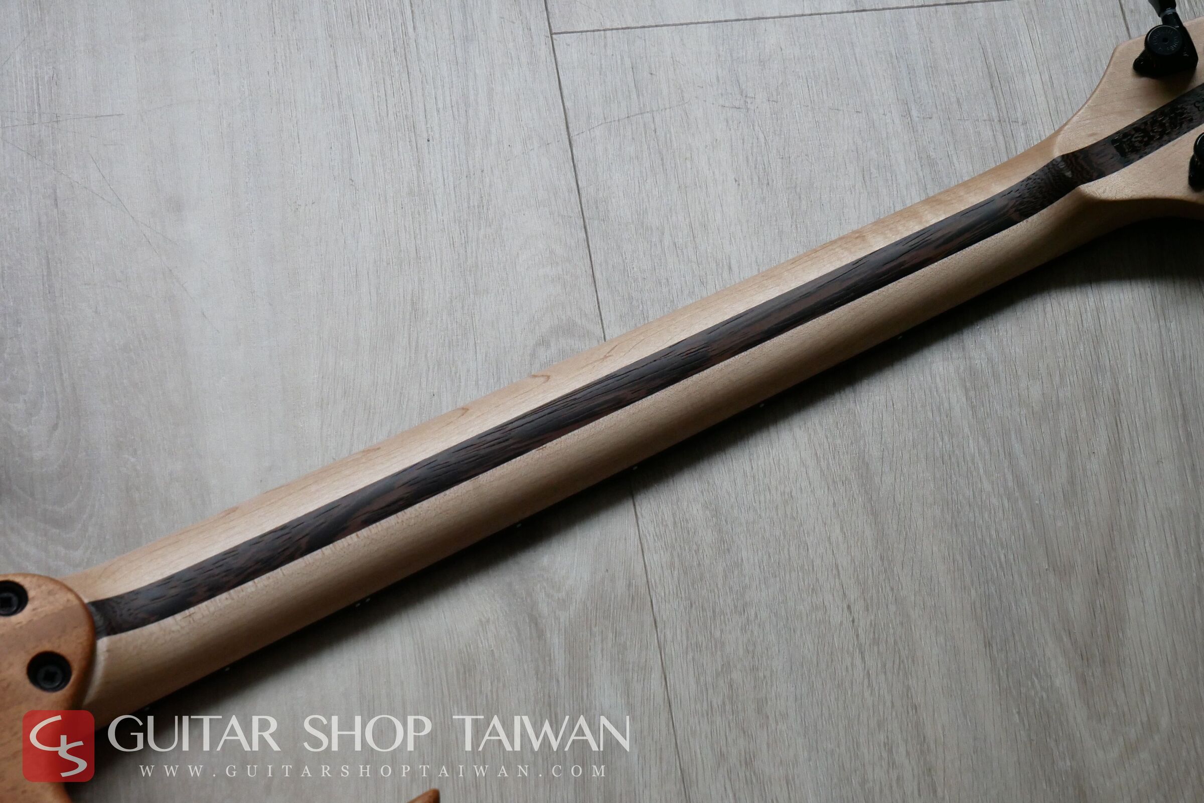 琴面採用嚴選3A級Curly Poplar,搭配桃花心木琴身,標誌性的3-ply Maple-Wenge D Shape琴頸,選用16” Radius弧度的黑檀木指板,這是Mayones最被推崇的配置之一,透過三層木材交錯排列,抵消了單塊木頭可能產生的內應力,而琴頸內部除了有Truss Rod以外,更嵌入兩根碳纖維桿補強。這種設計比傳統琴頸更加穩定,極大地減少了因溫濕度變化而導致彎曲或扭曲的風險。琴頸與琴背皆採用Matt Finish無上漆處理,觸感溫順自然。