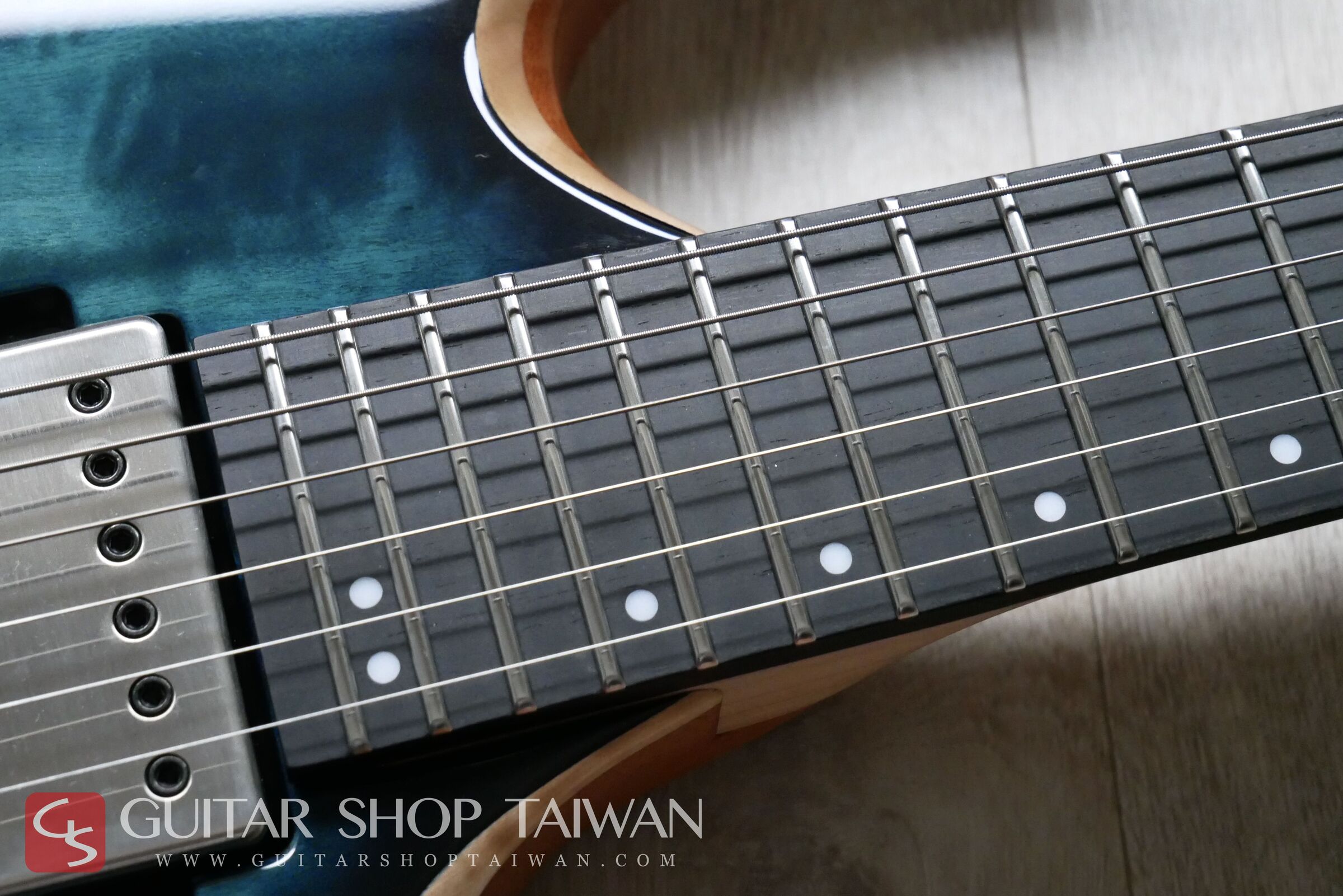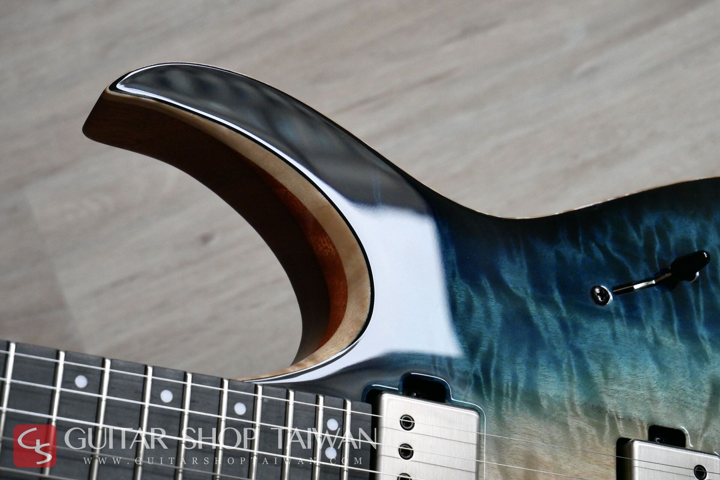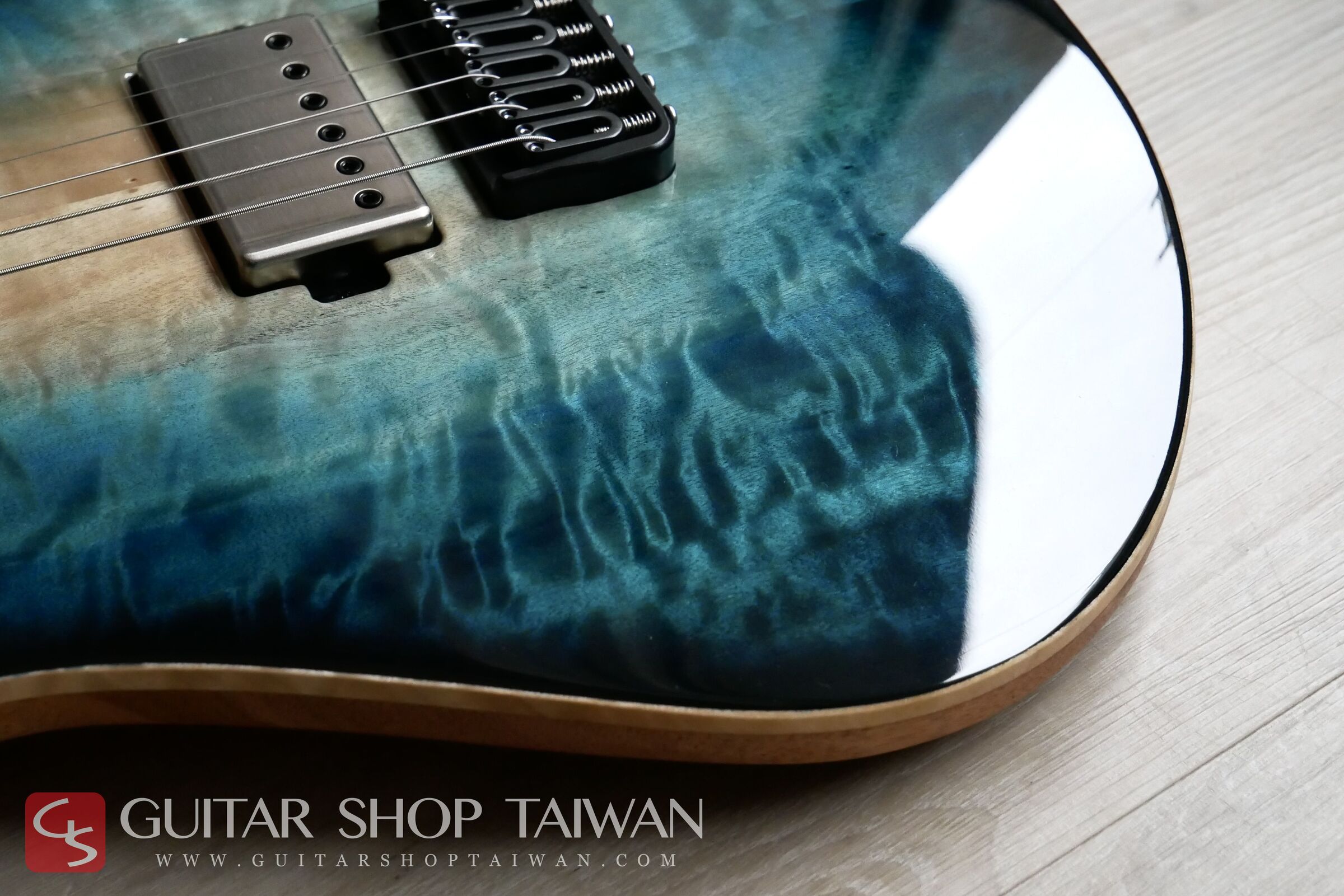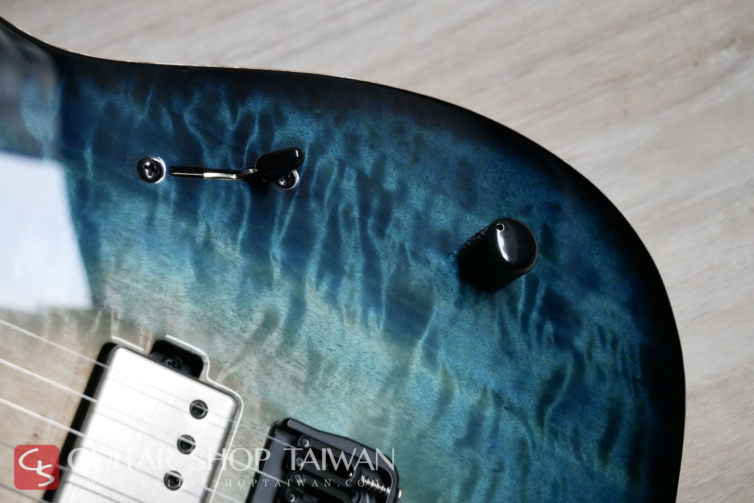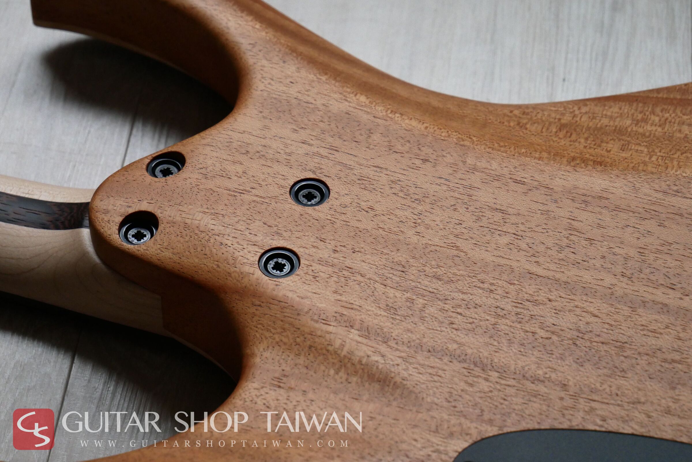 琴面採用嚴選3A級Curly Poplar,搭配桃花心木琴身,標誌性的3-ply Maple-Wenge D Shape琴頸,選用16” Radius弧度的黑檀木指板,這是Mayones最被推崇的配置之一,透過三層木材交錯排列,抵消了單塊木頭可能產生的內應力,而琴頸內部除了有Truss Rod以外,更嵌入兩根碳纖維桿補強。這種設計比傳統琴頸更加穩定,極大地減少了因溫濕度變化而導致彎曲或扭曲的風險。琴頸與琴背皆採用Matt Finish無上漆處理,觸感溫順自然。