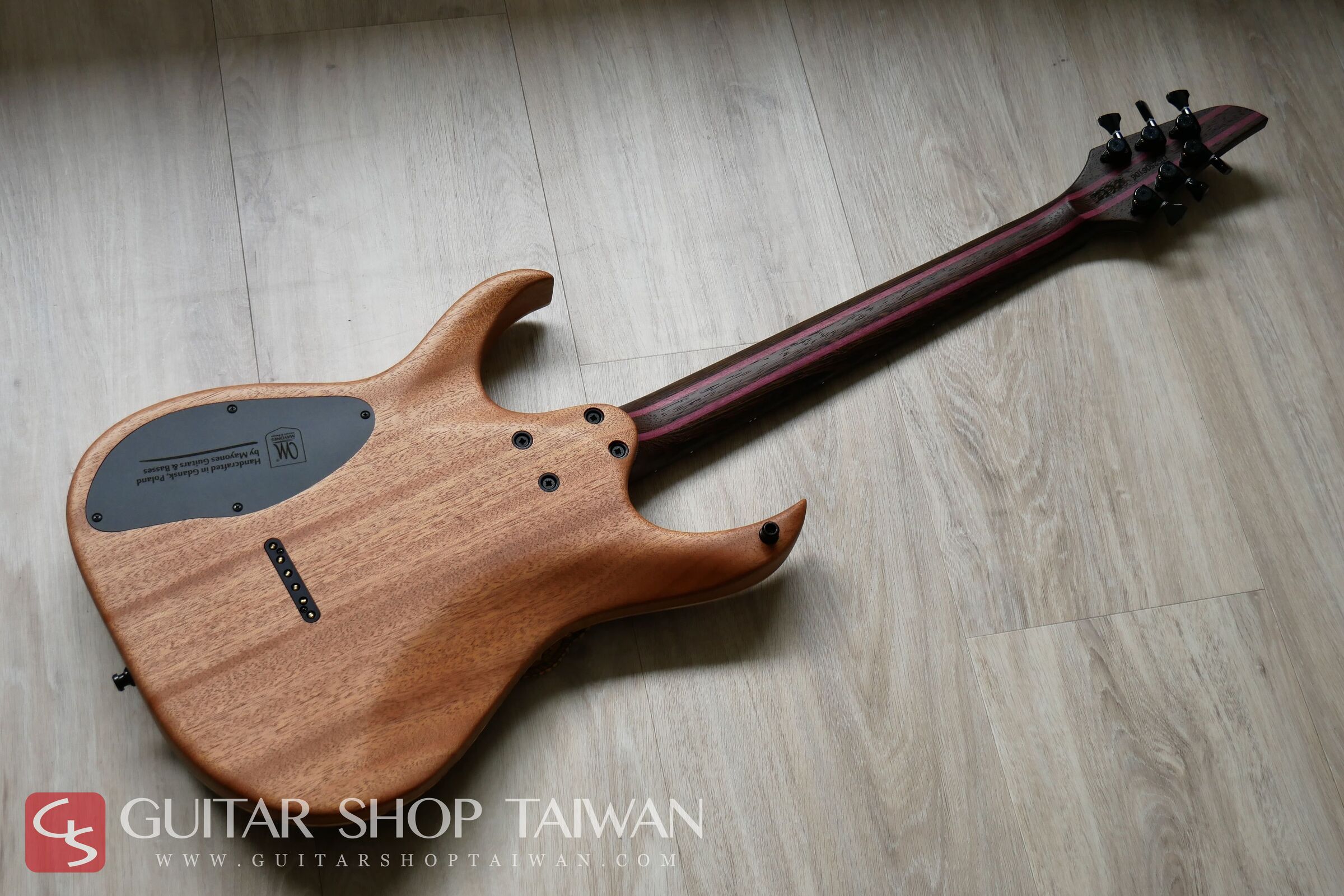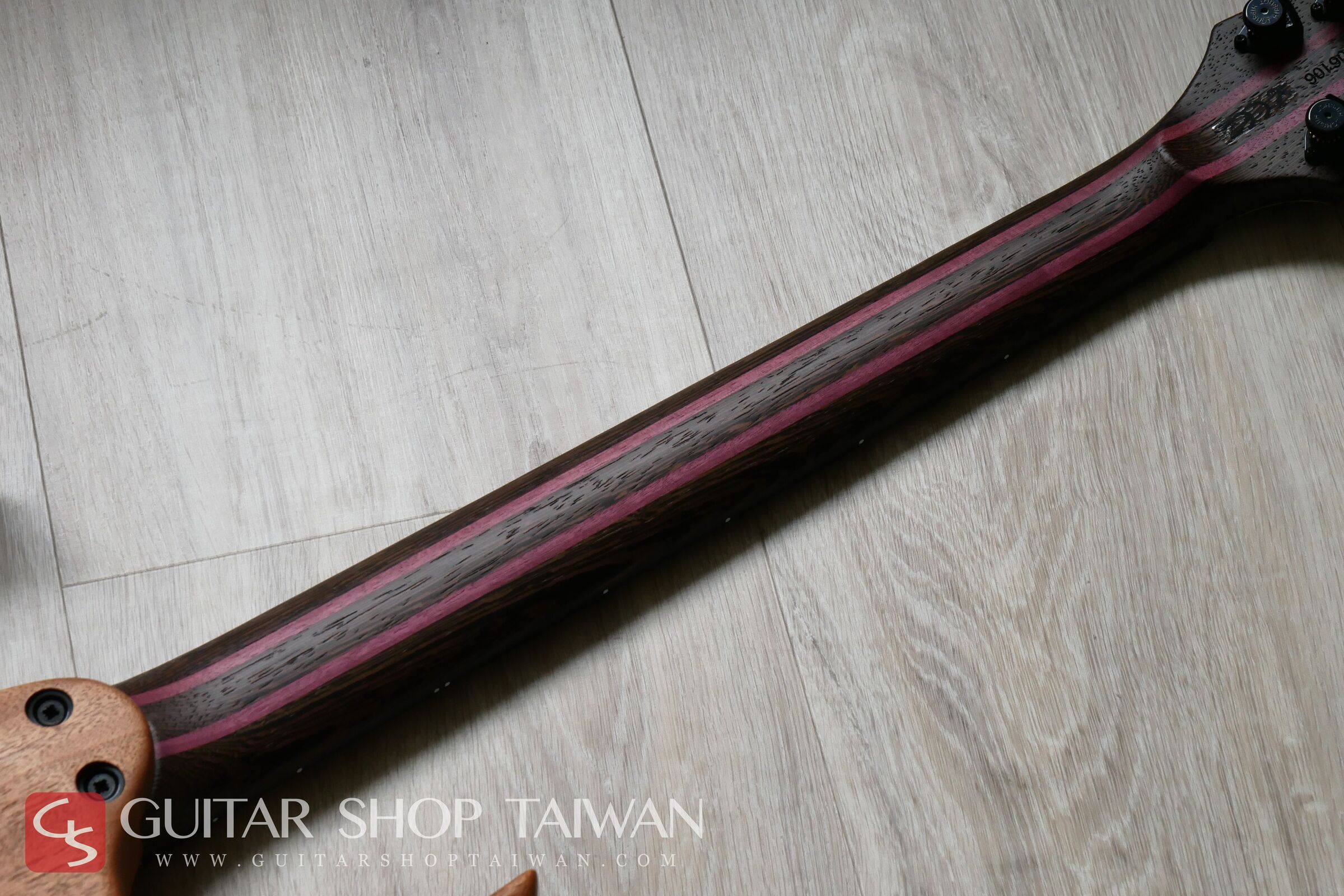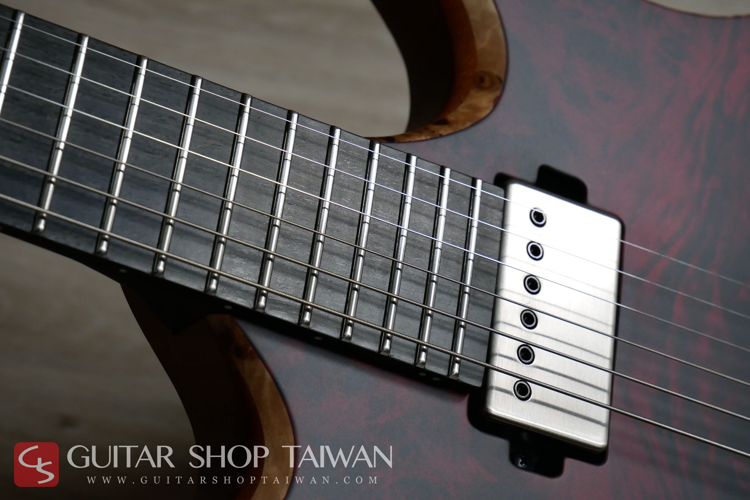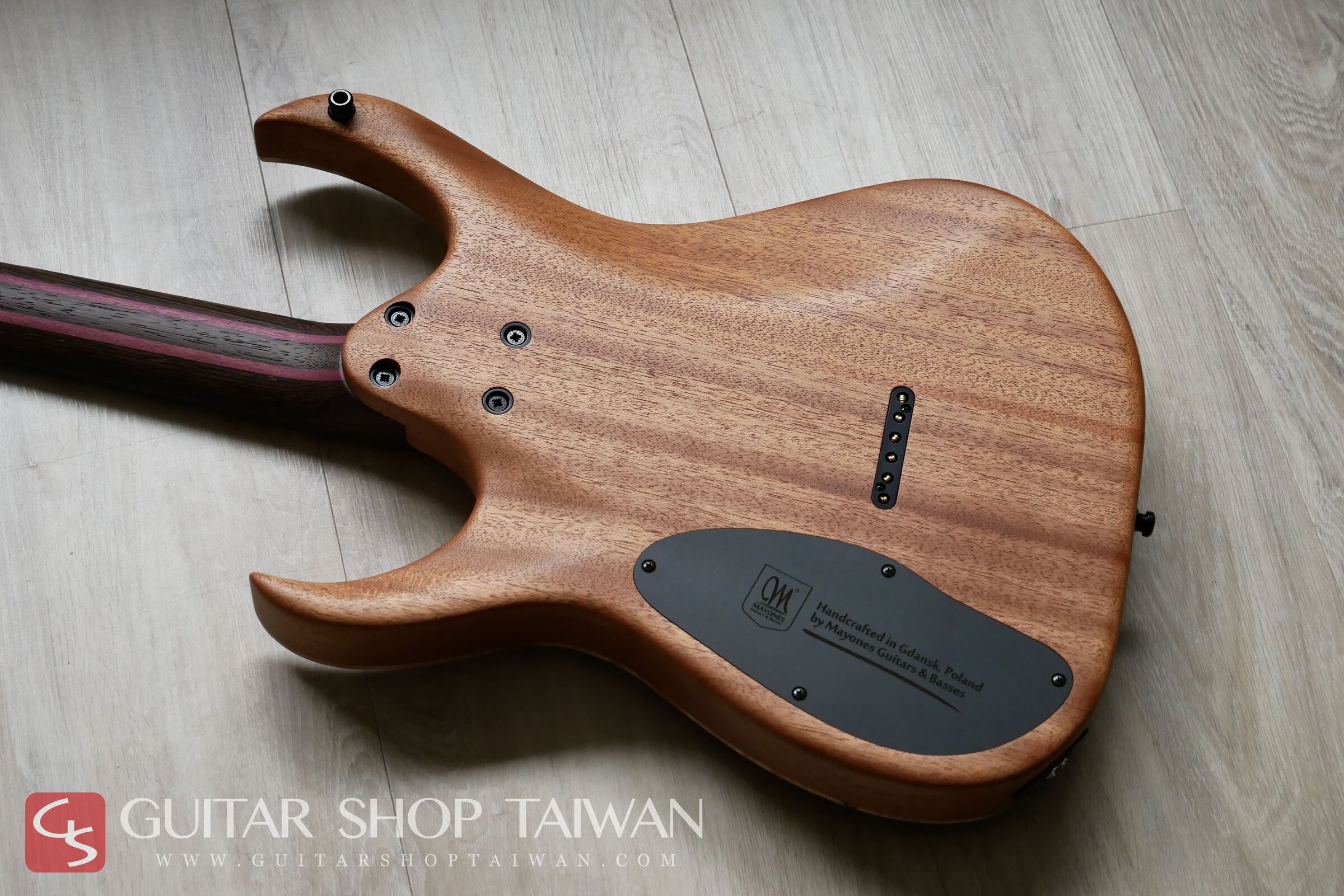 琴面採用嚴選3A級Eye Poplar,搭配桃花心木琴身,標誌性的5-ply Wenge Purpleheart D Shape琴頸,選用16” Radius弧度的黑檀木指板,這是Mayones最被推崇的配置之一,透過五層木材交錯排列,抵消了單塊木頭可能產生的內應力,琴頸內部除了有Truss Rod以外,更嵌入兩根碳纖維桿補強。這種設計比傳統琴頸更加穩定,極大地減少了因溫濕度變化而導致彎曲或扭曲的風險。整把琴皆採用Matt Finish無上漆處理,觸感溫順自然。