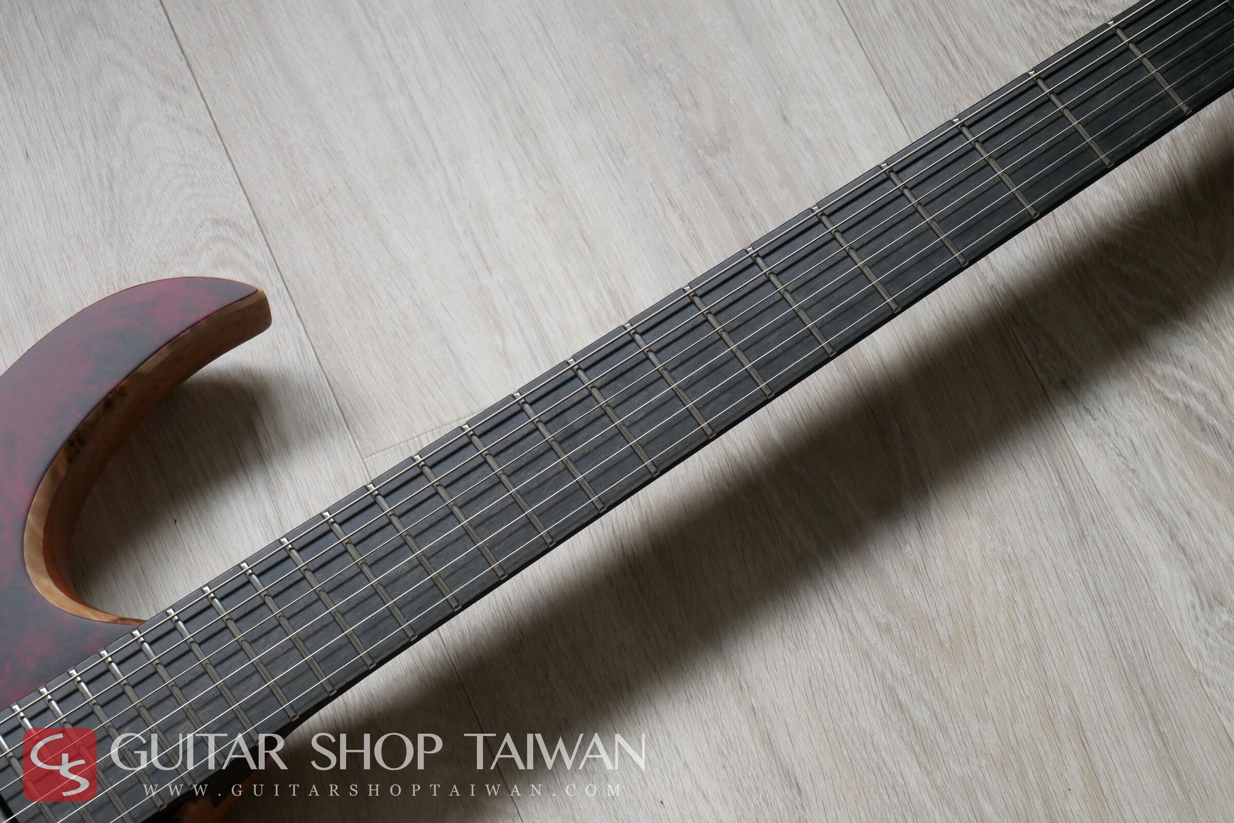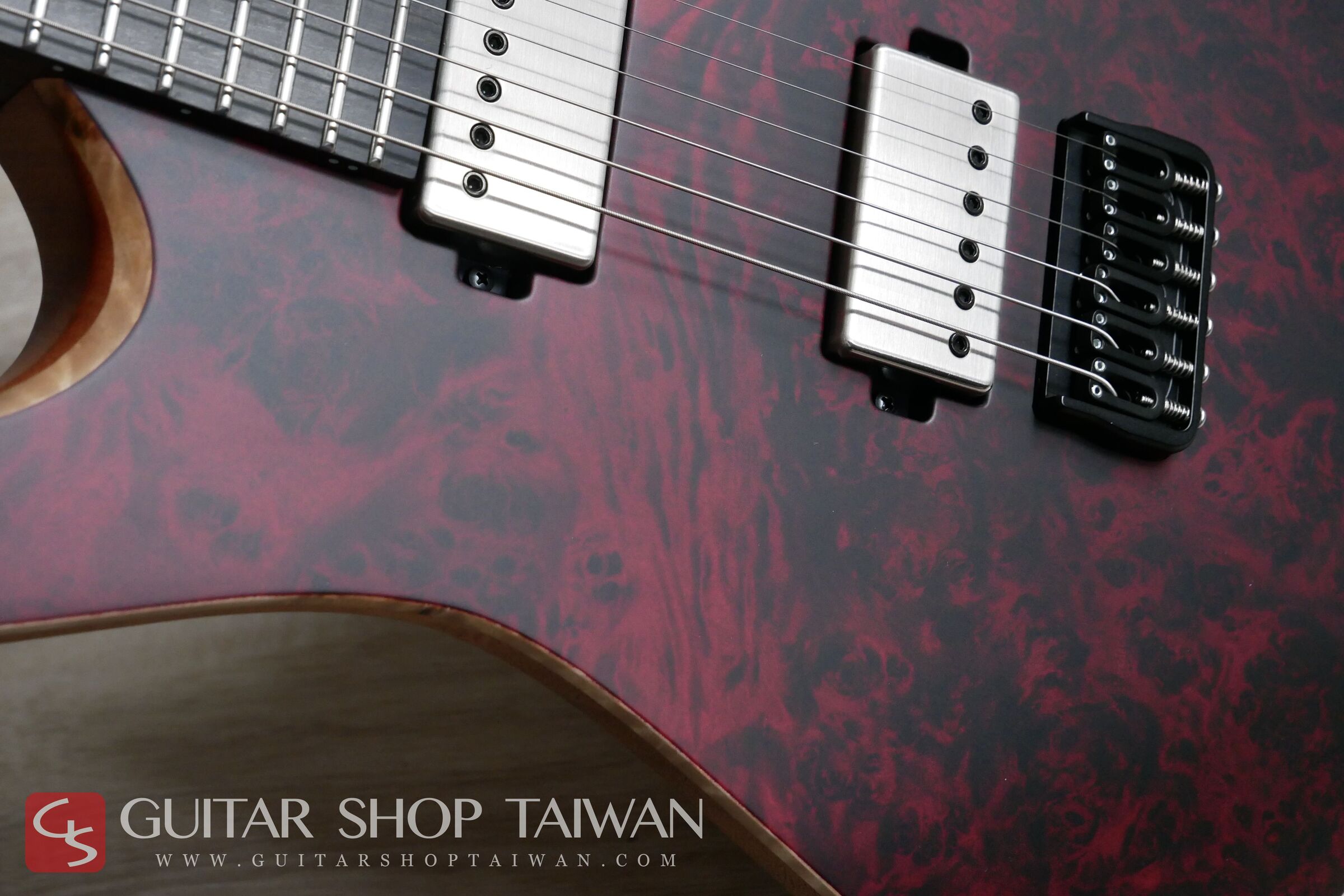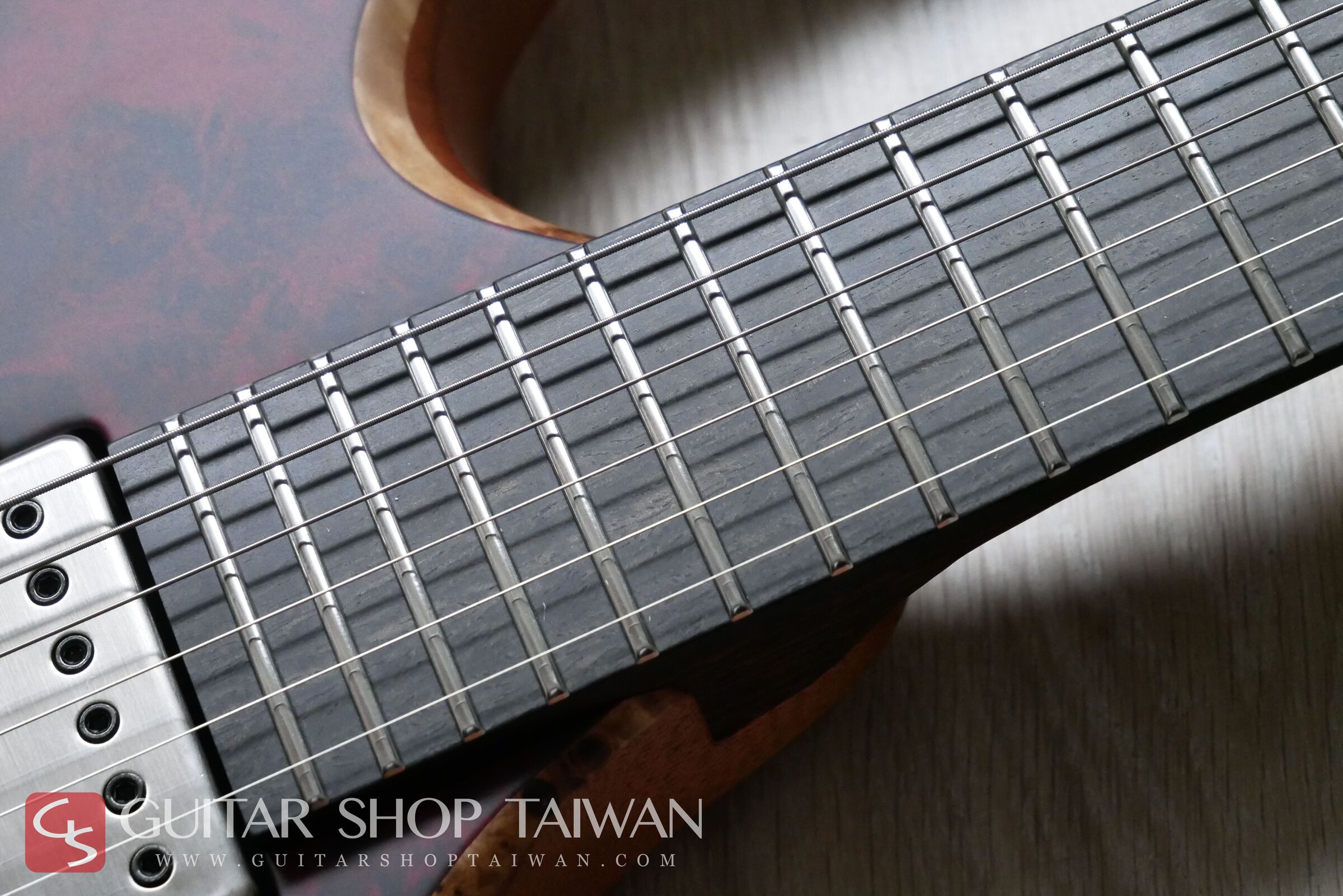 琴面採用嚴選3A級Eye Poplar,搭配桃花心木琴身,標誌性的5-ply Wenge Purpleheart D Shape琴頸,選用16” Radius弧度的黑檀木指板,這是Mayones最被推崇的配置之一,透過五層木材交錯排列,抵消了單塊木頭可能產生的內應力,琴頸內部除了有Truss Rod以外,更嵌入兩根碳纖維桿補強。這種設計比傳統琴頸更加穩定,極大地減少了因溫濕度變化而導致彎曲或扭曲的風險。整把琴皆採用Matt Finish無上漆處理,觸感溫順自然。