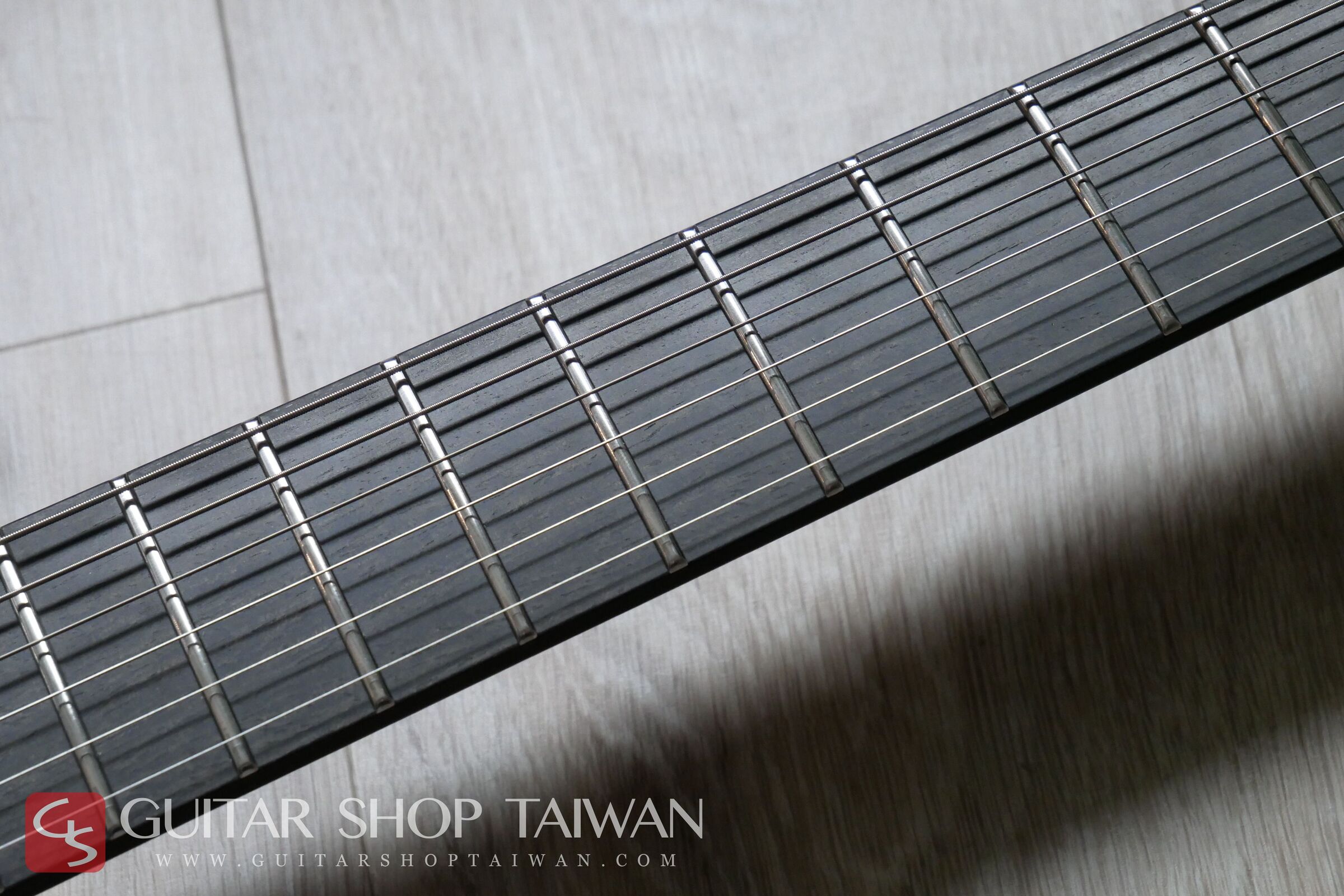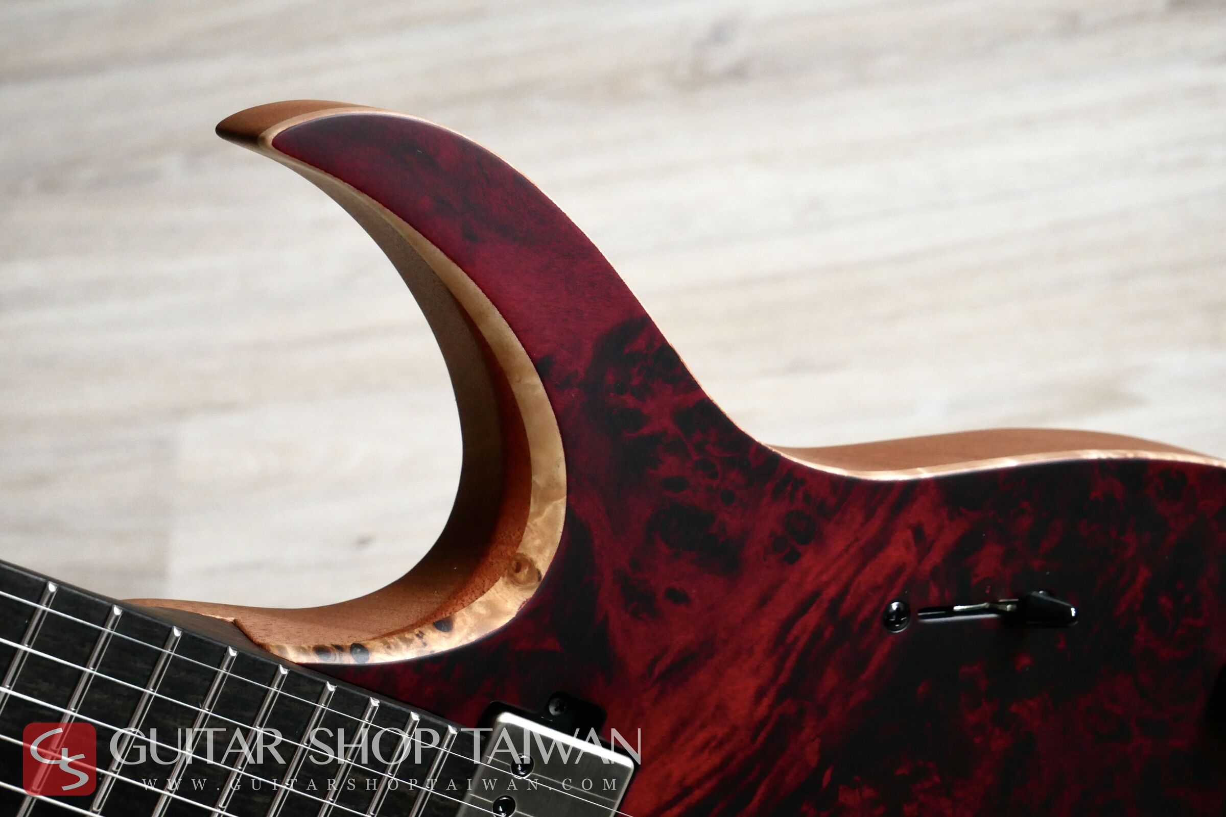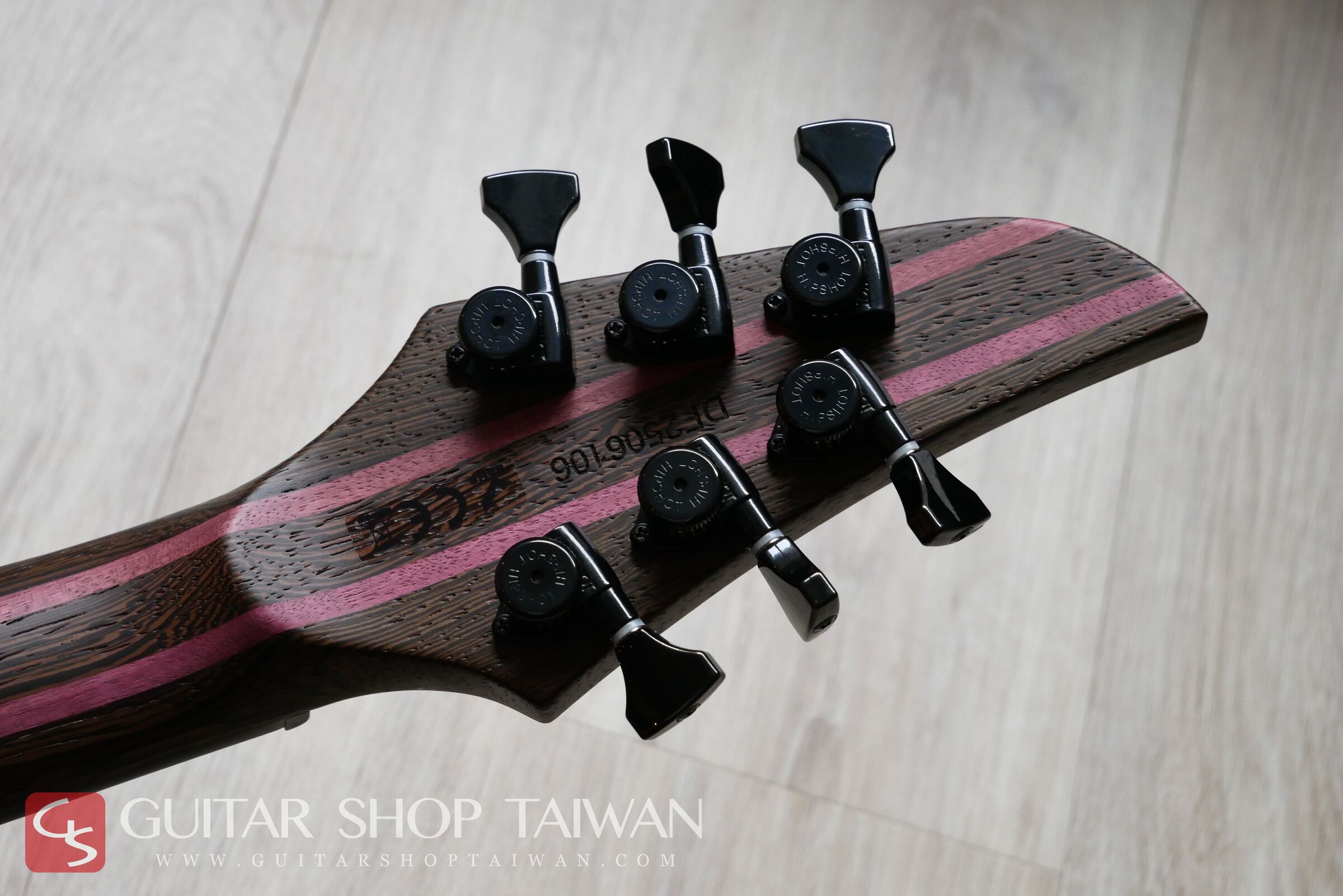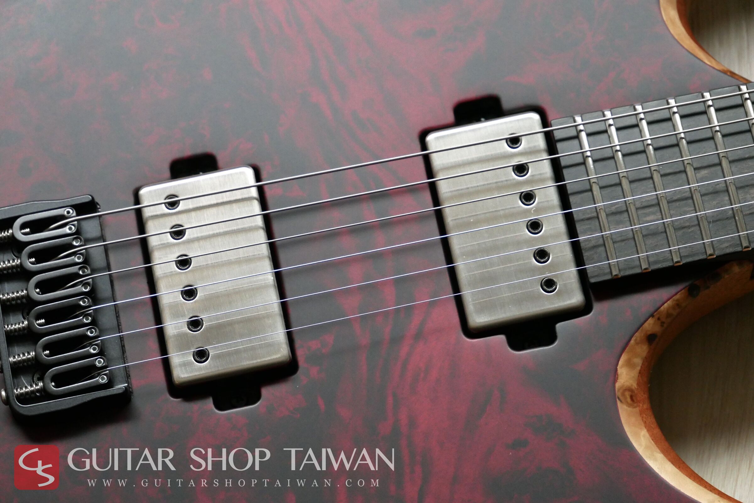 琴面採用嚴選3A級Eye Poplar,搭配桃花心木琴身,標誌性的5-ply Wenge Purpleheart D Shape琴頸,選用16” Radius弧度的黑檀木指板,這是Mayones最被推崇的配置之一,透過五層木材交錯排列,抵消了單塊木頭可能產生的內應力,琴頸內部除了有Truss Rod以外,更嵌入兩根碳纖維桿補強。這種設計比傳統琴頸更加穩定,極大地減少了因溫濕度變化而導致彎曲或扭曲的風險。整把琴皆採用Matt Finish無上漆處理,觸感溫順自然。