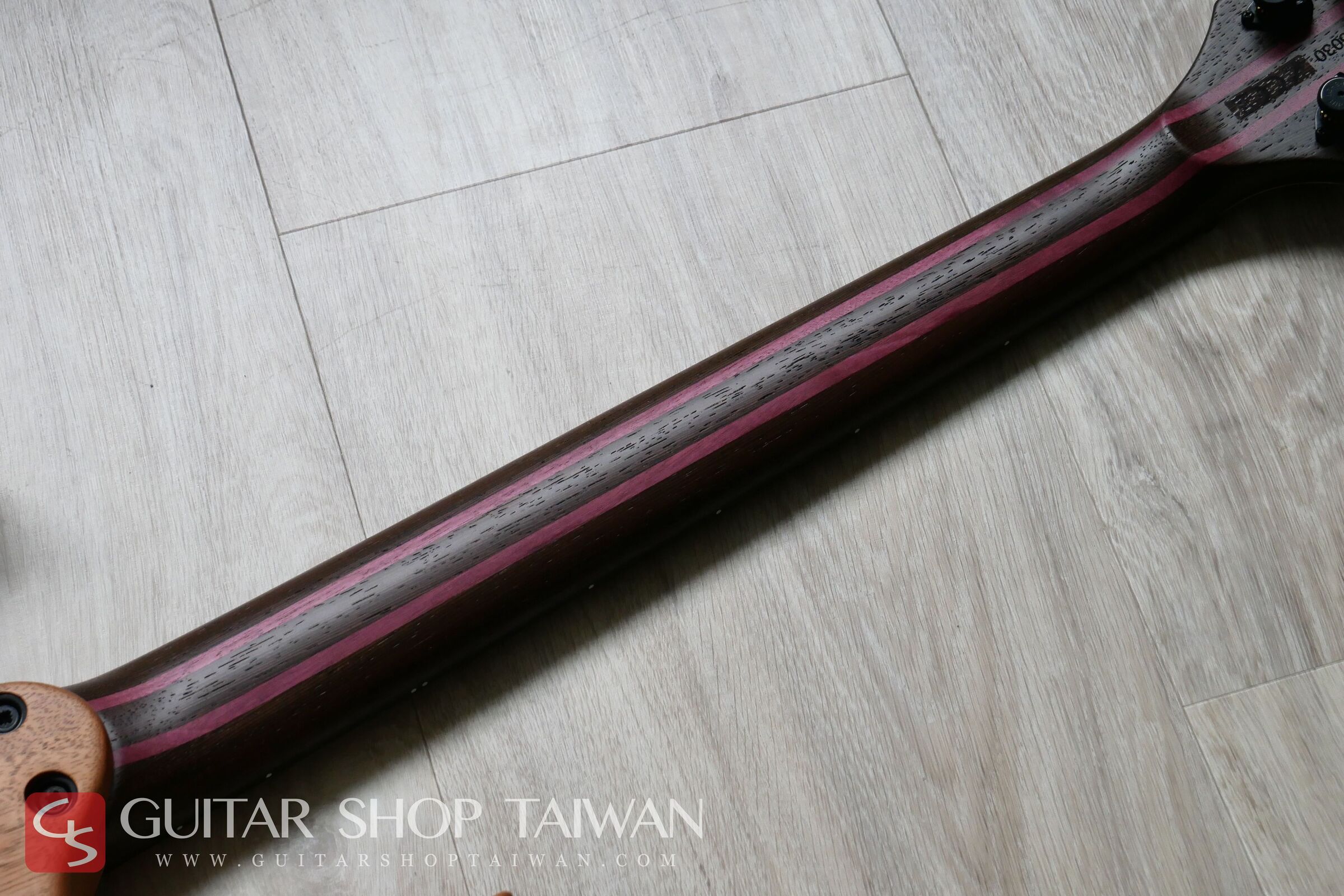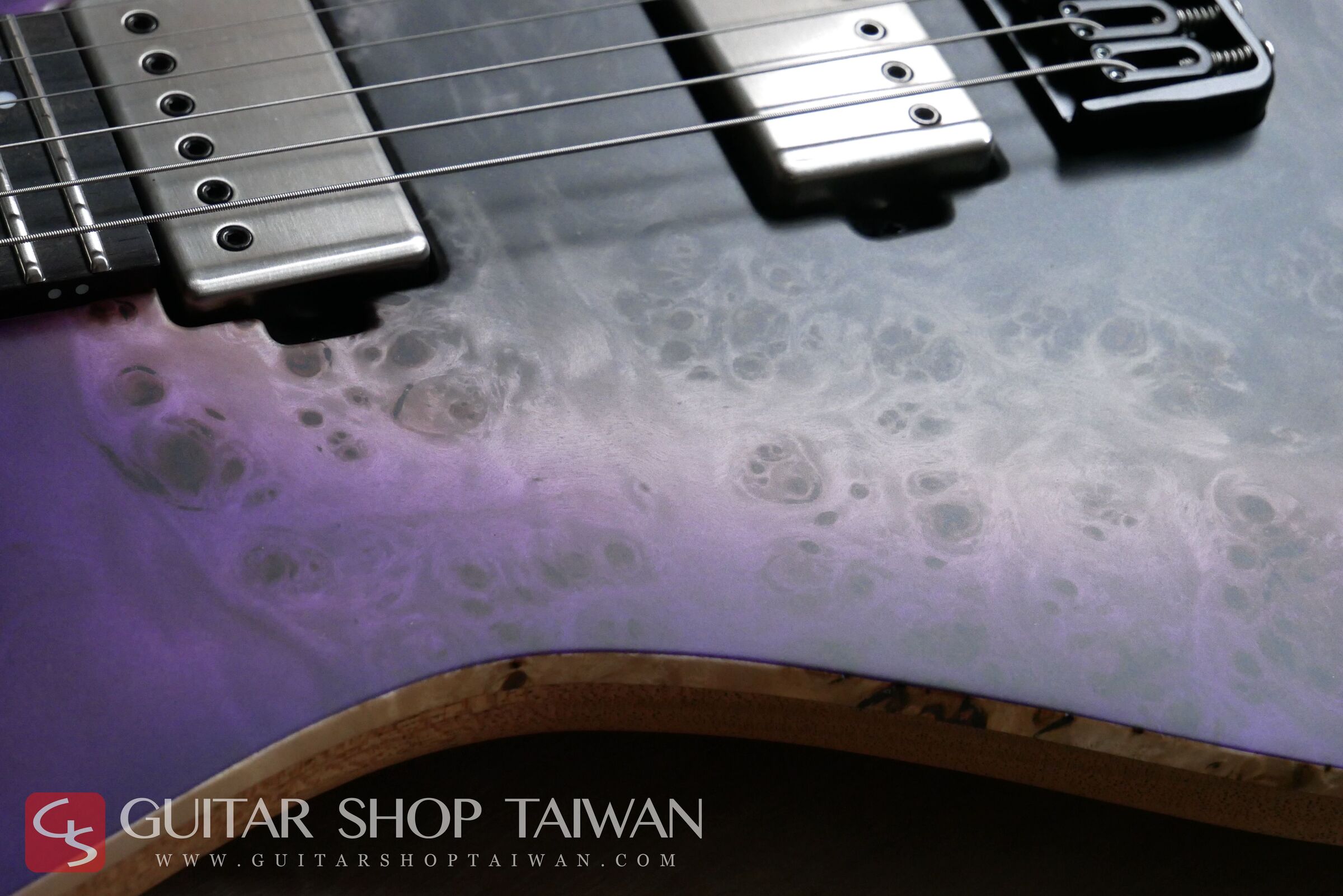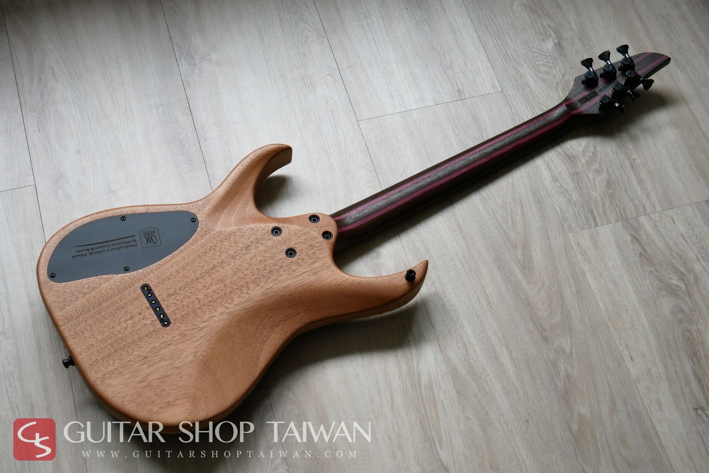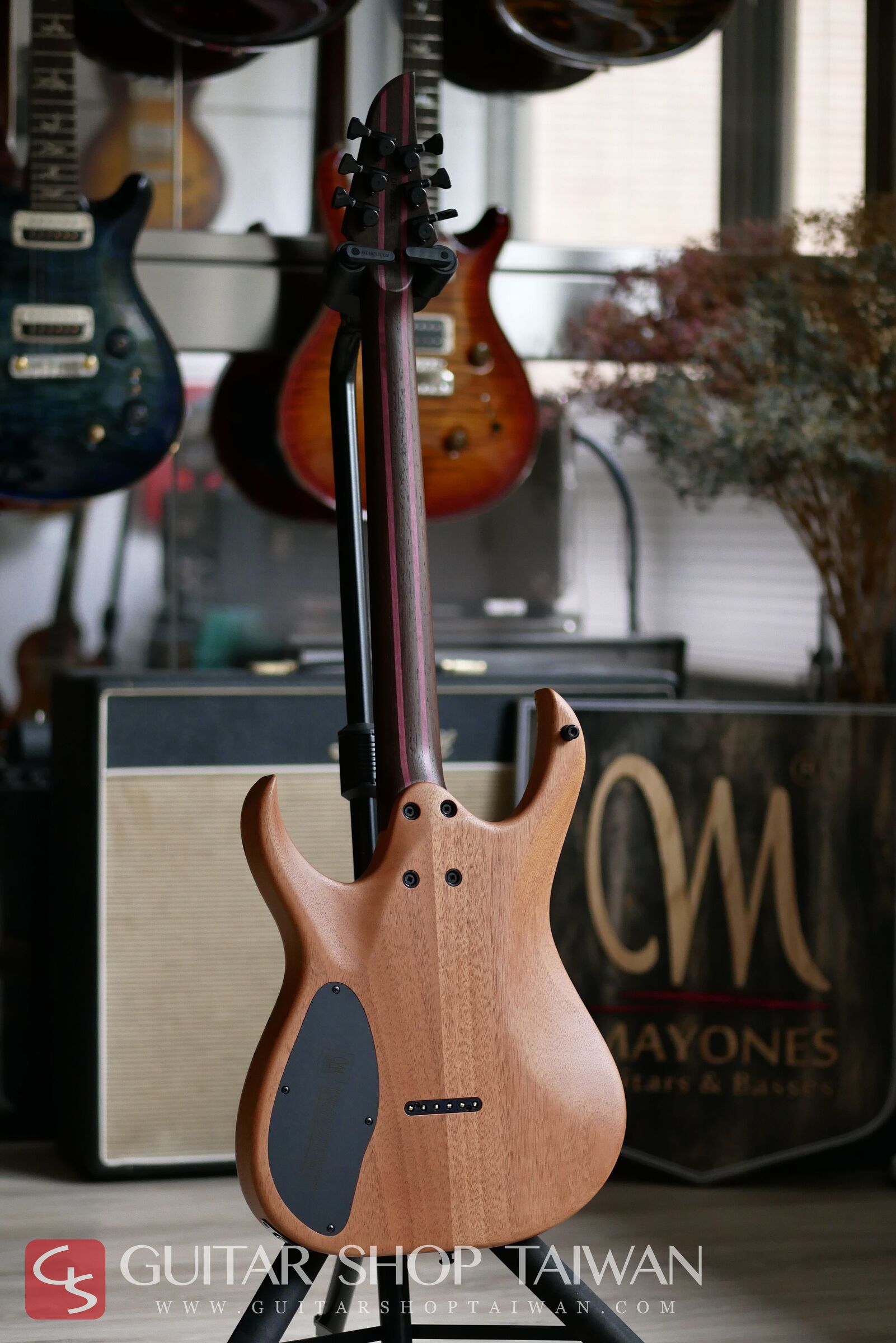 琴面採用嚴選4A級Eye Poplar,搭配非洲桃花心木琴身,標誌性的5-ply Wenge Purpleheart D Shape琴頸,選用16” Radius弧度的黑檀木指板,這是Mayones最被推崇的配置之一,透過五層木材交錯排列,抵消了單塊木頭可能產生的內應力,而琴頸內部除了有Truss Rod以外,更嵌入兩根碳纖維桿補強。這種設計比傳統琴頸更加穩定,極大地減少了因溫濕度變化而導致彎曲或扭曲的風險。整把琴皆採用Matt Finish無上漆處理,觸感溫順自然。