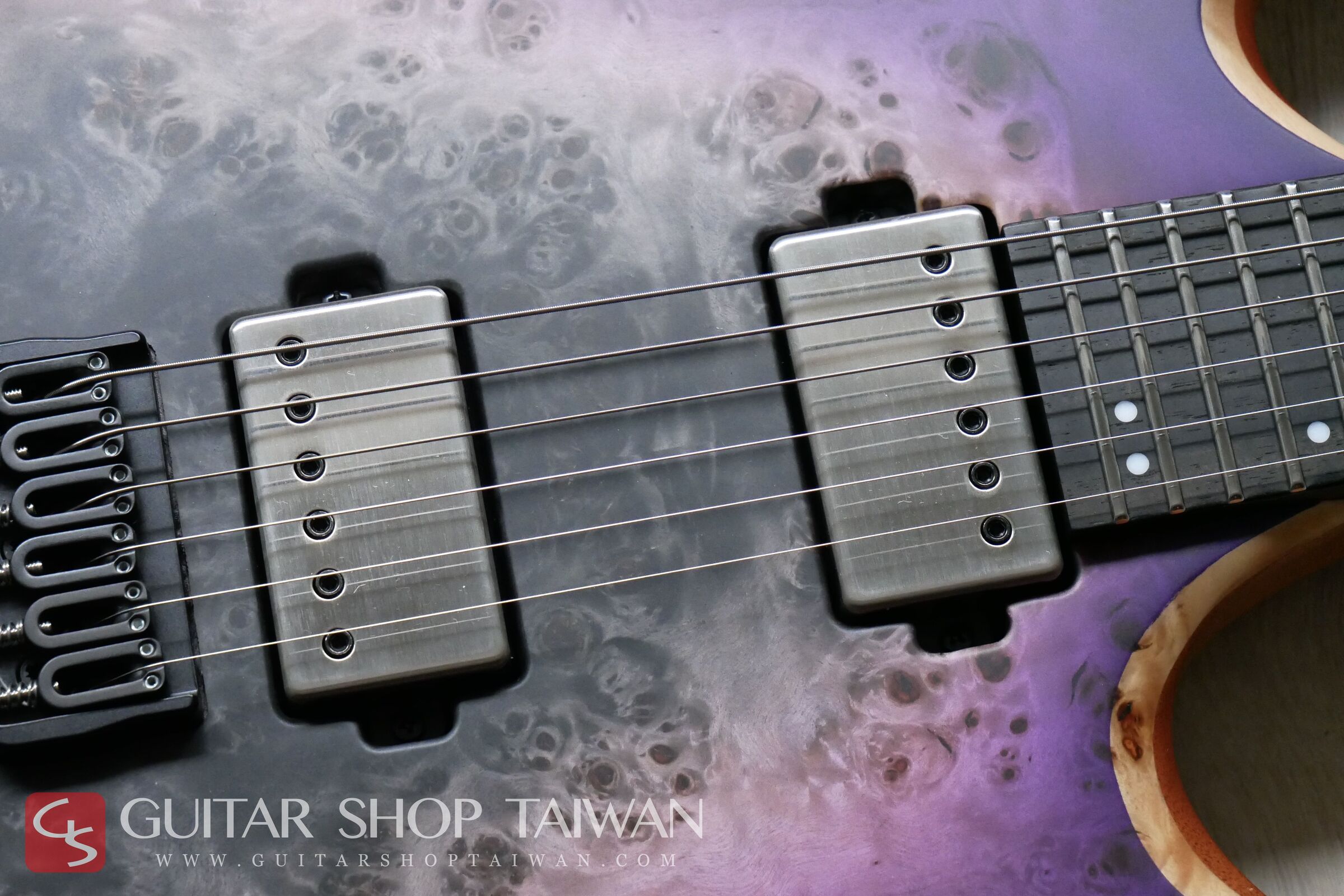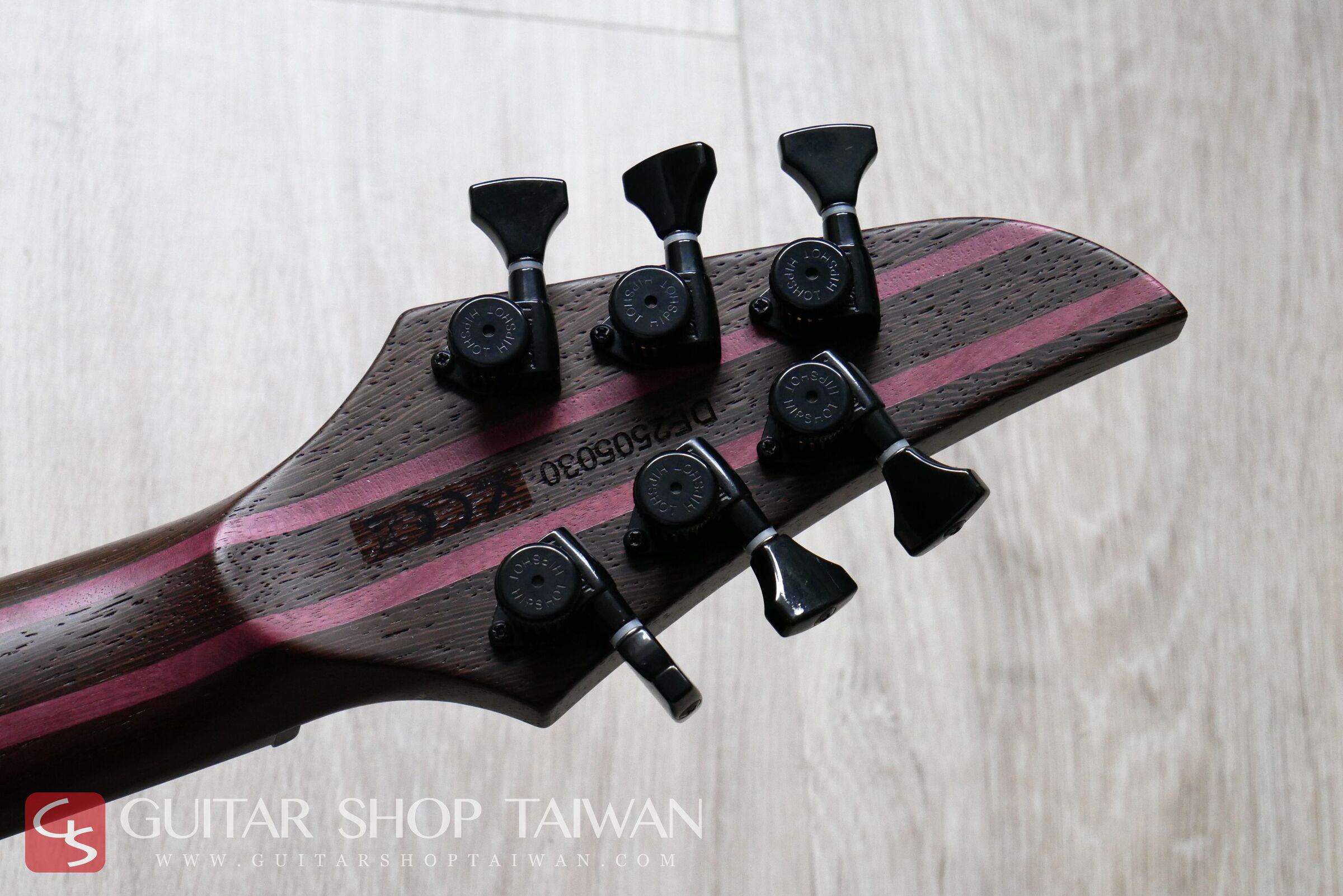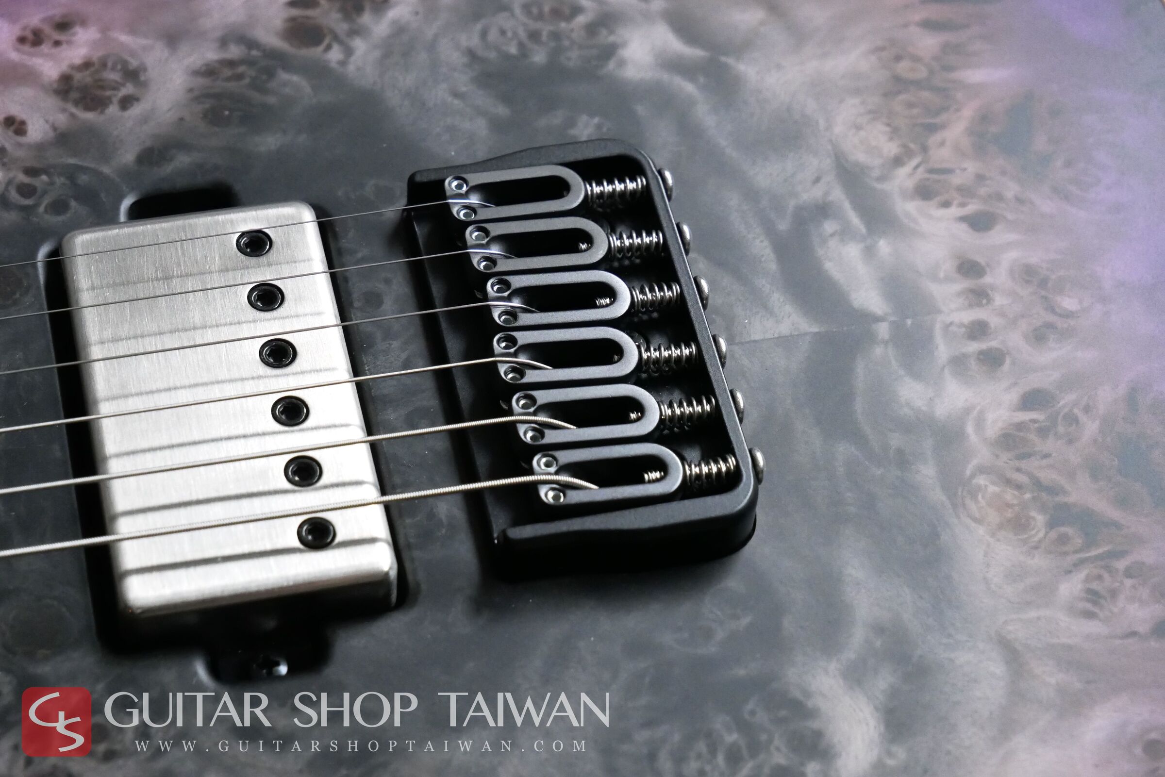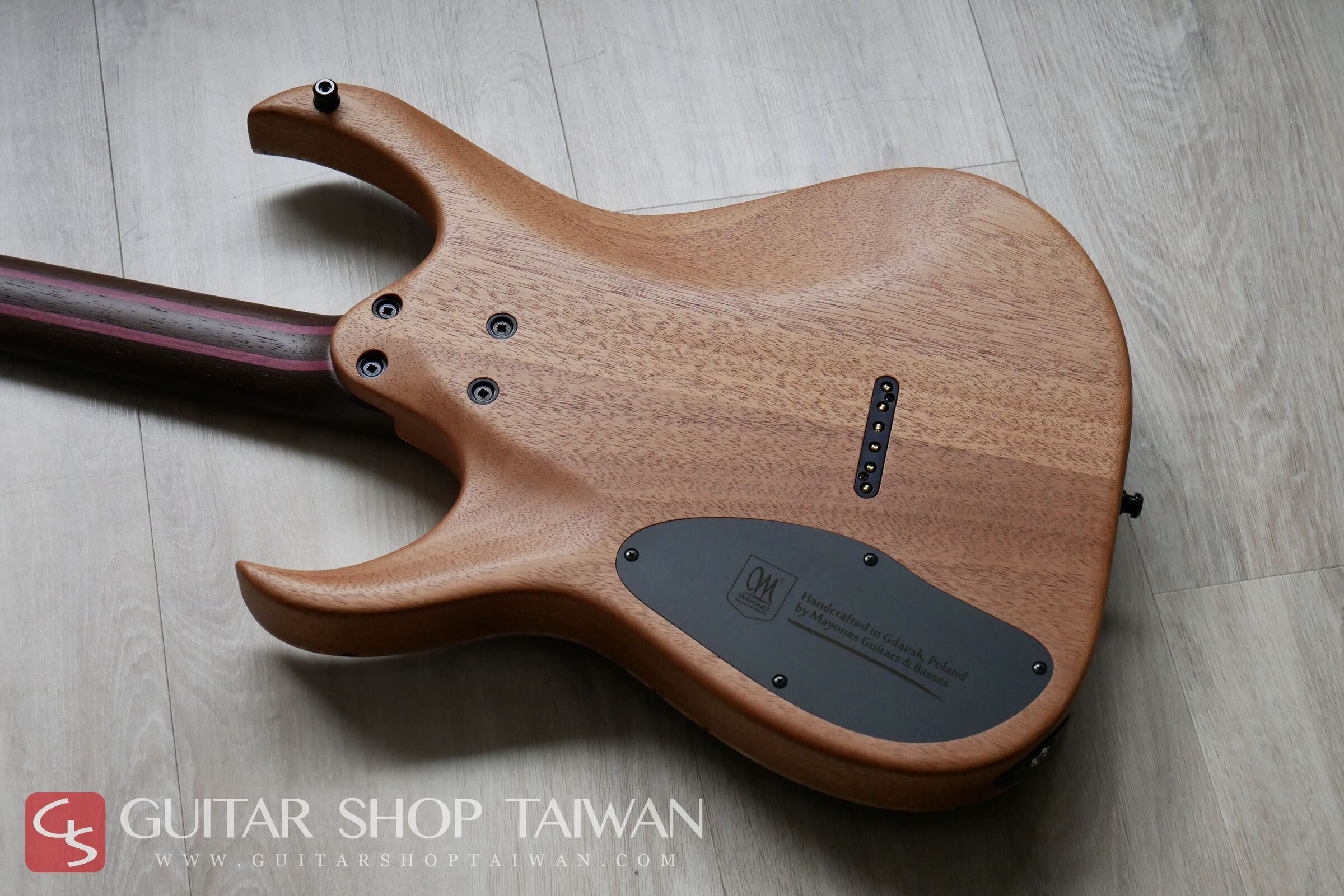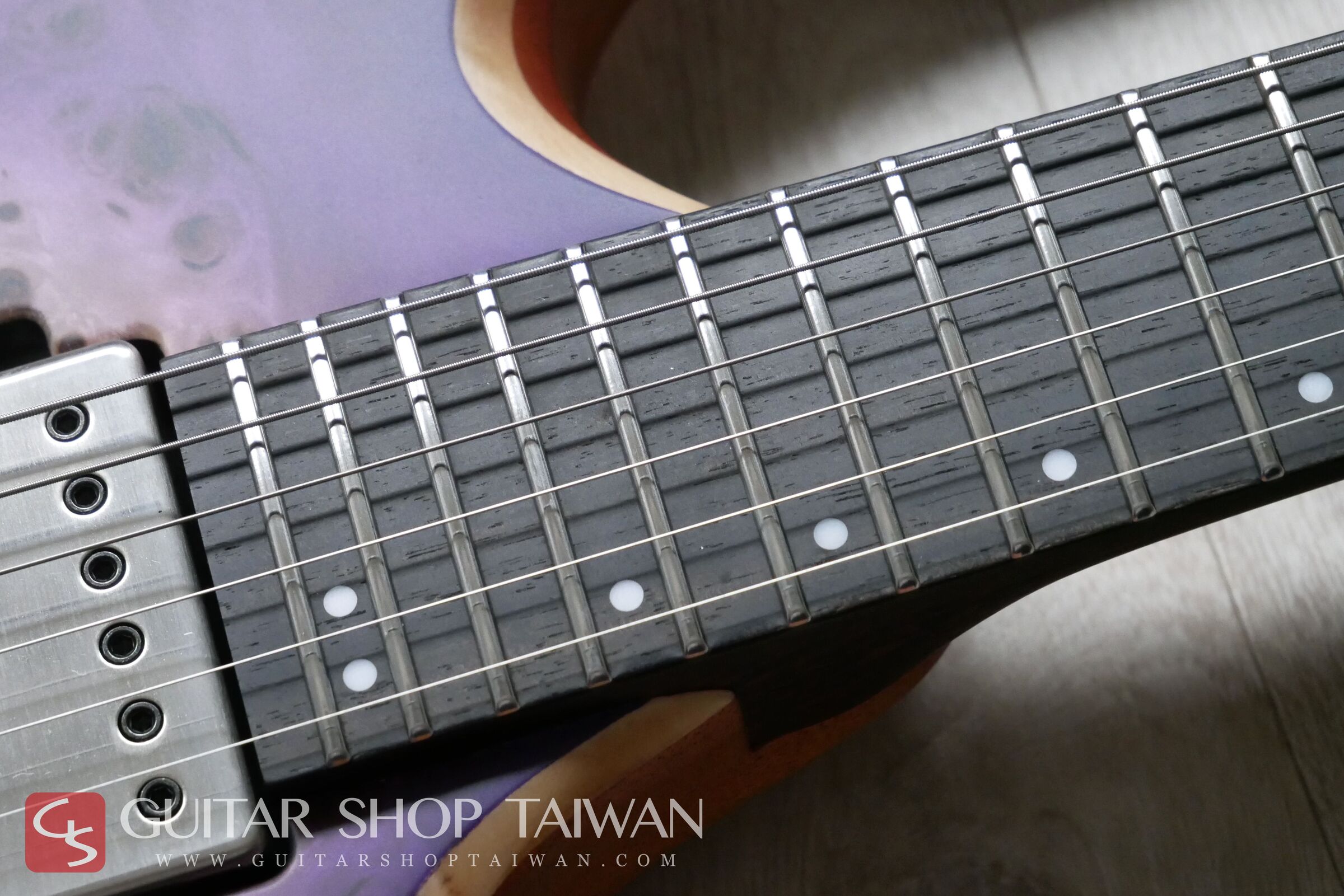 琴面採用嚴選4A級Eye Poplar,搭配非洲桃花心木琴身,標誌性的5-ply Wenge Purpleheart D Shape琴頸,選用16” Radius弧度的黑檀木指板,這是Mayones最被推崇的配置之一,透過五層木材交錯排列,抵消了單塊木頭可能產生的內應力,而琴頸內部除了有Truss Rod以外,更嵌入兩根碳纖維桿補強。這種設計比傳統琴頸更加穩定,極大地減少了因溫濕度變化而導致彎曲或扭曲的風險。整把琴皆採用Matt Finish無上漆處理,觸感溫順自然。