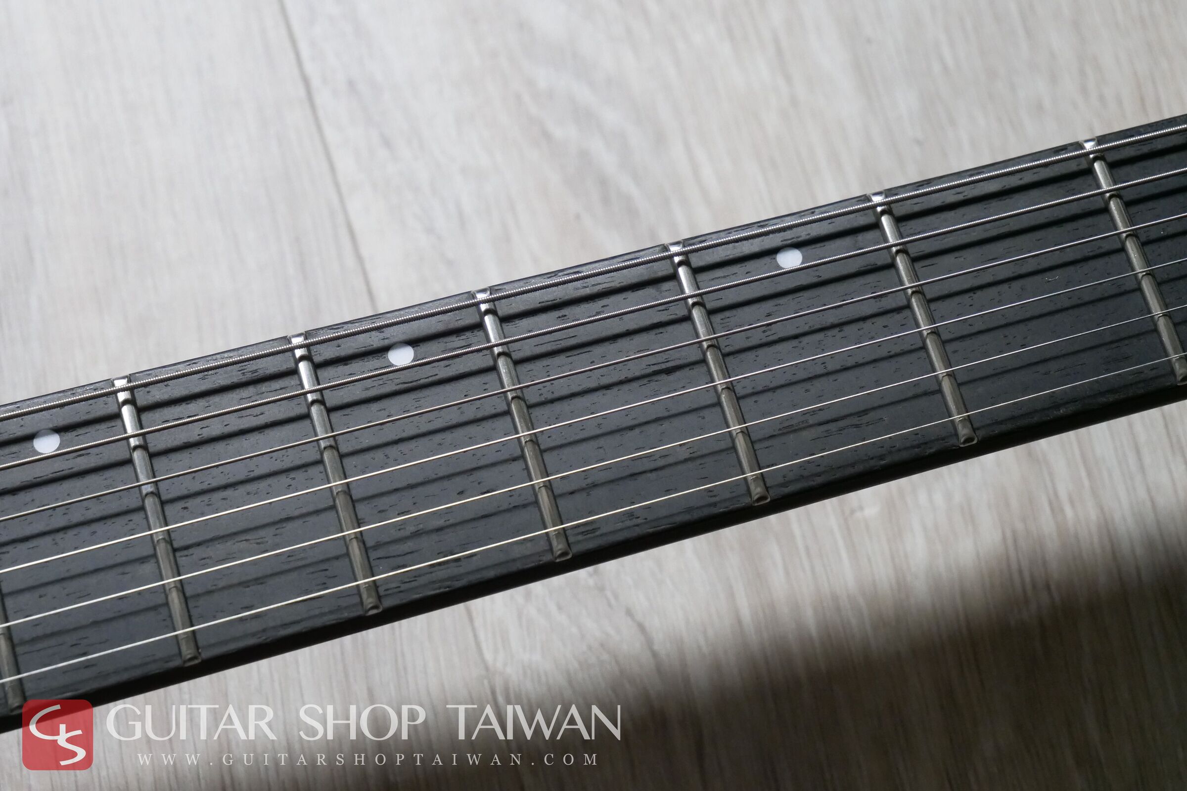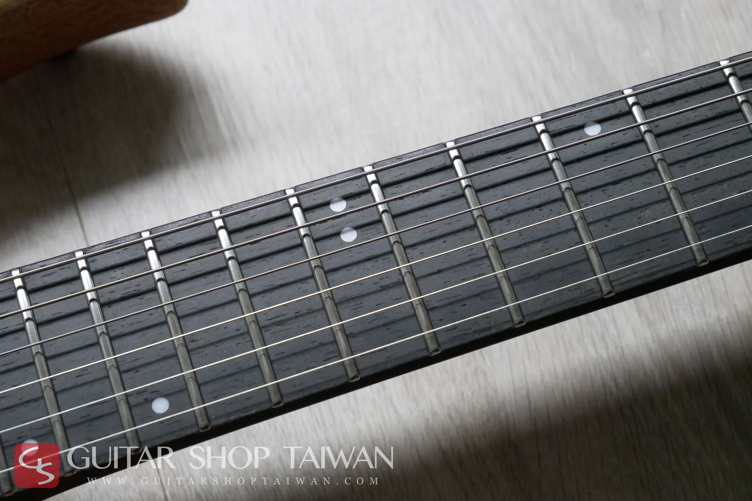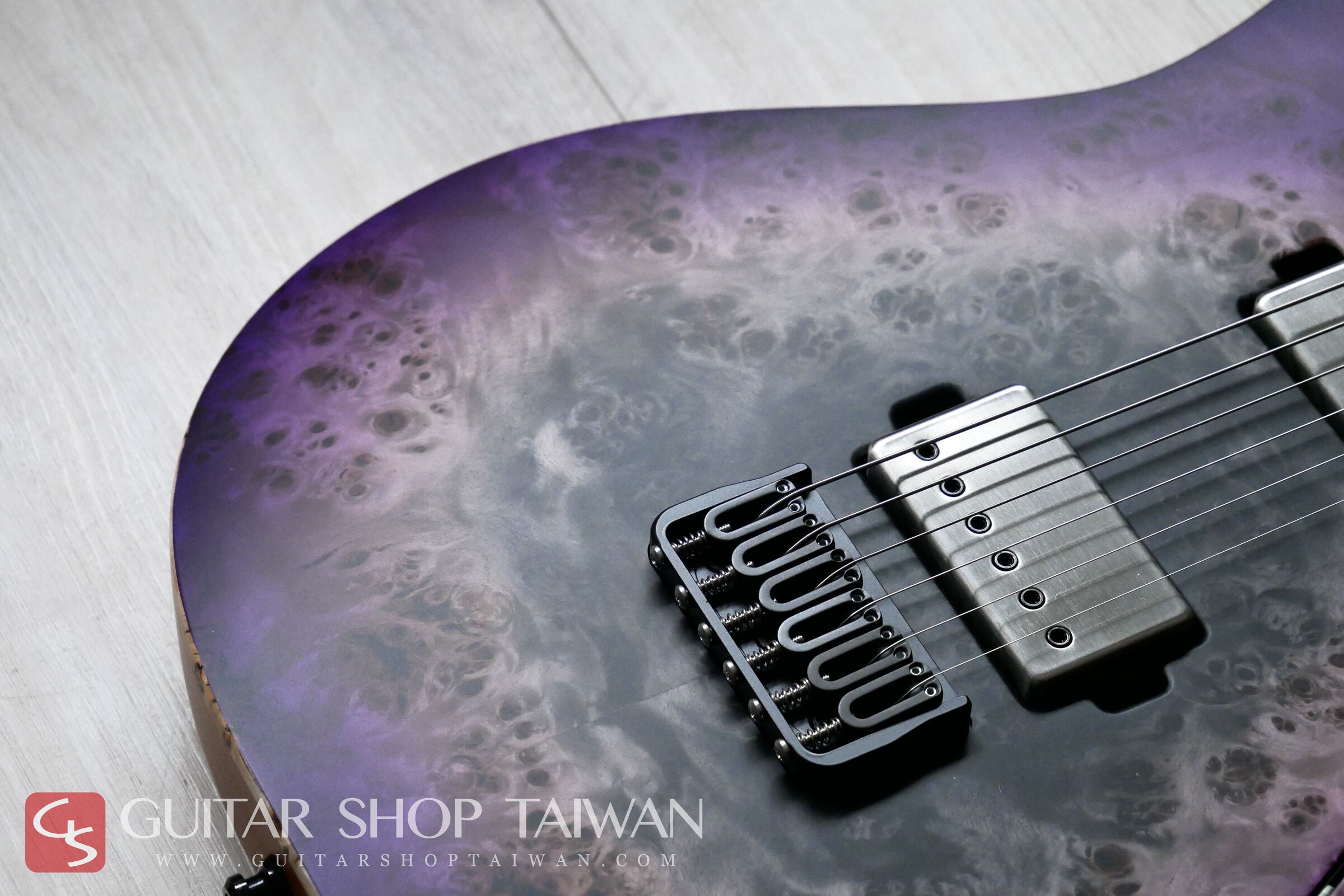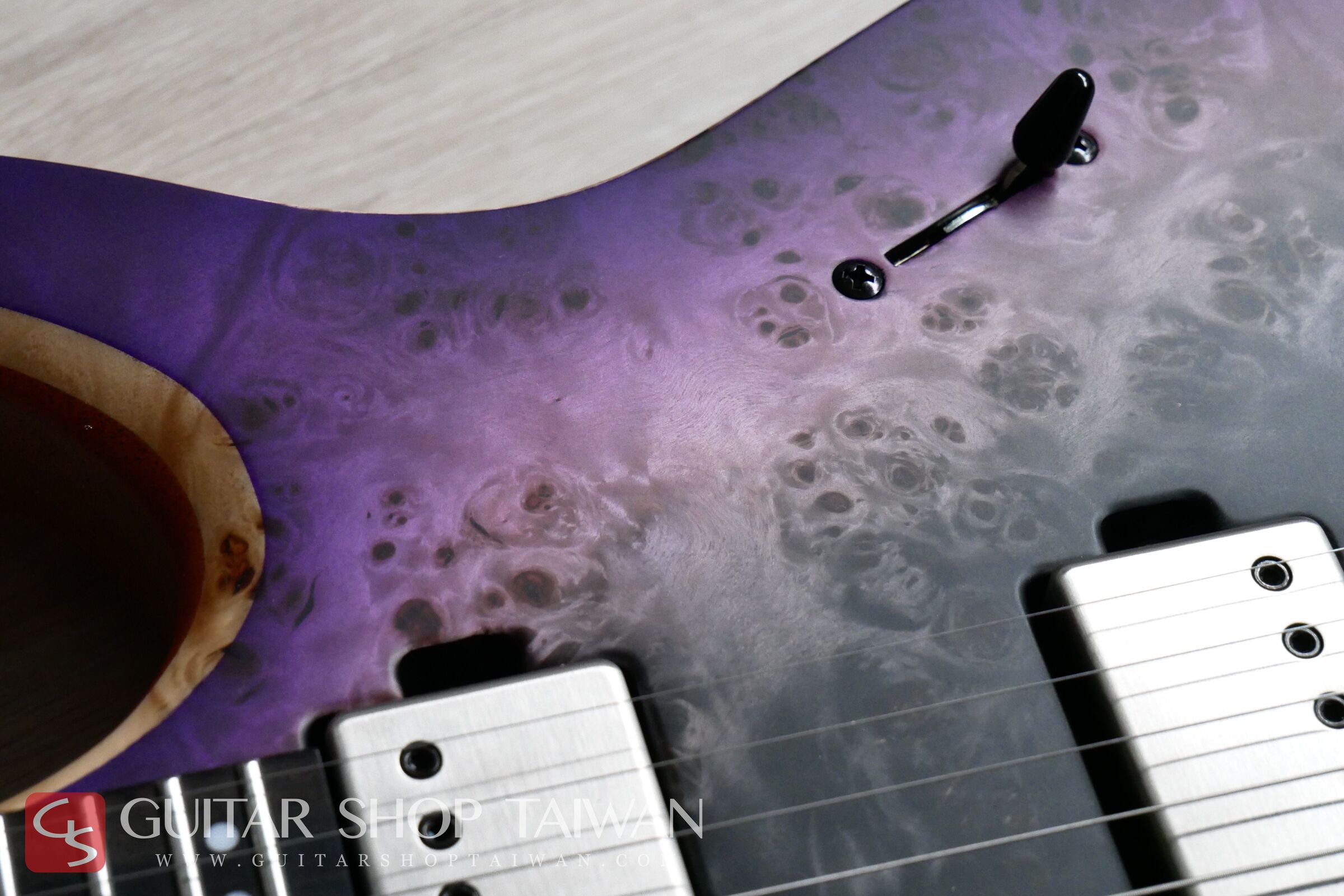 琴面採用嚴選4A級Eye Poplar,搭配非洲桃花心木琴身,標誌性的5-ply Wenge Purpleheart D Shape琴頸,選用16” Radius弧度的黑檀木指板,這是Mayones最被推崇的配置之一,透過五層木材交錯排列,抵消了單塊木頭可能產生的內應力,而琴頸內部除了有Truss Rod以外,更嵌入兩根碳纖維桿補強。這種設計比傳統琴頸更加穩定,極大地減少了因溫濕度變化而導致彎曲或扭曲的風險。整把琴皆採用Matt Finish無上漆處理,觸感溫順自然。