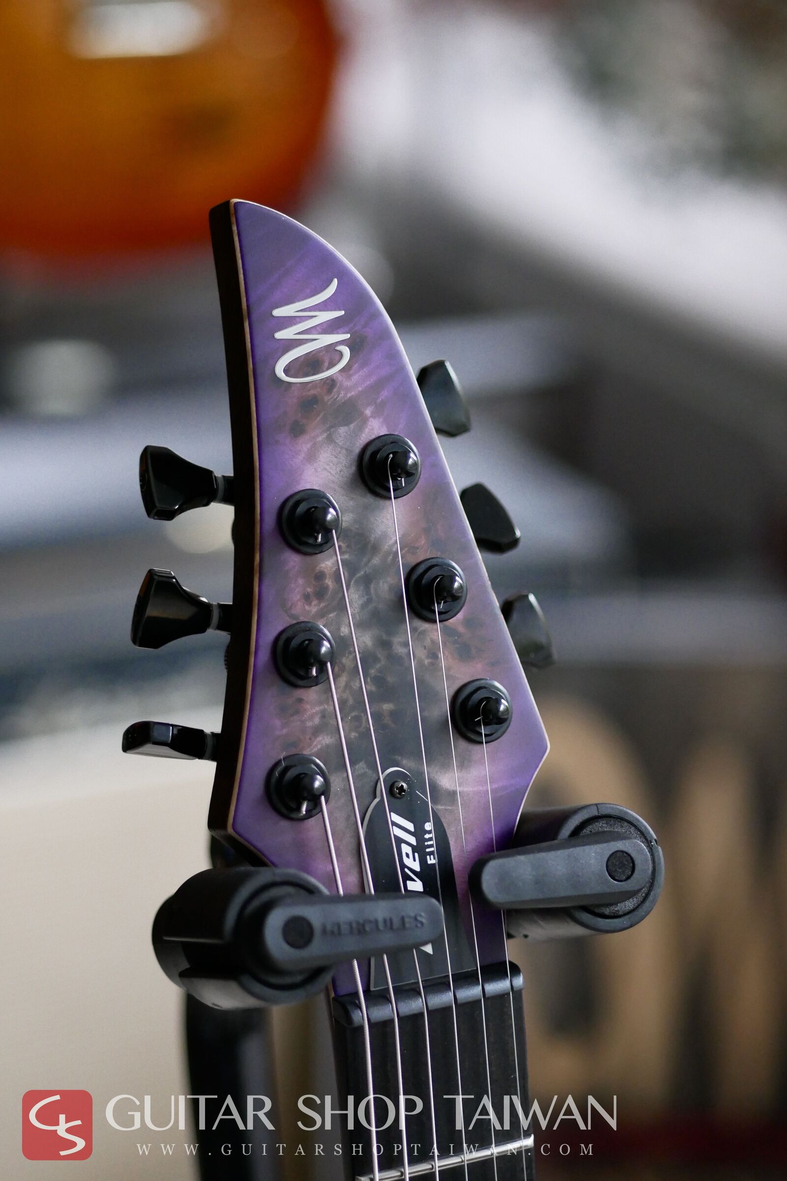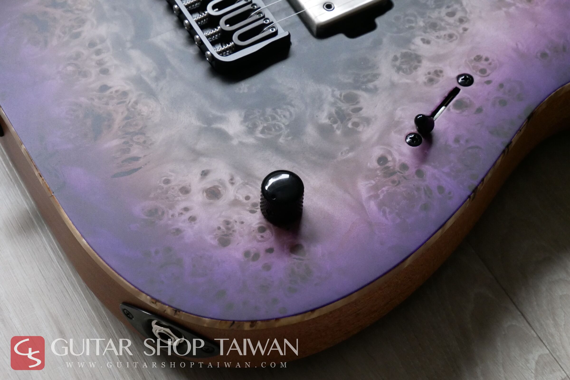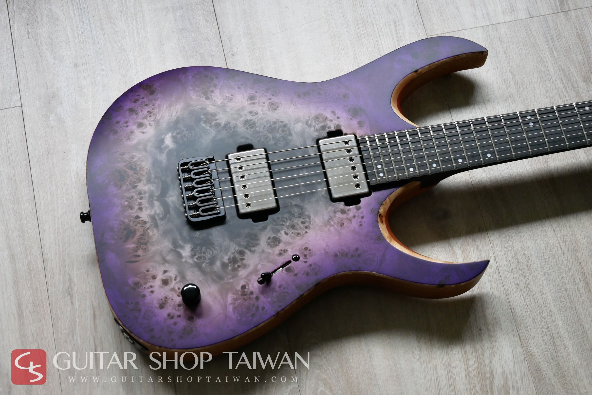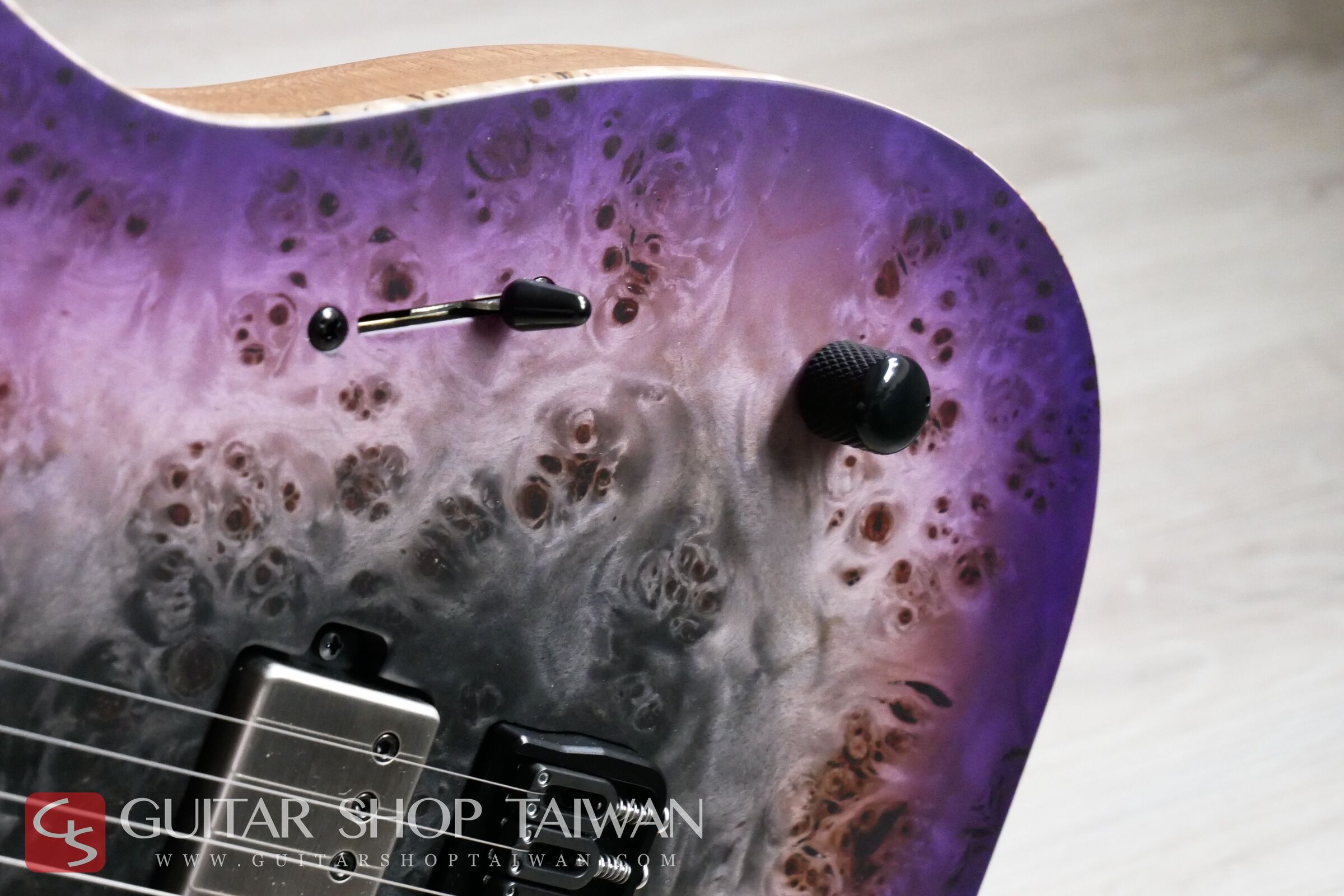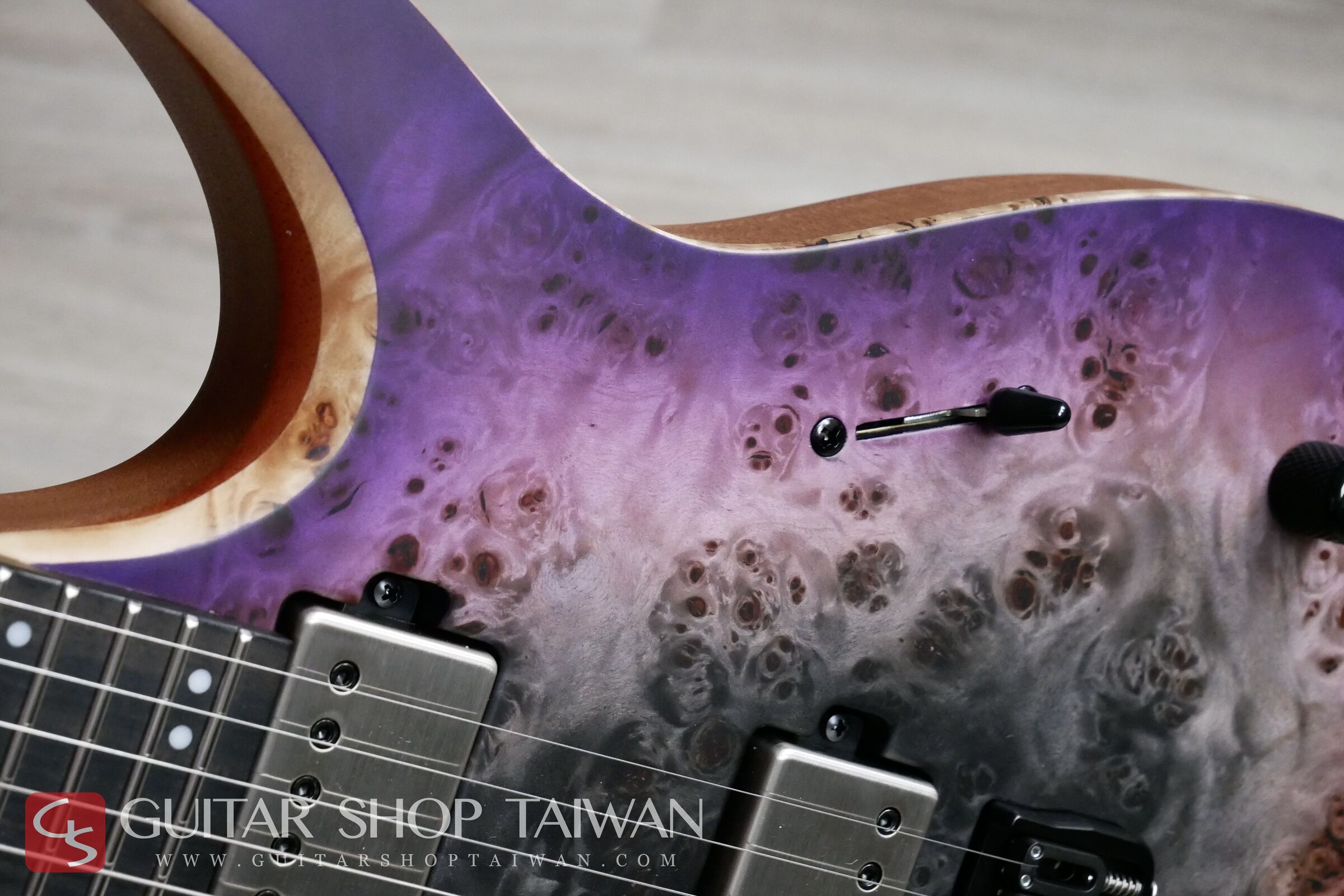 琴面採用嚴選4A級Eye Poplar,搭配非洲桃花心木琴身,標誌性的5-ply Wenge Purpleheart D Shape琴頸,選用16” Radius弧度的黑檀木指板,這是Mayones最被推崇的配置之一,透過五層木材交錯排列,抵消了單塊木頭可能產生的內應力,而琴頸內部除了有Truss Rod以外,更嵌入兩根碳纖維桿補強。這種設計比傳統琴頸更加穩定,極大地減少了因溫濕度變化而導致彎曲或扭曲的風險。整把琴皆採用Matt Finish無上漆處理,觸感溫順自然。