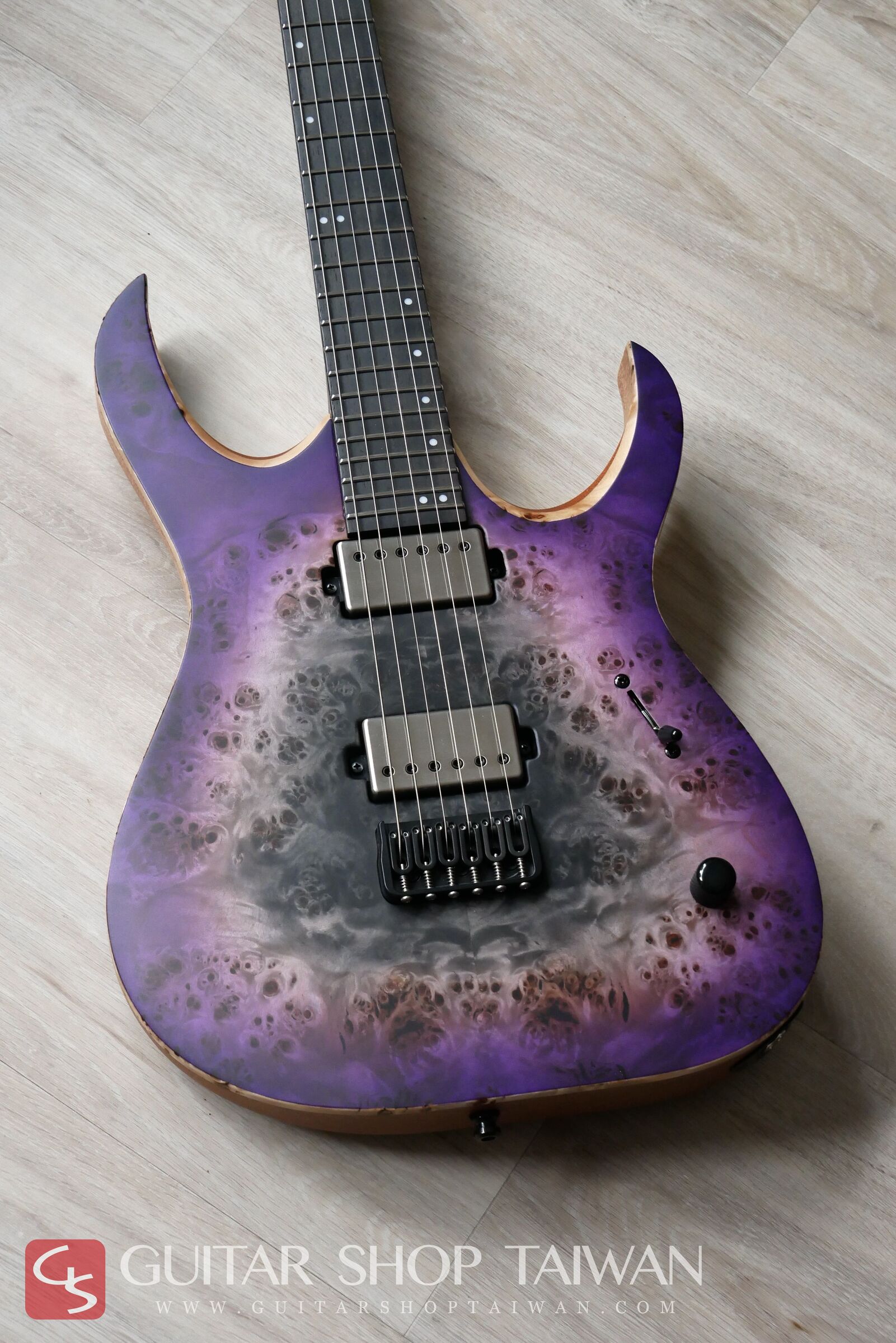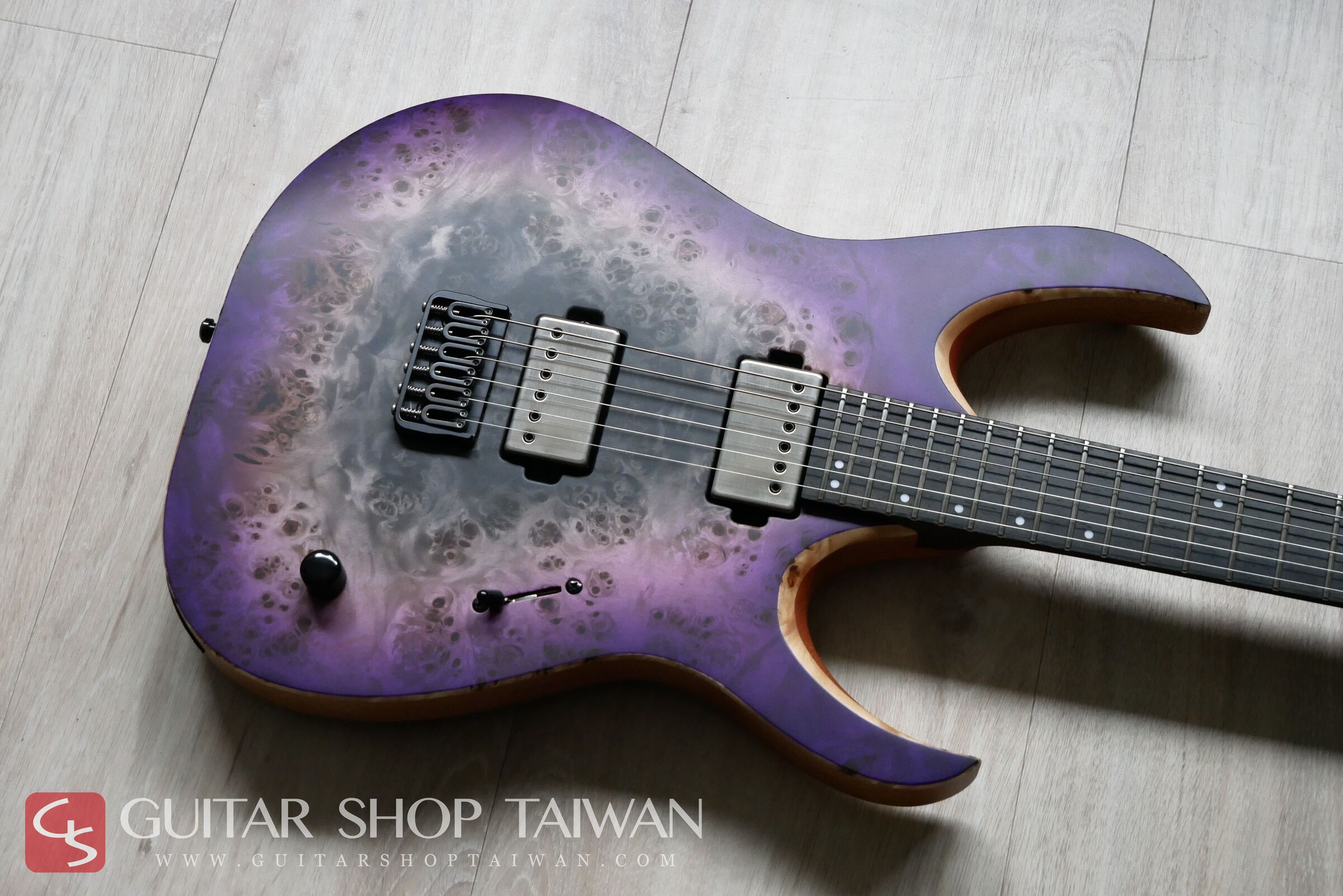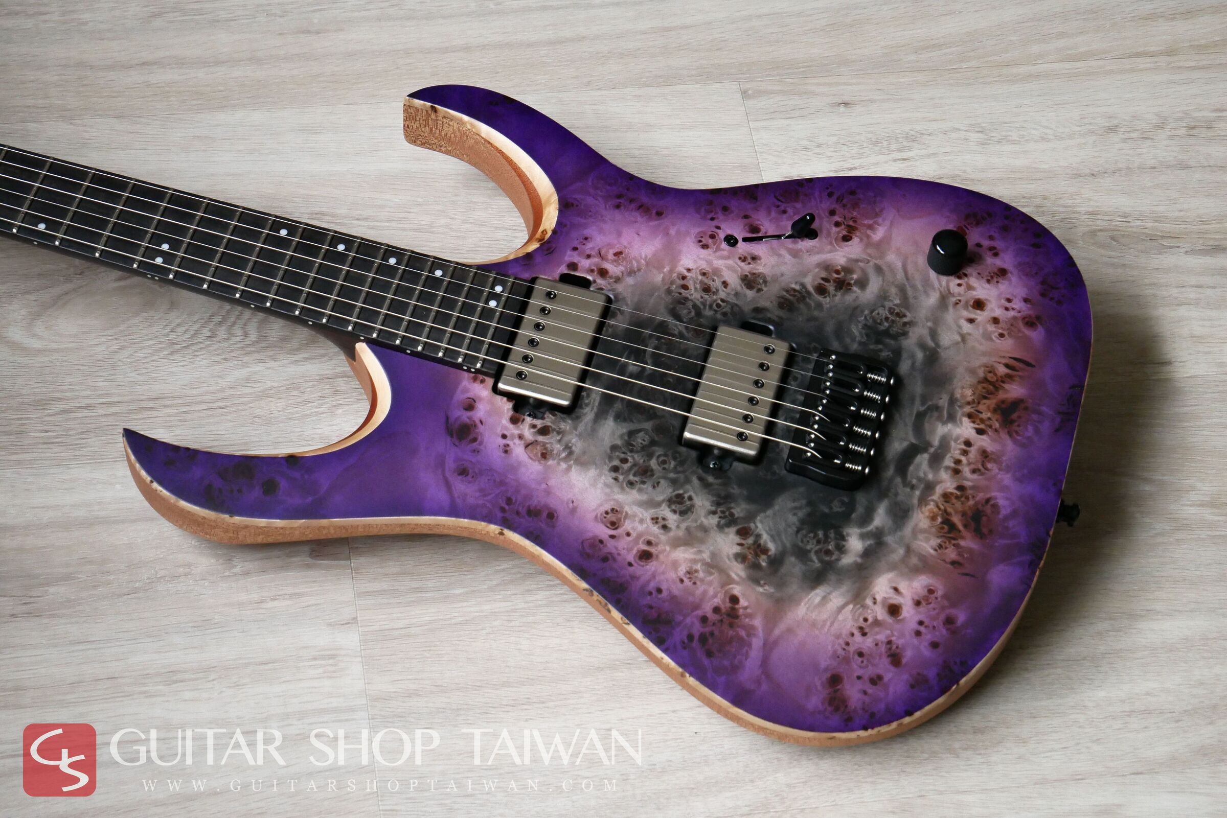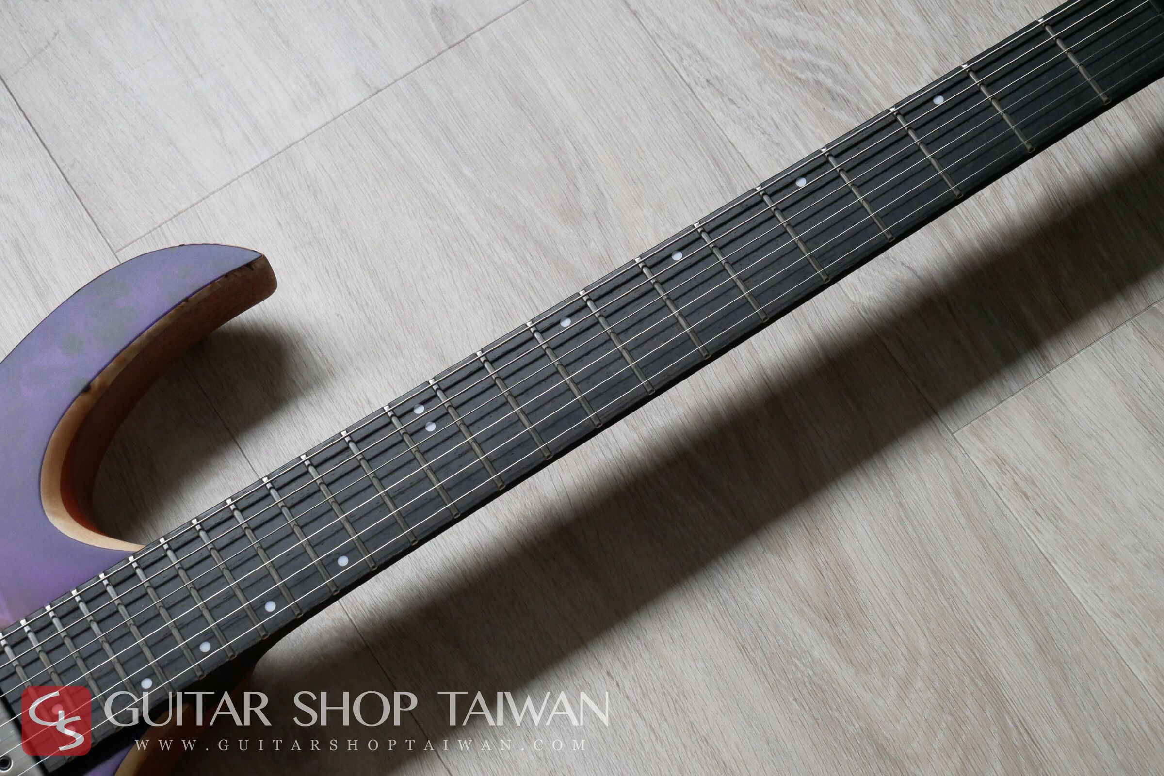 琴面採用嚴選4A級Eye Poplar,搭配非洲桃花心木琴身,標誌性的5-ply Wenge Purpleheart D Shape琴頸,選用16” Radius弧度的黑檀木指板,這是Mayones最被推崇的配置之一,透過五層木材交錯排列,抵消了單塊木頭可能產生的內應力,而琴頸內部除了有Truss Rod以外,更嵌入兩根碳纖維桿補強。這種設計比傳統琴頸更加穩定,極大地減少了因溫濕度變化而導致彎曲或扭曲的風險。整把琴皆採用Matt Finish無上漆處理,觸感溫順自然。