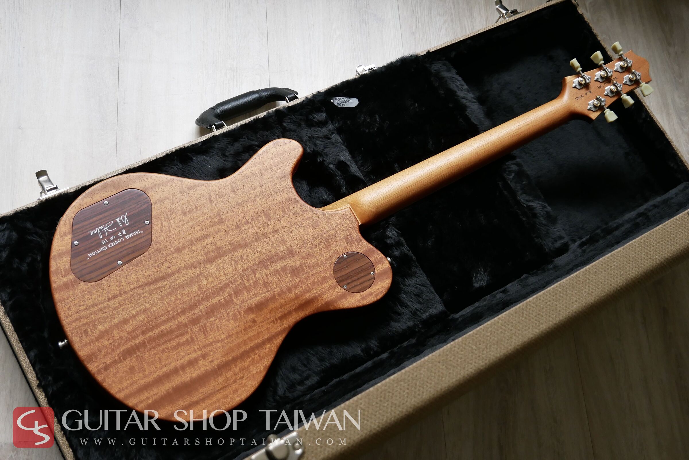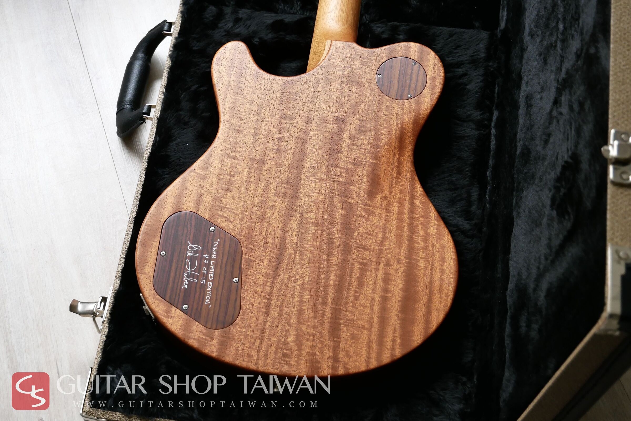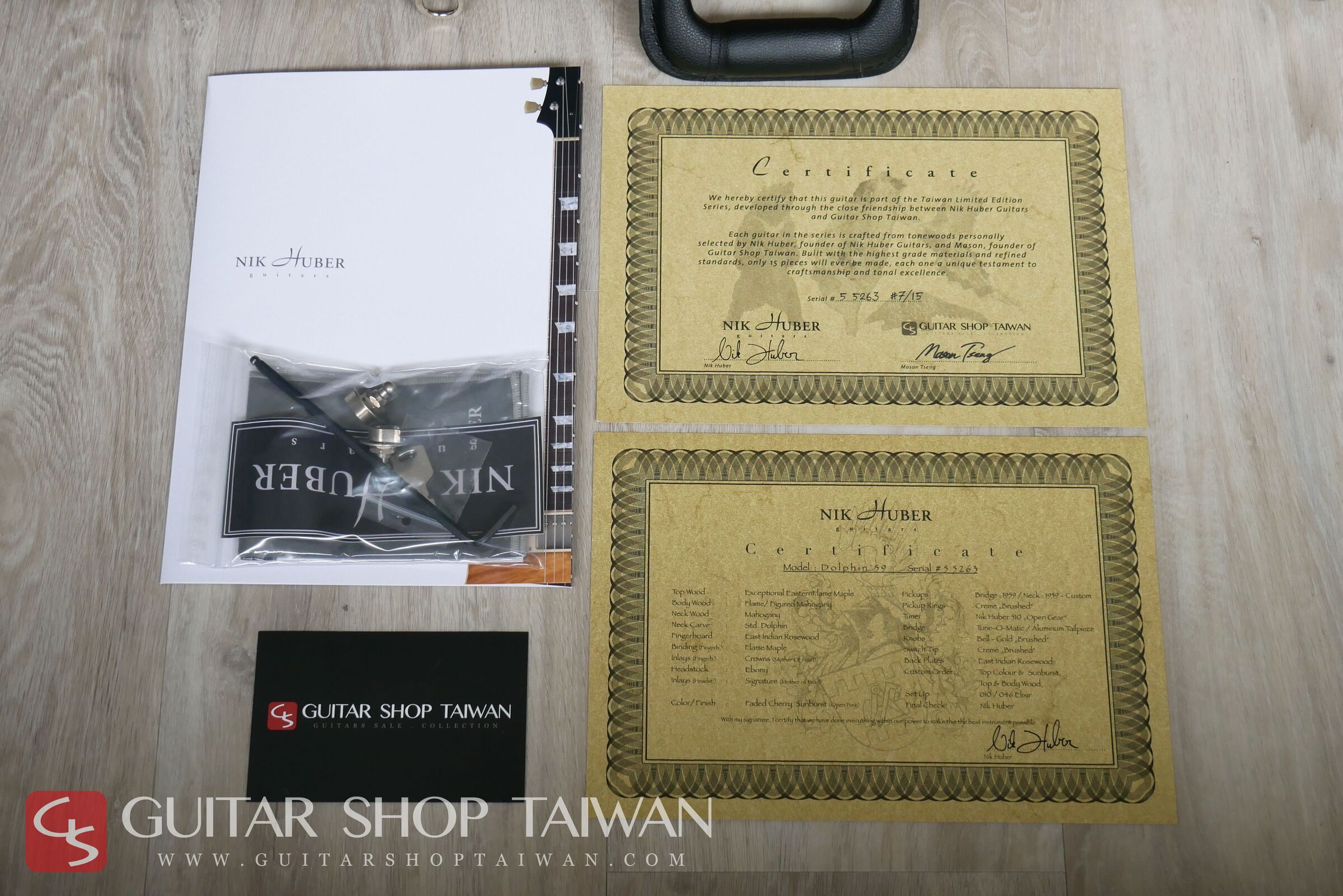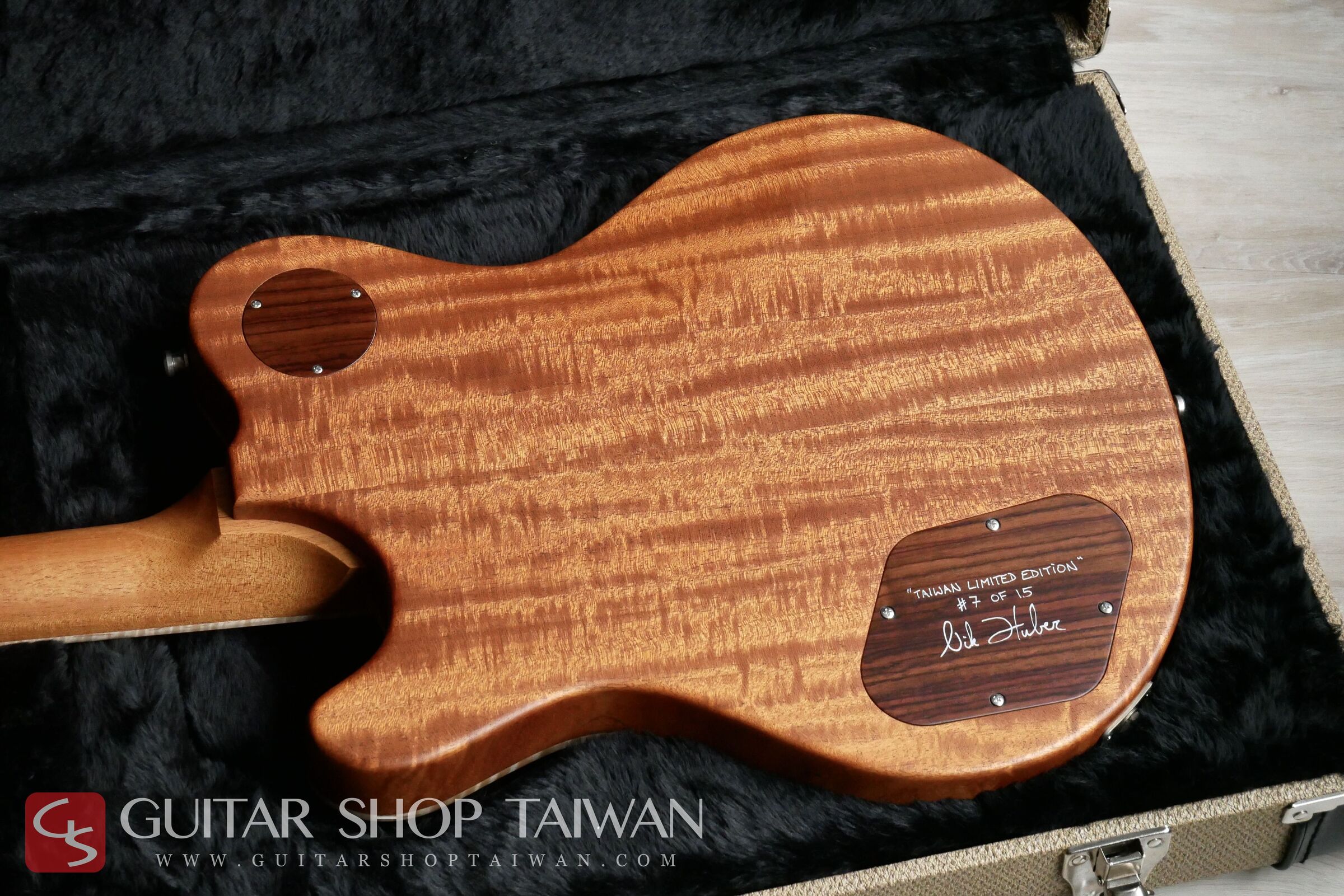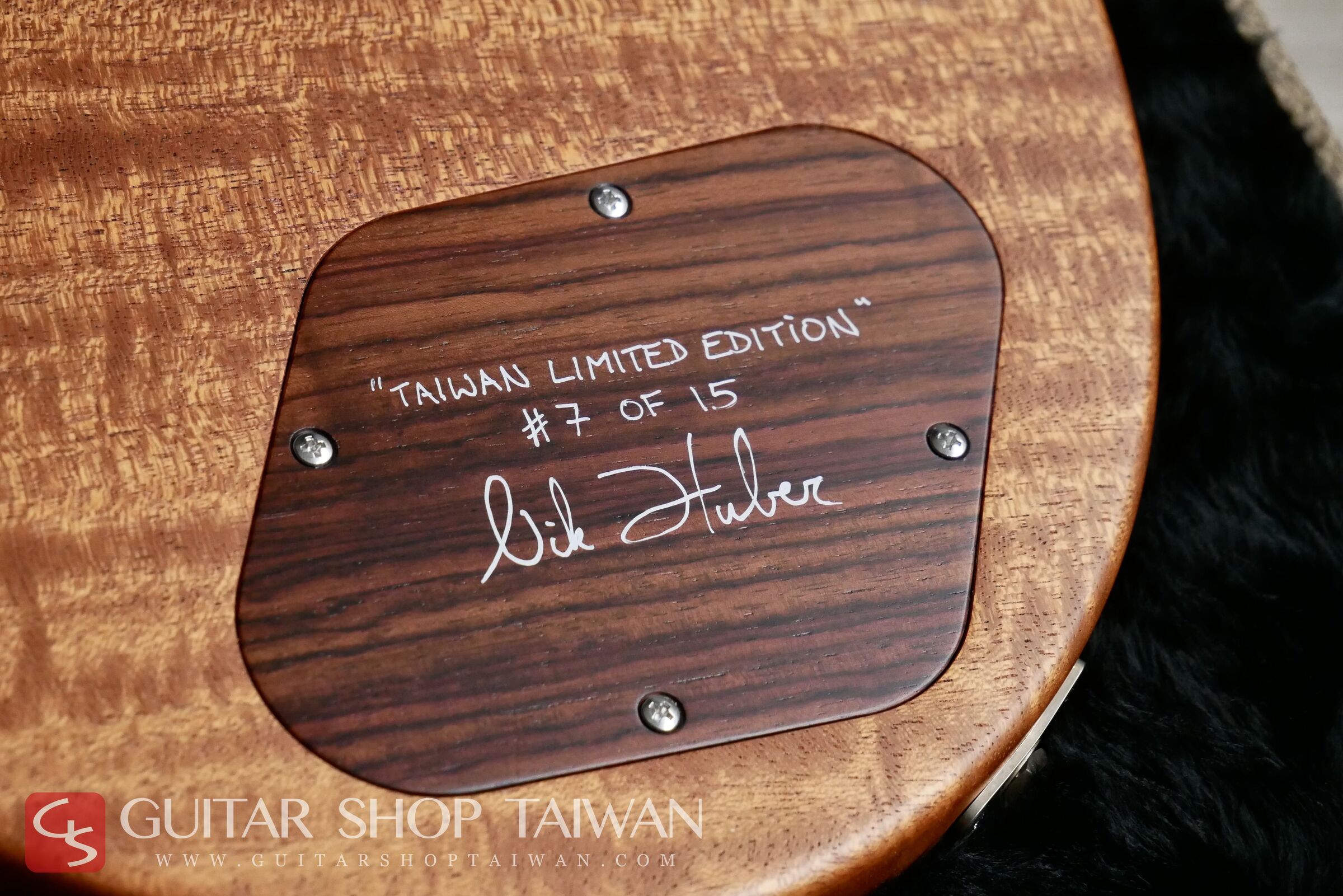 Guitar Shop Taiwan 與 Nik Huber Guitars 共同合作推出的「Taiwan Limited Edition 台灣限量系列」,本琴為該系列限量十五把中的第七把,由本公司與 Nik Huber 本人親自嚴選頂級木材打造。此系列的吉他皆附有專屬的台灣限定 Truss Rod 蓋板、Nik Huber 本人親筆簽名的背蓋板,以及一張特製的台灣限定版專屬證書。