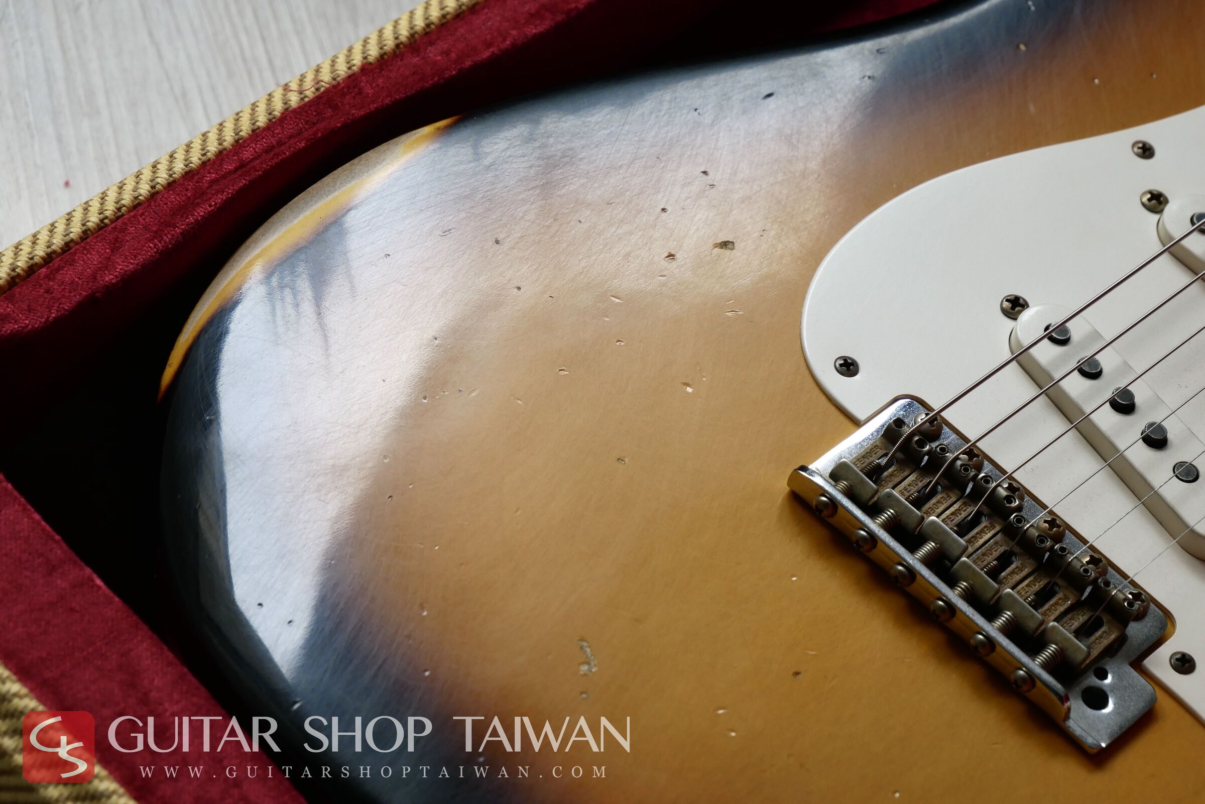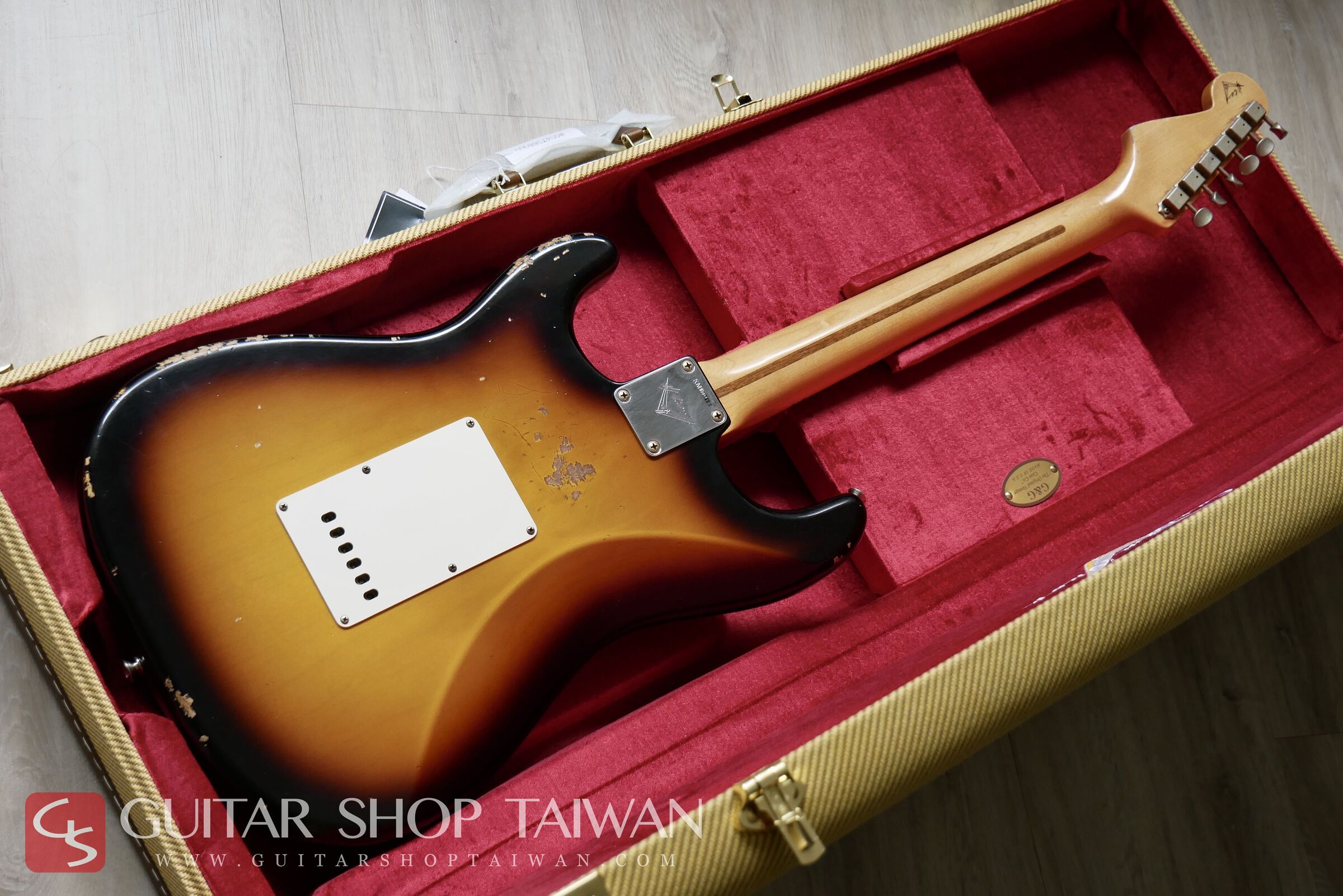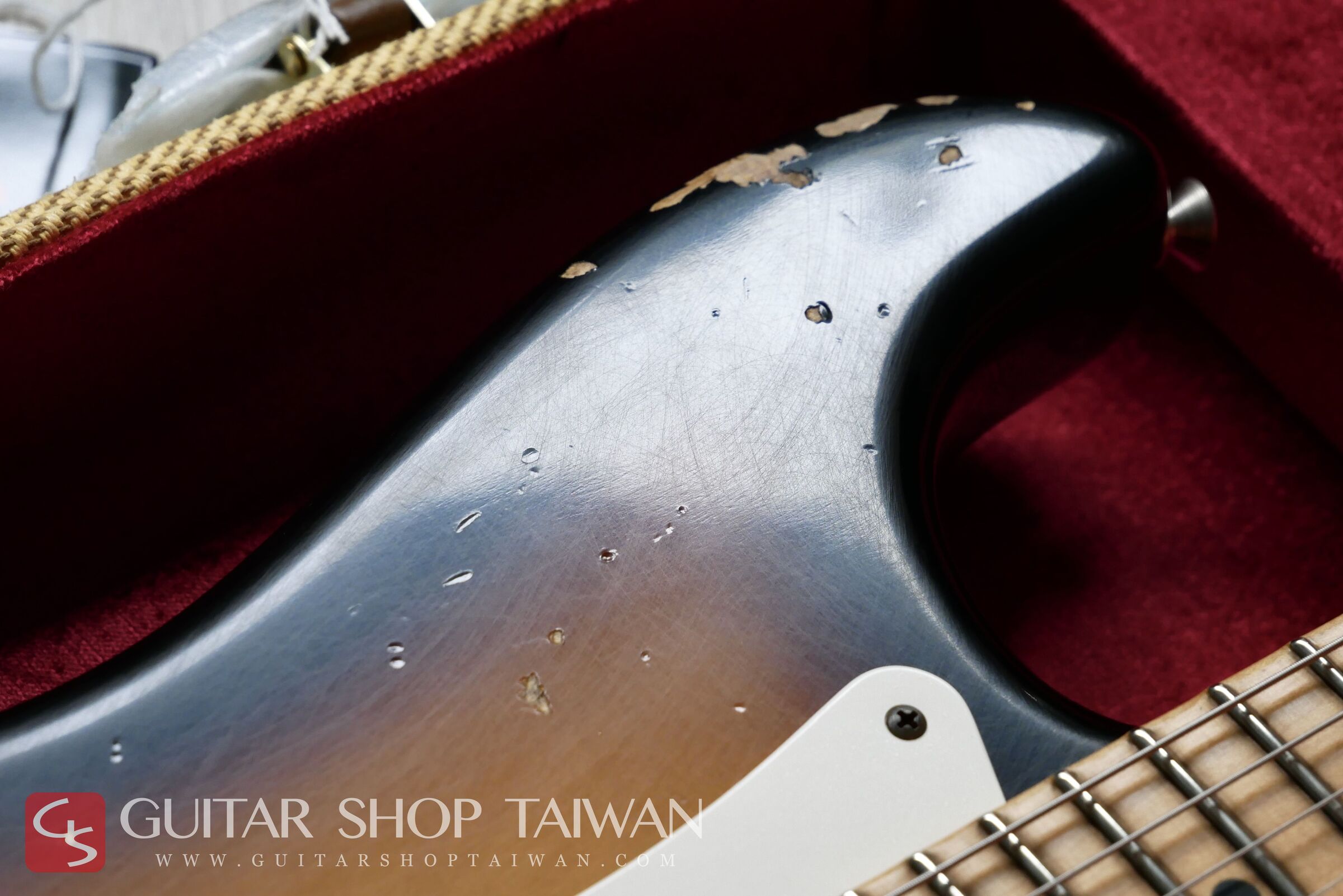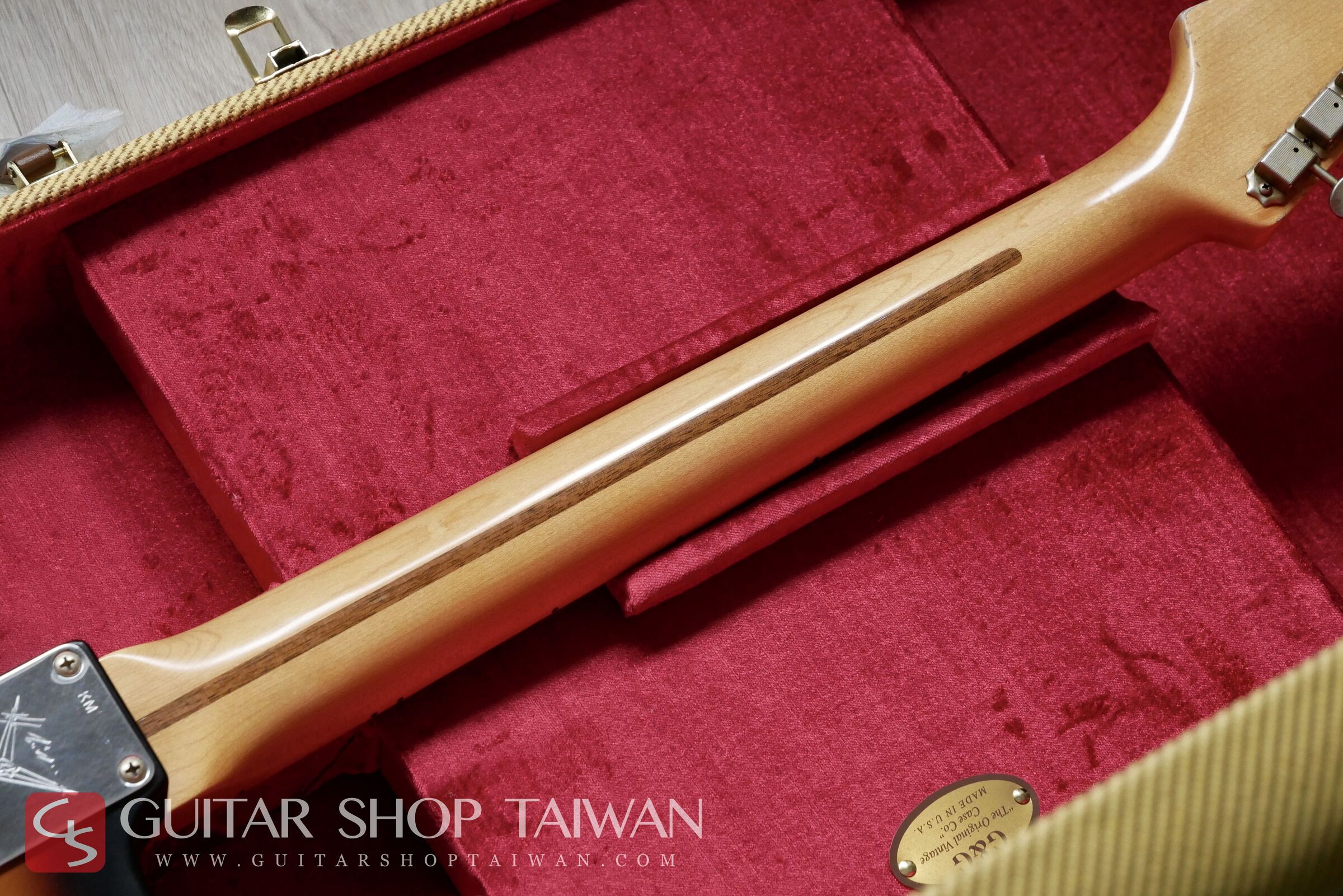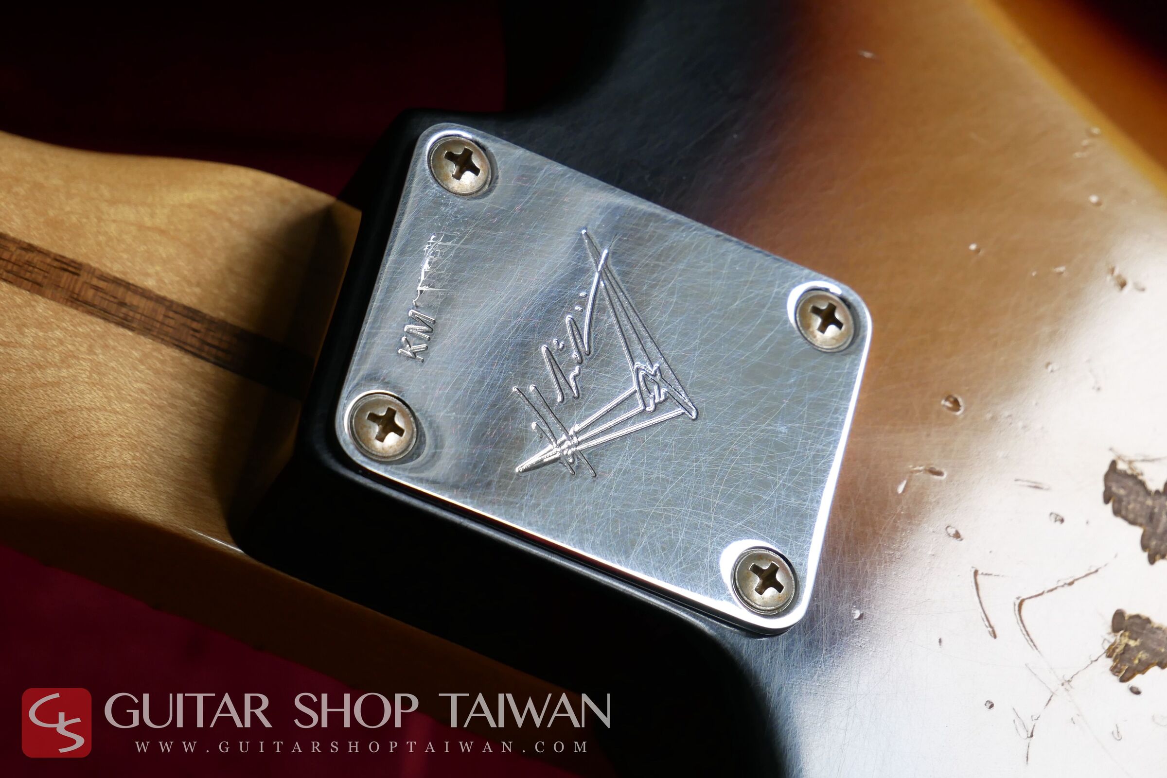 這是復刻Fender傳奇又經典的1957年Stratocaster。琴身為手選的Alder,搭配Two Tone Sunburst的經典配色,加上Kyle Mcmillin細膩Relic舊化,非常有質感。採用了’57 Solt V型楓木琴頸、9.5” to 14” Compound Radius複合弧度指板、Medium Jumbo Frets,拾音器搭配一組手繞的Hand Wound Fat 50’s Relic Strat Bridge/Neck與RWRP ’56 Relic Strat Middle Pickup,共五段音色切換。