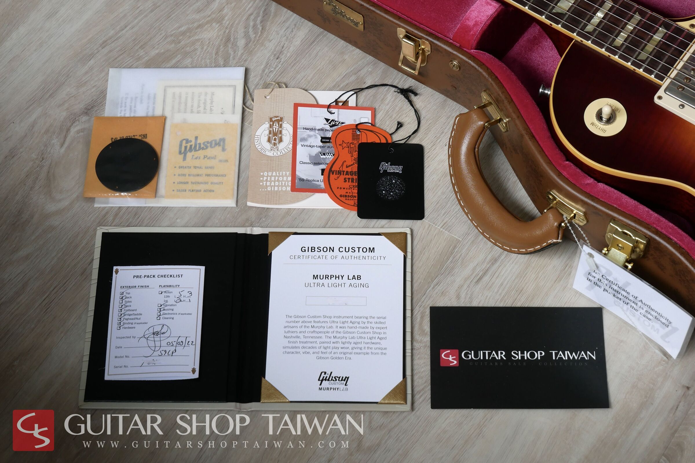 Ultra Light Aged是舊化程度最輕微的,表漆佈滿輕微的自然裂紋,沒有過於誇張的磨損,加上接近Joe Perry 1959 Les Paul的經典Southern Fade Burst,就像是保存良好未褪色的元年1959 Les Paul Standard一樣。Murphy Lab採用全新升級改版最高復刻規格,這是被原廠譽為是Gibson最好、最復古的規格,且在市場上的評價相當高,改版後的復刻系列加入了多年來Collector's Choice與True Historic頂規系列的研究成果,從3D掃描的Top弧度以及琴頸規格和利用化學重建的塑膠料件,當然也包含了近年來一直使用的Hide Glue。