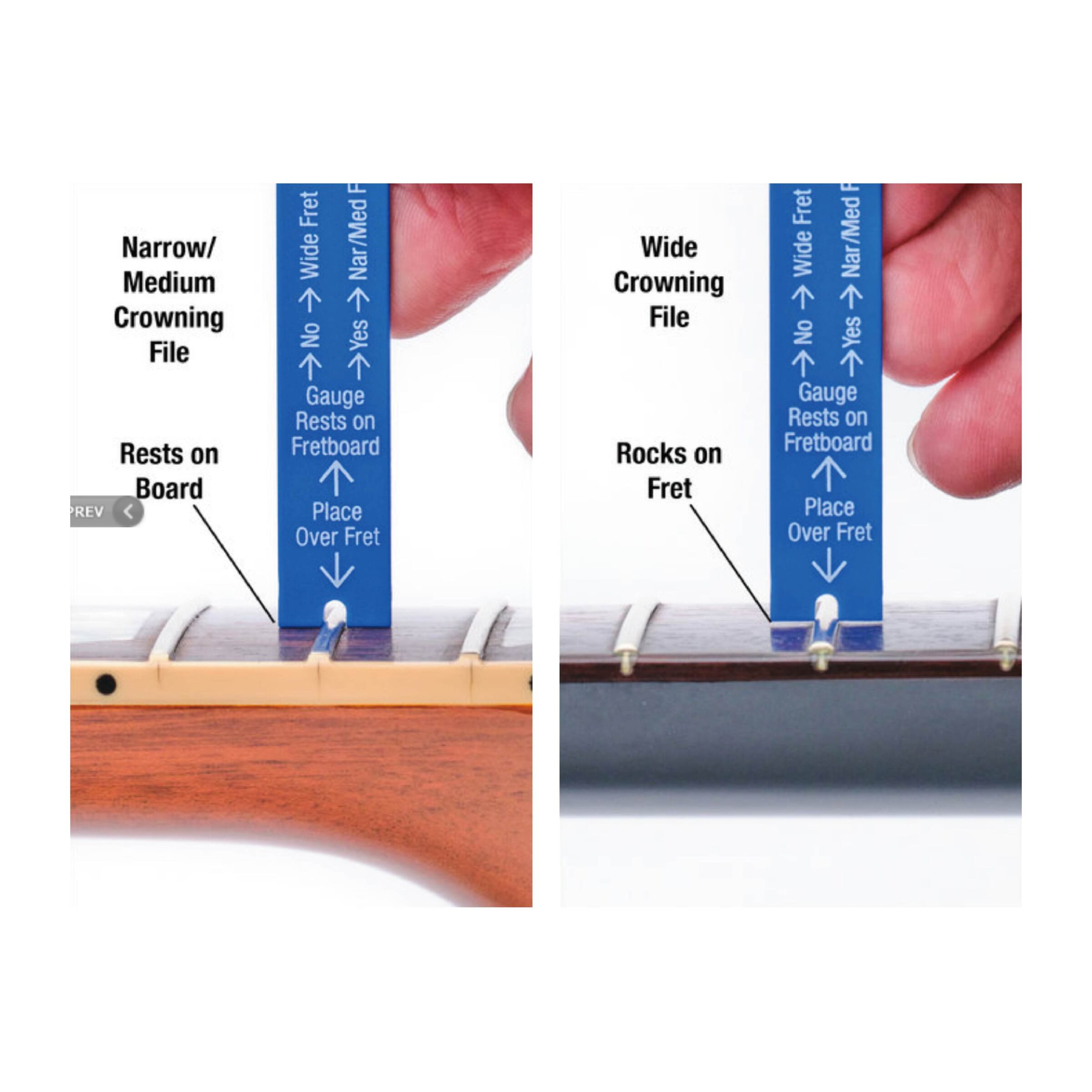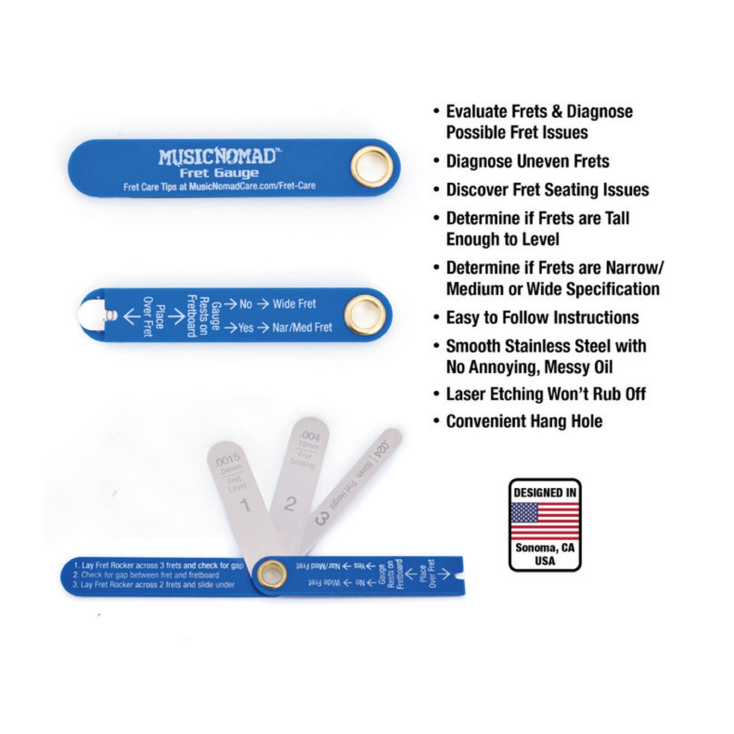 適用於電吉他、原聲吉他、古典吉他和貝司吉他,手柄上印有激光蝕刻標記和說明,並可與 MusicNomad 的 Fret Rocker+ 品絲水平尺配合使用。