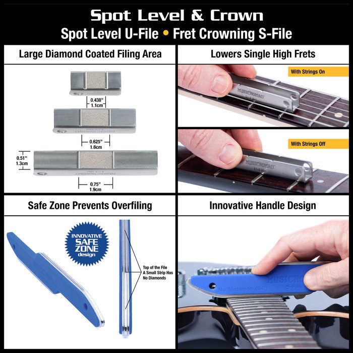 此工具組包含診斷、單點校準、琴品打冠和拋光的所有必要工具,並能修復吉他琴品的突出和鋒利邊緣。