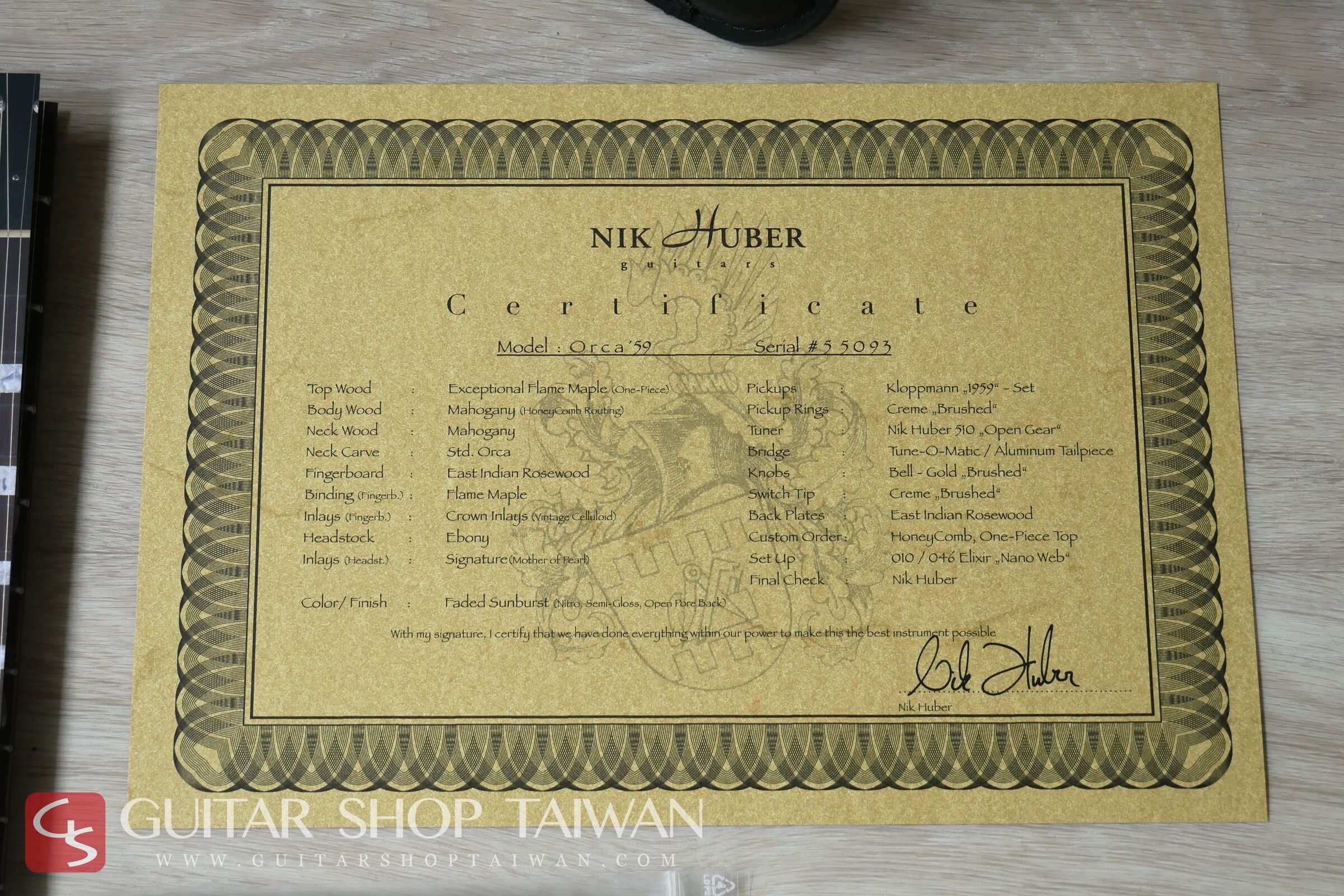 售價NT$358,000,附Nik Huber原廠Case、證書、配件與Guitar Shop Taiwan專屬保固卡。本公司商品都經過嚴格檢驗與專業調整,一年保固、免費保養與完整的售後服務,安全有保障。歡迎刷卡、分期付款 (刷卡與分期服務僅限線上)。