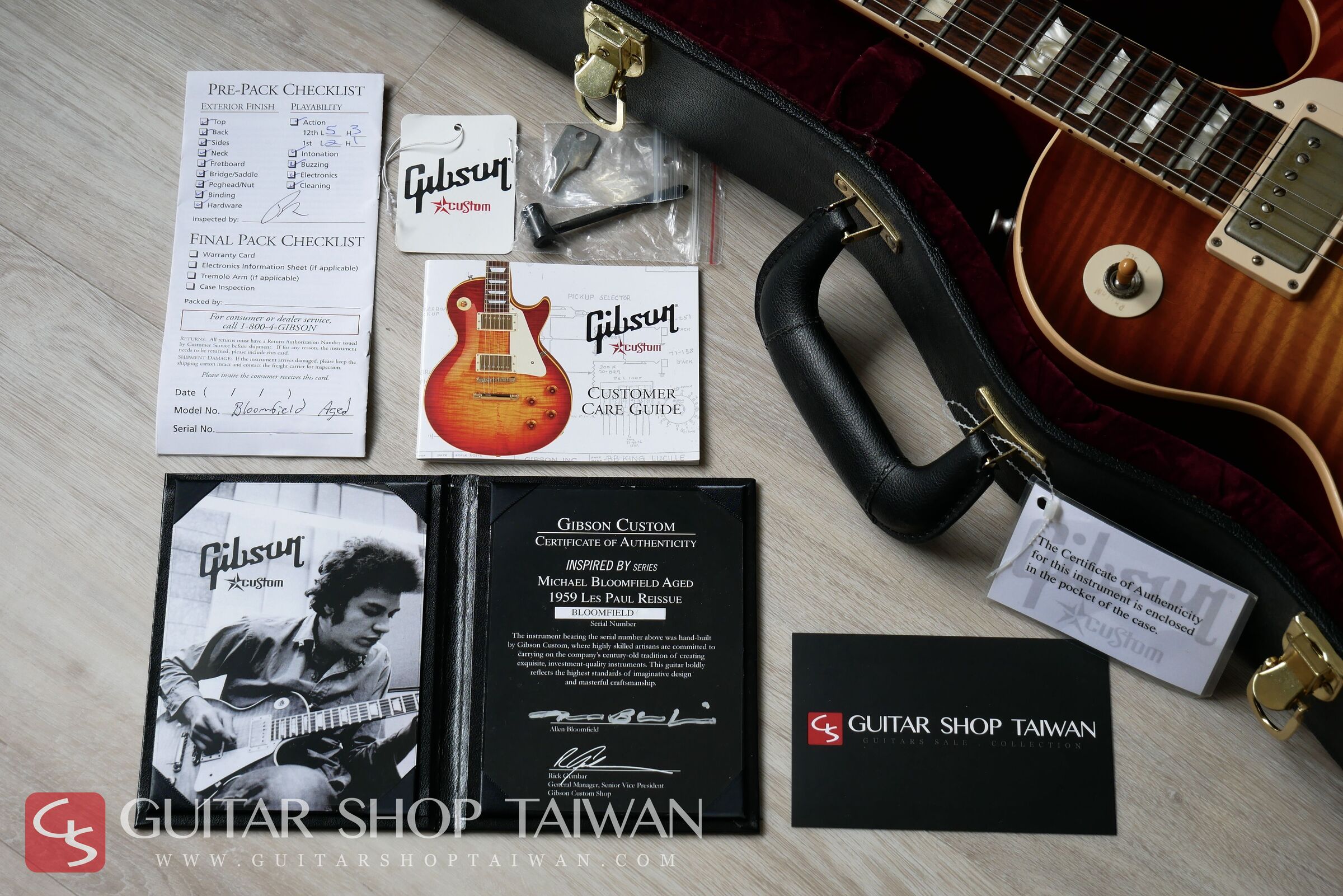 稀有夢幻琴款,全球限量100支,這是Gibson Custom於2009年發表的限量舊化琴款,這是少數由Gibson傳奇技師Tom Murphy親手操刀的復刻簽名琴,復刻已故藍調傳奇吉他手Michael Bloomfield手中的1959 Les Paul Standard。這把傳奇的Les Paul在1974至1975年間遺失了,至今下落不明。