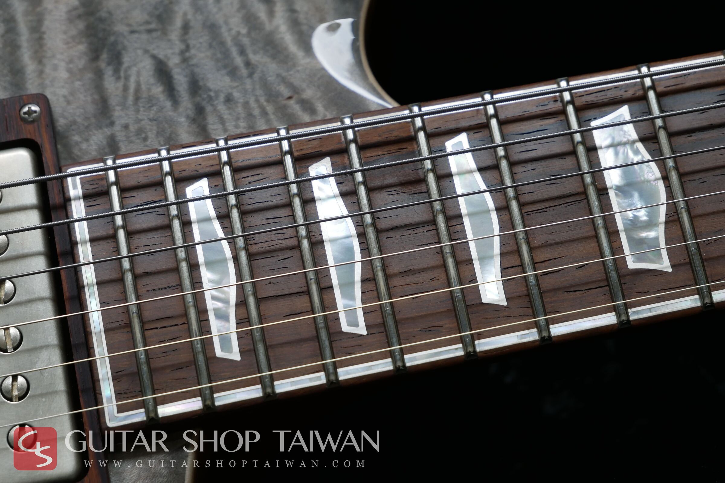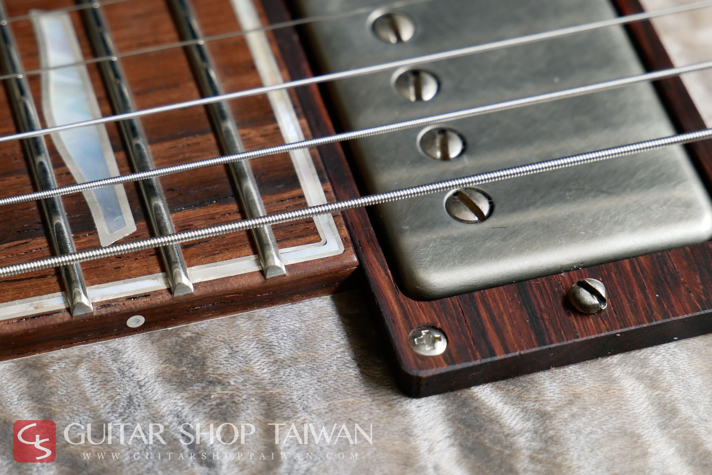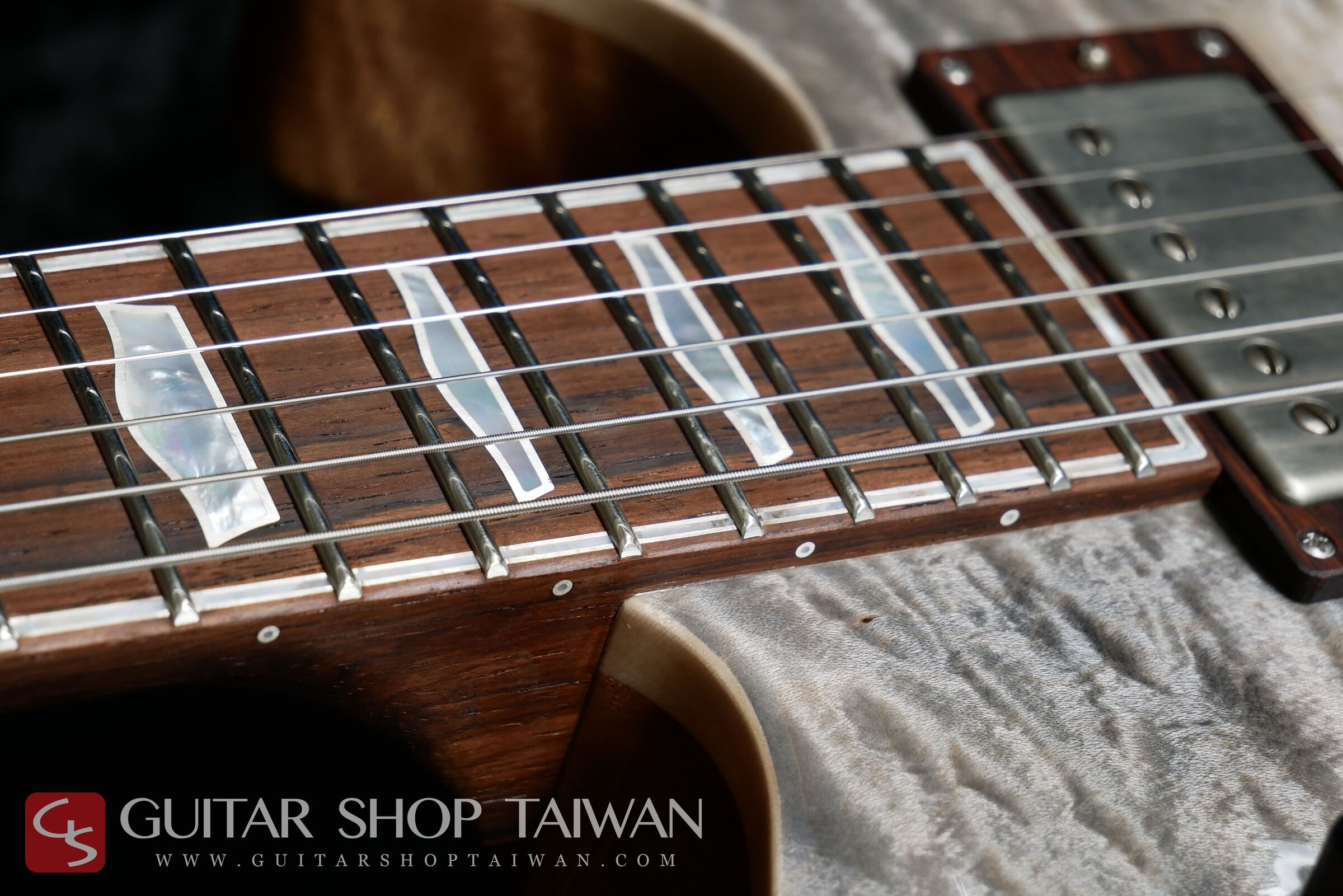 25週年紀念版除了選用頂級木料之外,還具備一項極具代表性的特色細節「Purfling」鑲嵌工藝。不同於以往週年紀念版在琴身上鑲嵌大型動物圖案,此次週年款選擇用更多細節來展現他們的鑲嵌工藝。從指板、琴頭正反面、Truss Rod 蓋板、以及背蓋,皆鑲嵌了一整圈無接縫的白珍珠貝與純銀粉,整個工序非常繁複,內圈為0.5mm的白珍珠貝,整圈無切割,外圈是0.5mm純銀粉鑲邊,而25週年版本的Crowns Inlay邊緣以及琴頭Logo邊緣,也都有著更細的0.25mm純銀粉鑲邊,這些全數由團隊工匠手工一點一滴嵌入,過程極為耗時與精密,而這樣細膩的鑲嵌工藝,也完美展現了 Nik Huber 團隊卓越的手工水準,使整把吉他就像是藝術品一樣。