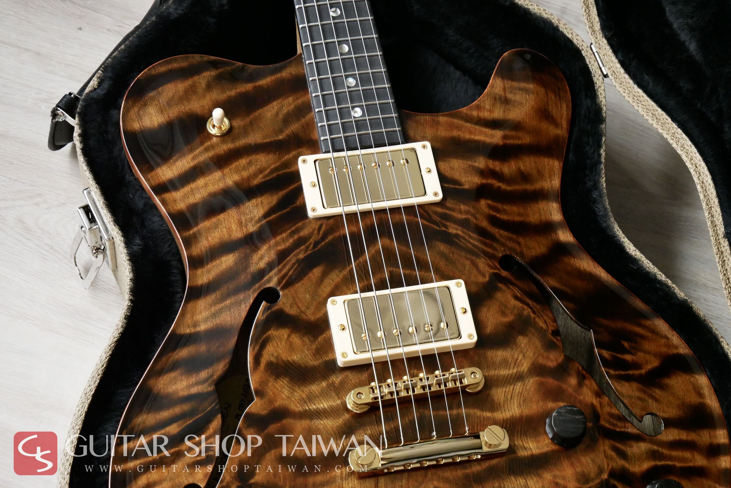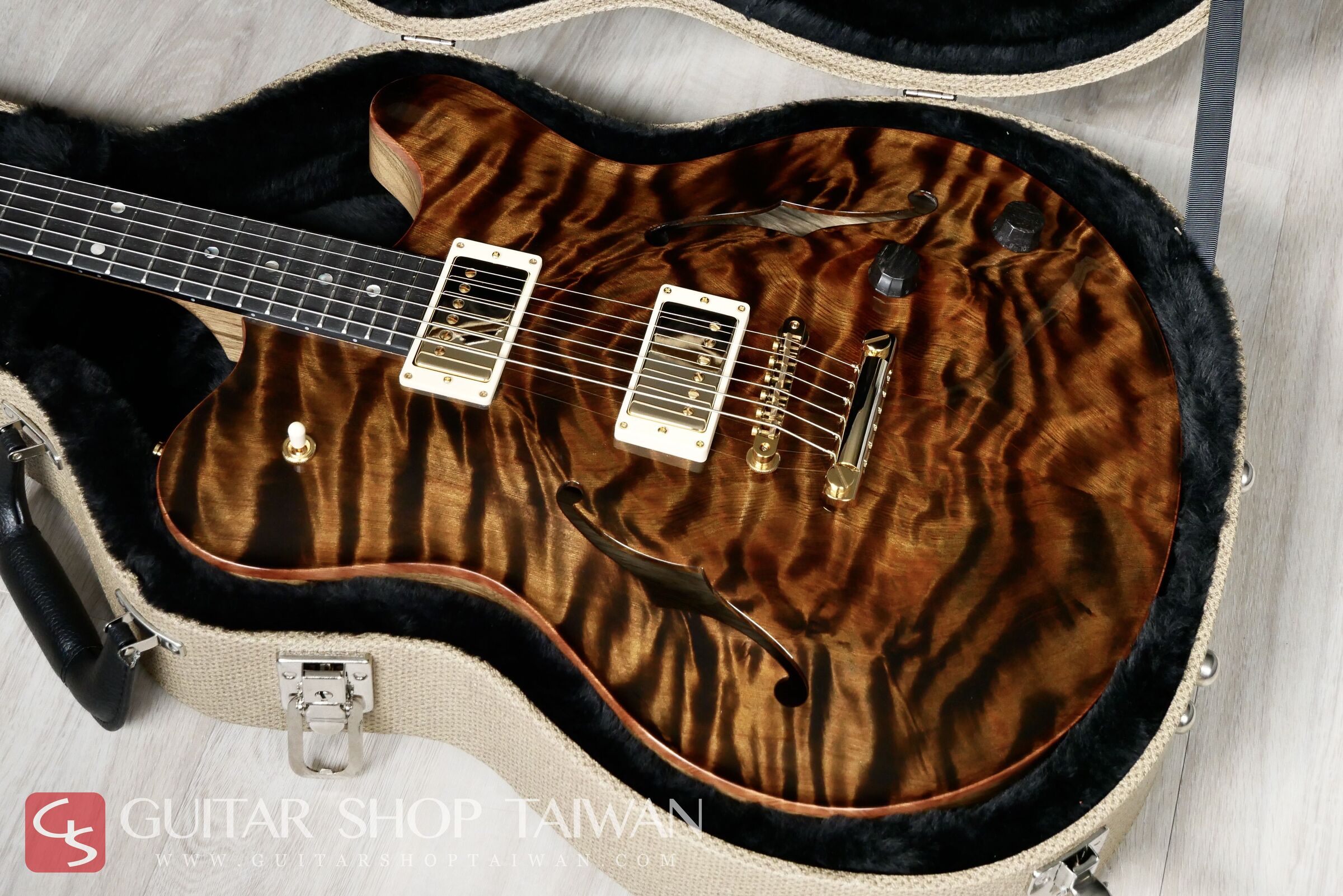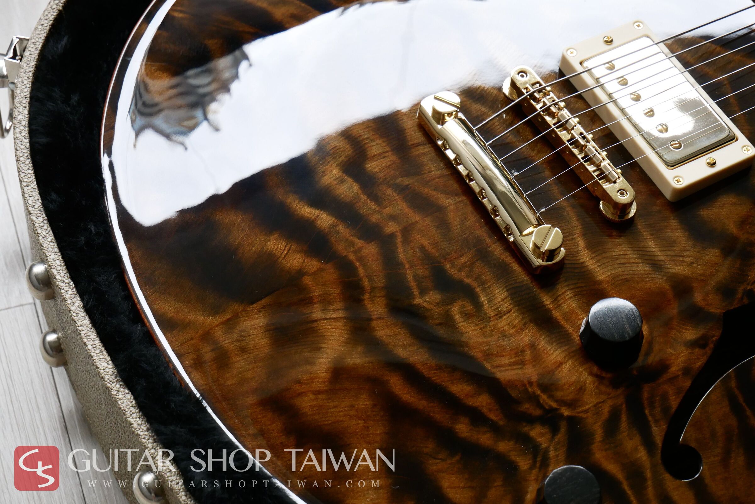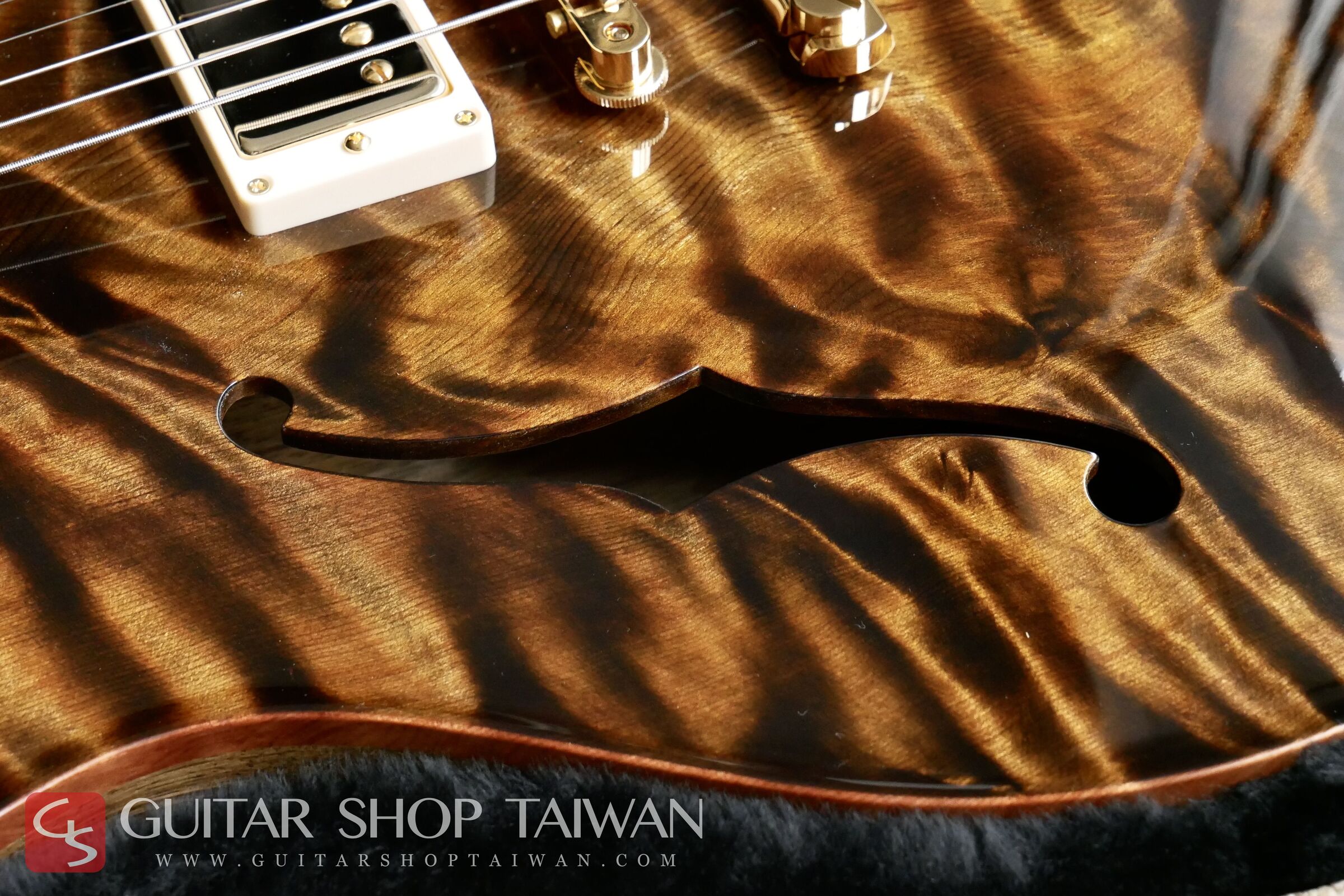 這把吉他以半空心結構為基礎,半空心的結構賦予音色更多延展性與動態反應,使每一個音符都帶有自然的共鳴與生命力。而琴身外觀線條優雅,立體弧面結合柔和的邊緣修飾,每一個角度都散發著無可取代的工藝美感。琴身與琴頸選用嚴選的 One-piece Black Limba,琴面搭配嚴選5A等級的Curly Redwood Top (加價升級),完美的虎紋Top加上精緻手工上色的Custom Color Tigereye,就像是在Top上鋪上一層真正的老虎皮一樣,指板為黑檀木,整把琴音色除了溫暖厚實,更多了清晰的空氣感。