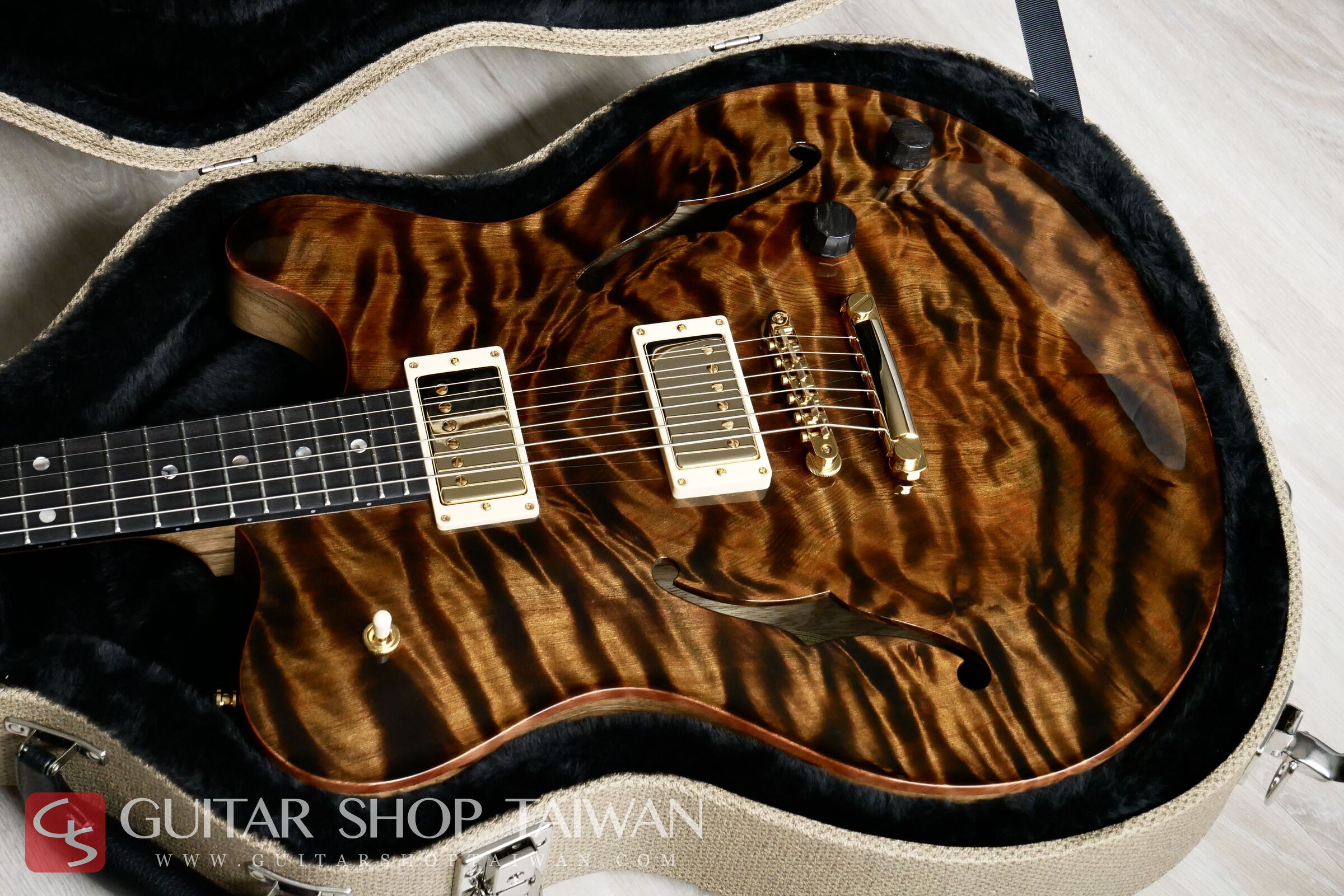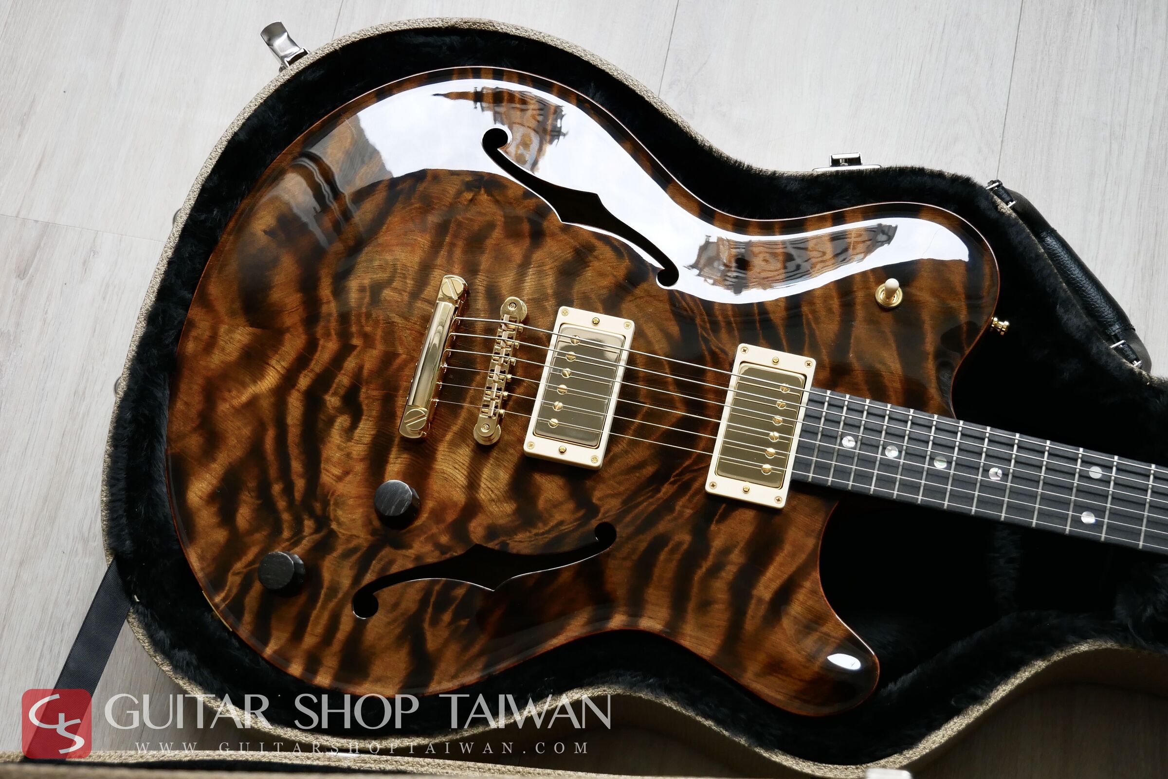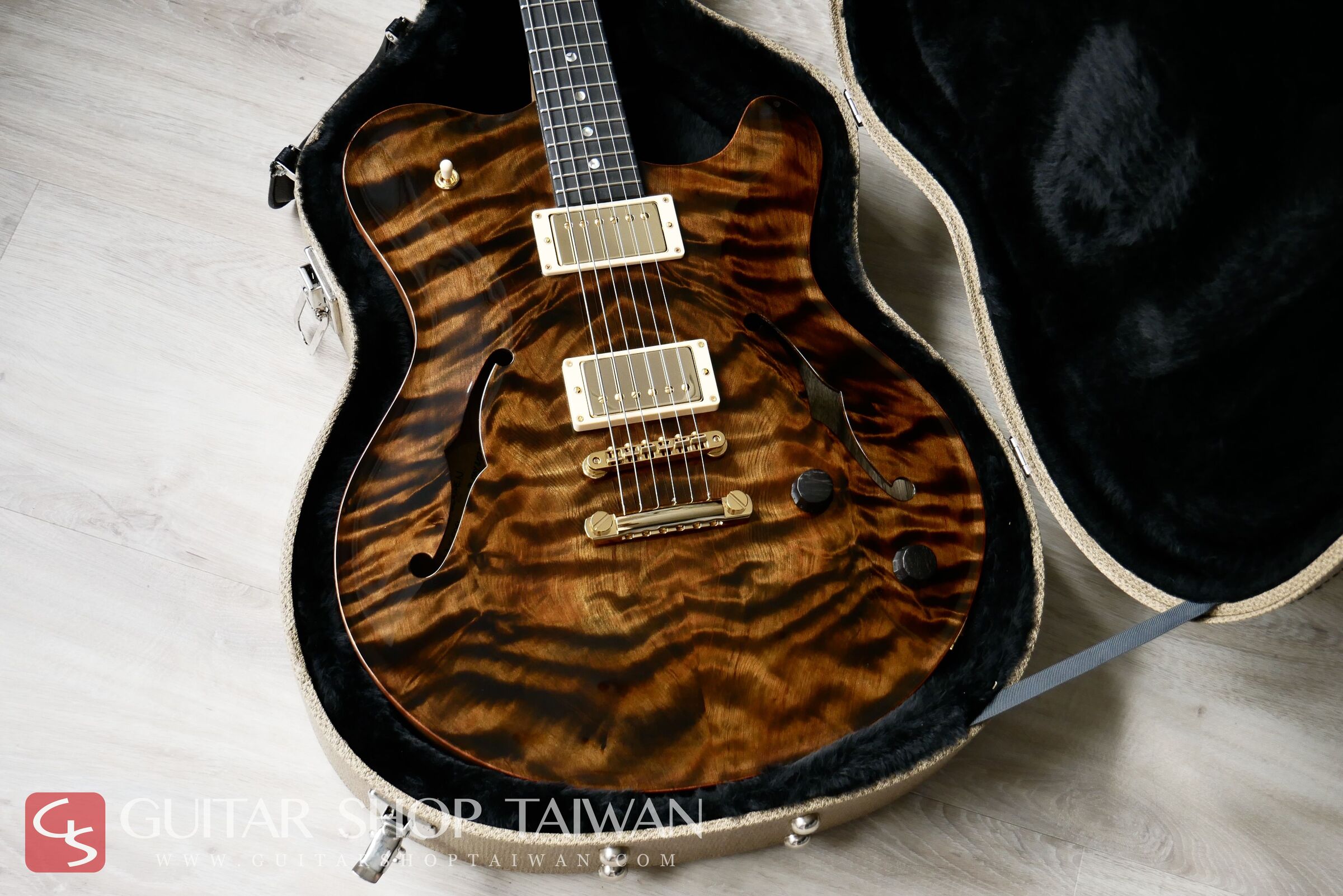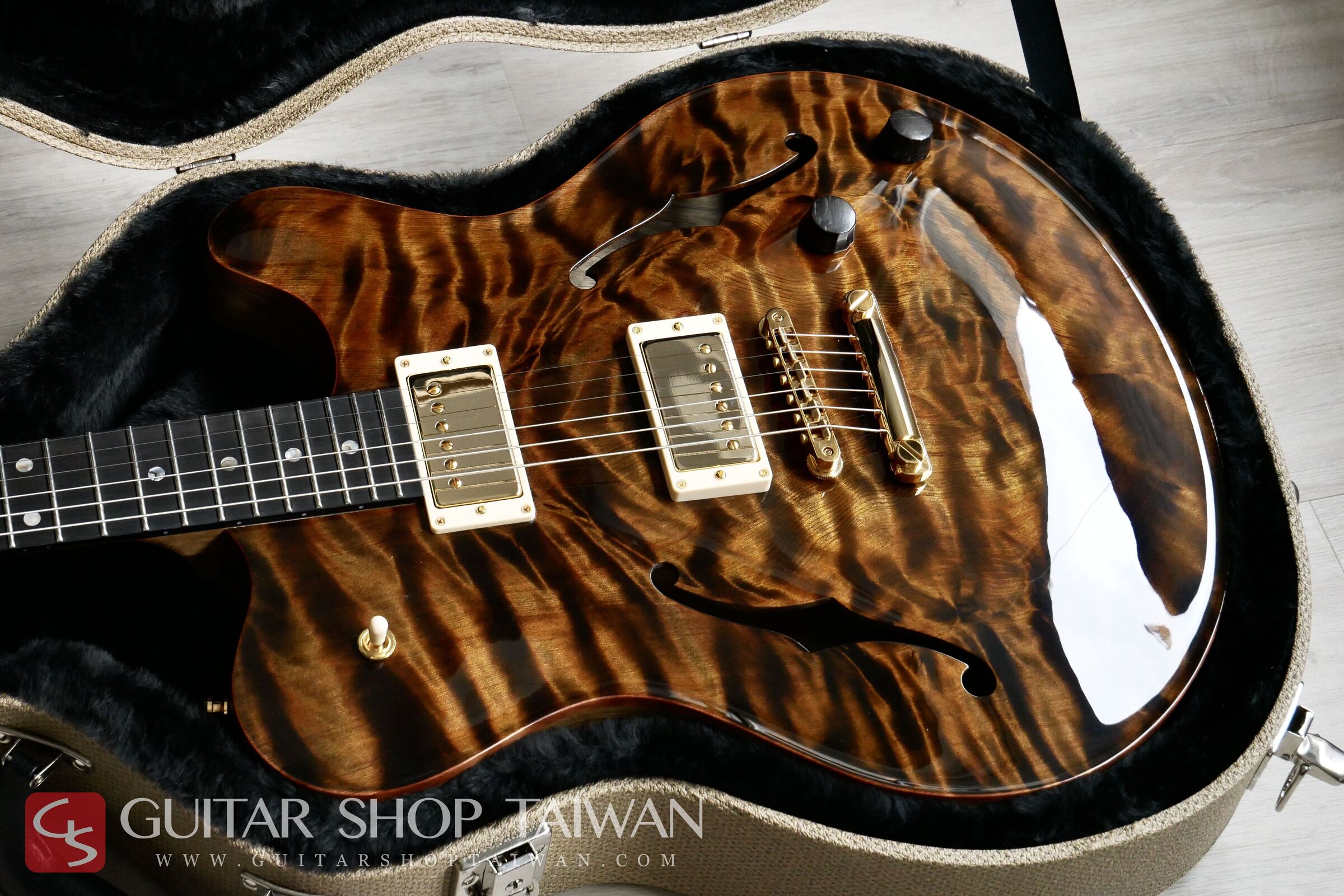 這把吉他以半空心結構為基礎,半空心的結構賦予音色更多延展性與動態反應,使每一個音符都帶有自然的共鳴與生命力。而琴身外觀線條優雅,立體弧面結合柔和的邊緣修飾,每一個角度都散發著無可取代的工藝美感。琴身與琴頸選用嚴選的 One-piece Black Limba,琴面搭配嚴選5A等級的Curly Redwood Top (加價升級),完美的虎紋Top加上精緻手工上色的Custom Color Tigereye,就像是在Top上鋪上一層真正的老虎皮一樣,指板為黑檀木,整把琴音色除了溫暖厚實,更多了清晰的空氣感。