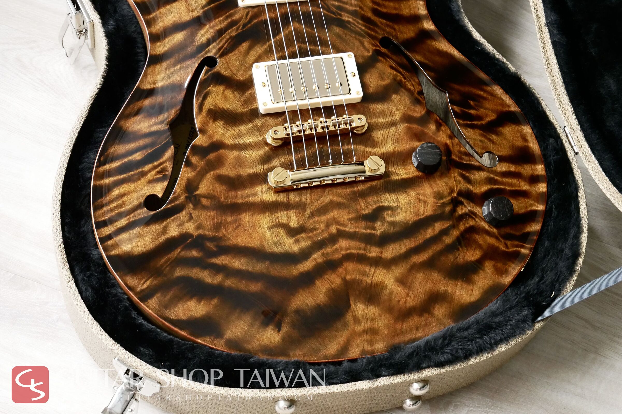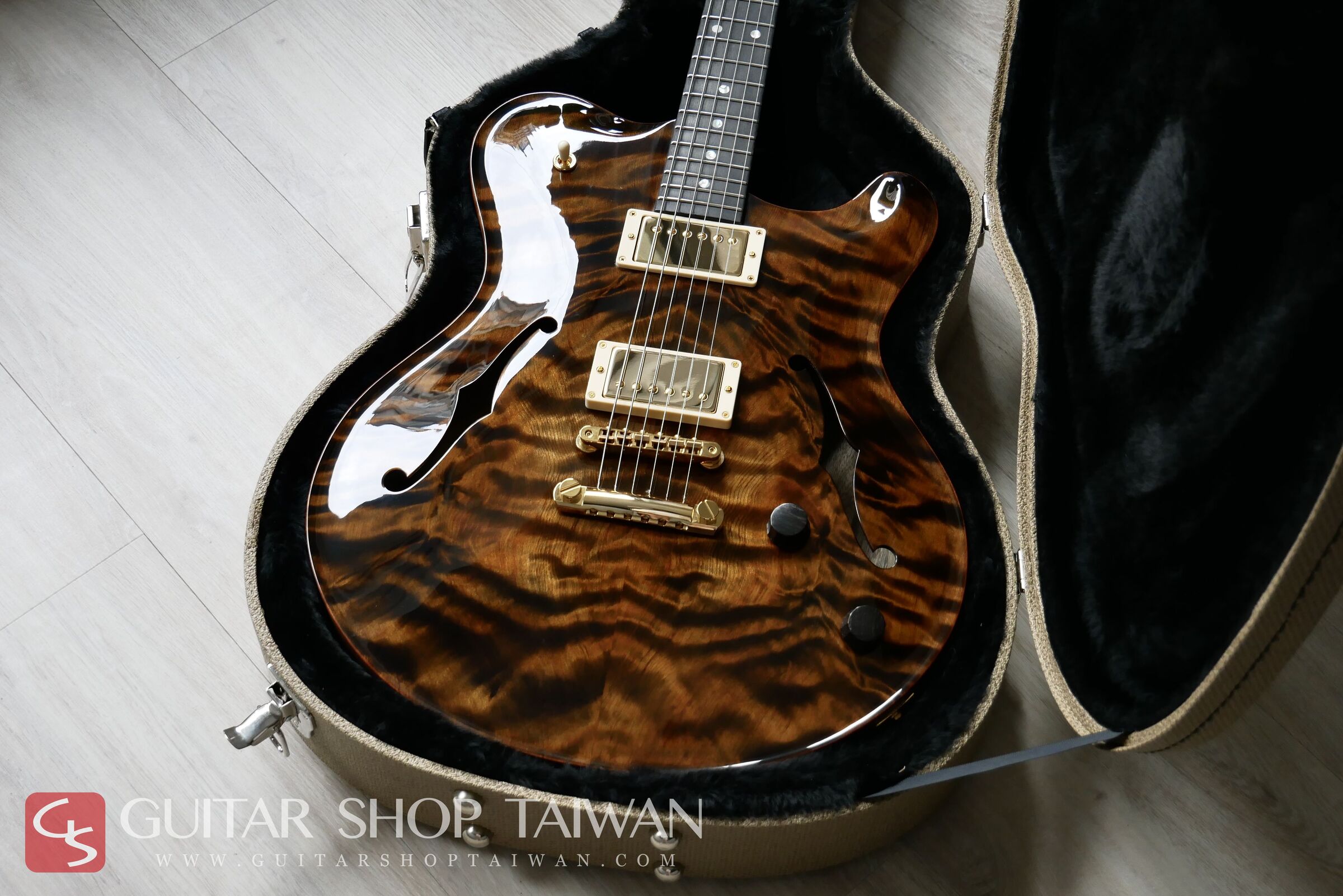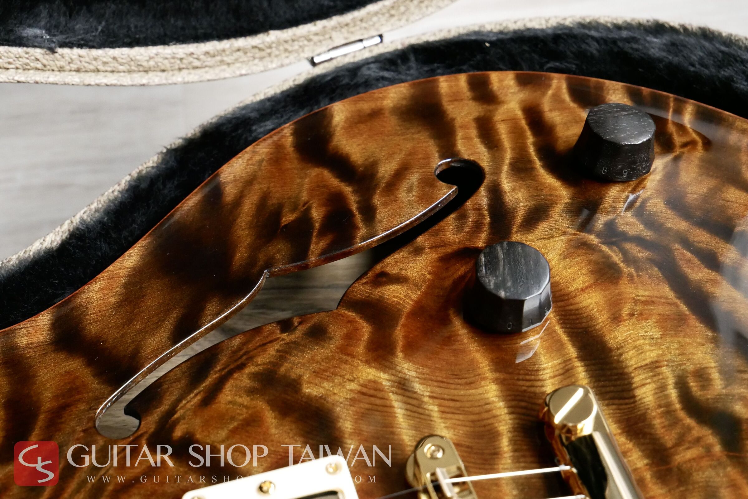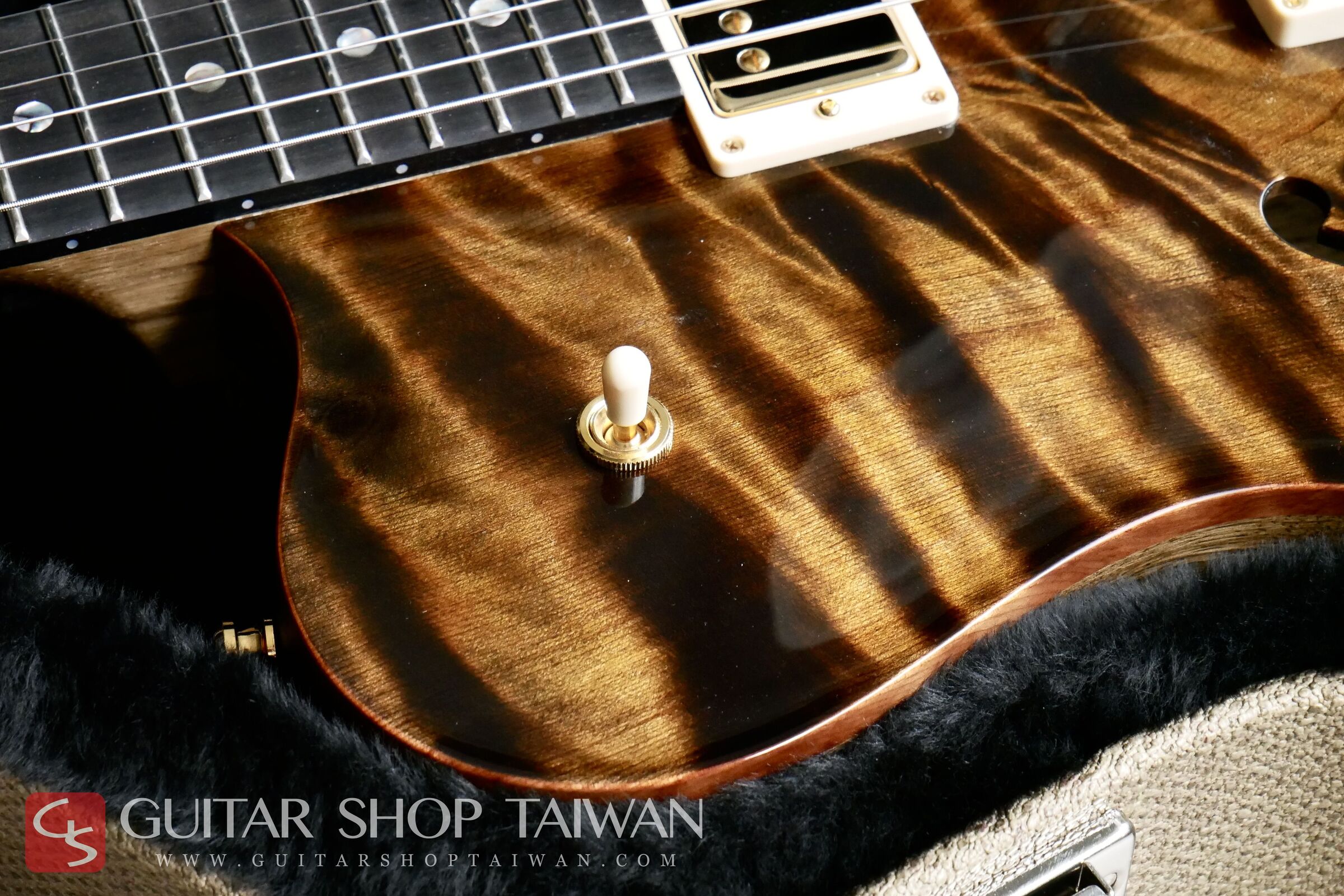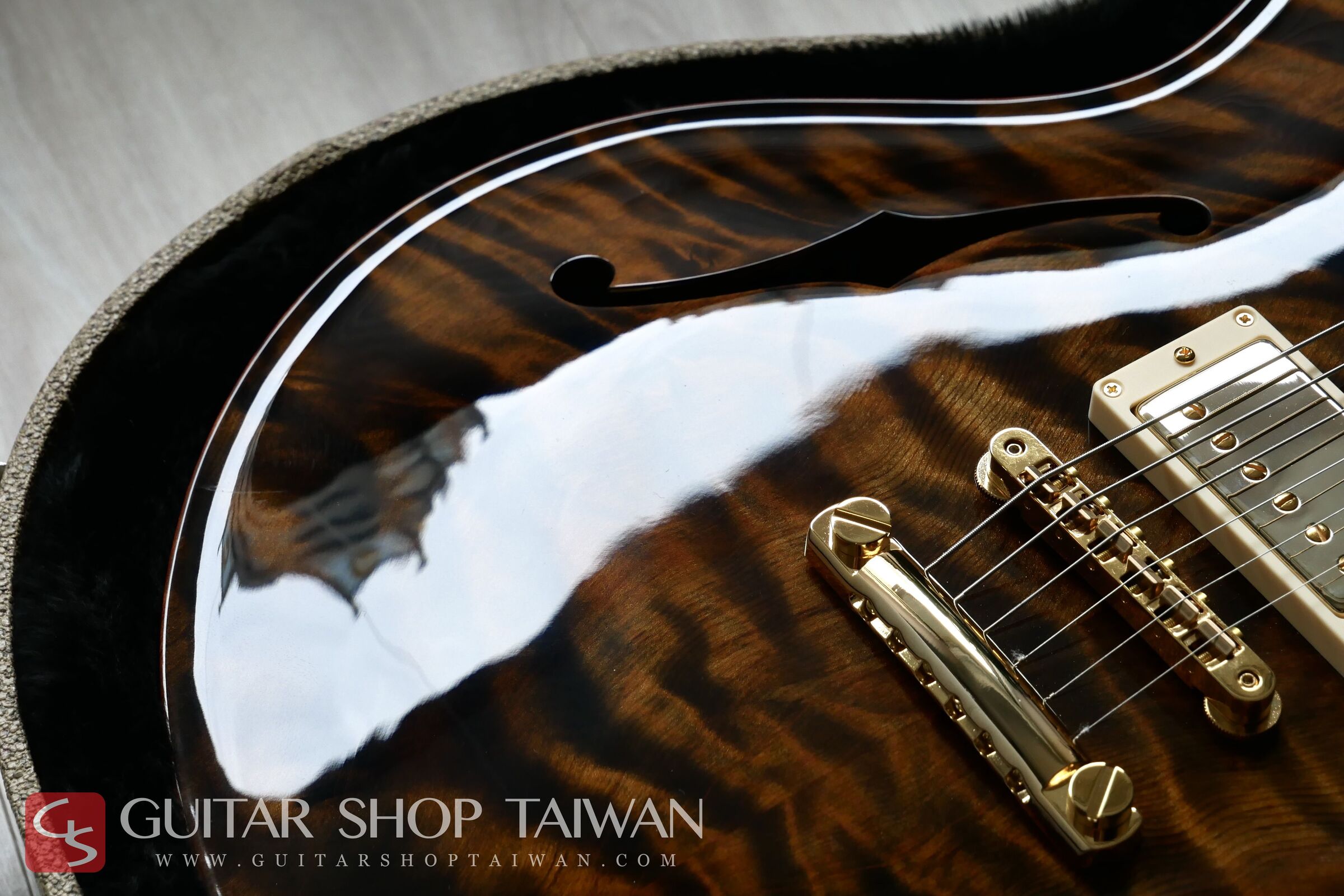 這把吉他以半空心結構為基礎,半空心的結構賦予音色更多延展性與動態反應,使每一個音符都帶有自然的共鳴與生命力。而琴身外觀線條優雅,立體弧面結合柔和的邊緣修飾,每一個角度都散發著無可取代的工藝美感。琴身與琴頸選用嚴選的 One-piece Black Limba,琴面搭配嚴選5A等級的Curly Redwood Top (加價升級),完美的虎紋Top加上精緻手工上色的Custom Color Tigereye,就像是在Top上鋪上一層真正的老虎皮一樣,指板為黑檀木,整把琴音色除了溫暖厚實,更多了清晰的空氣感。