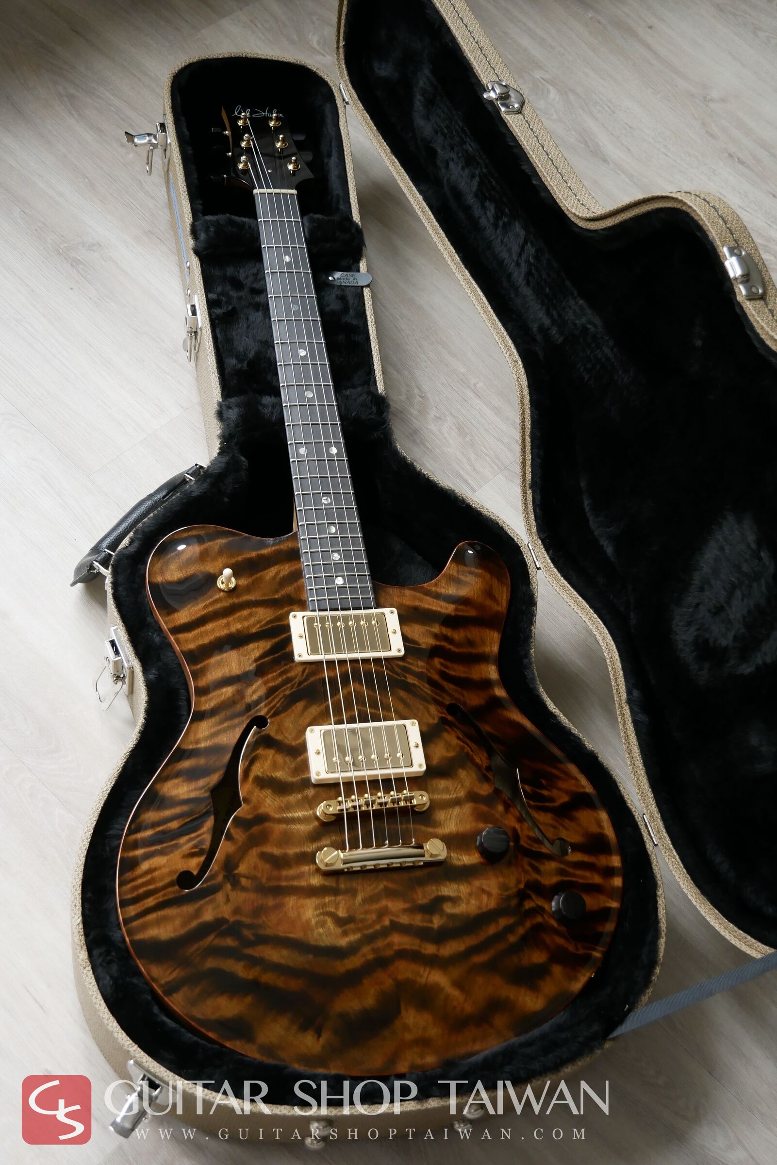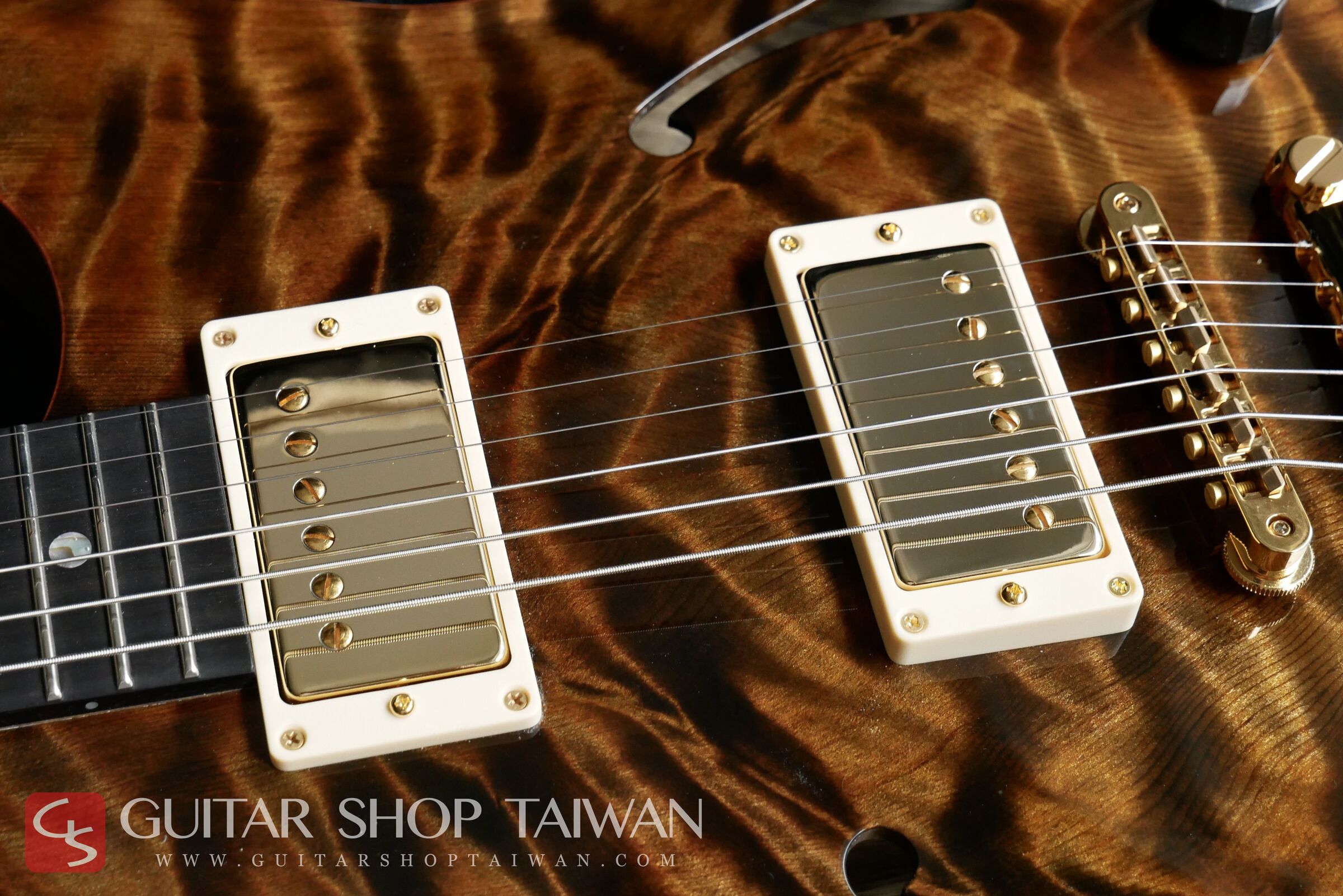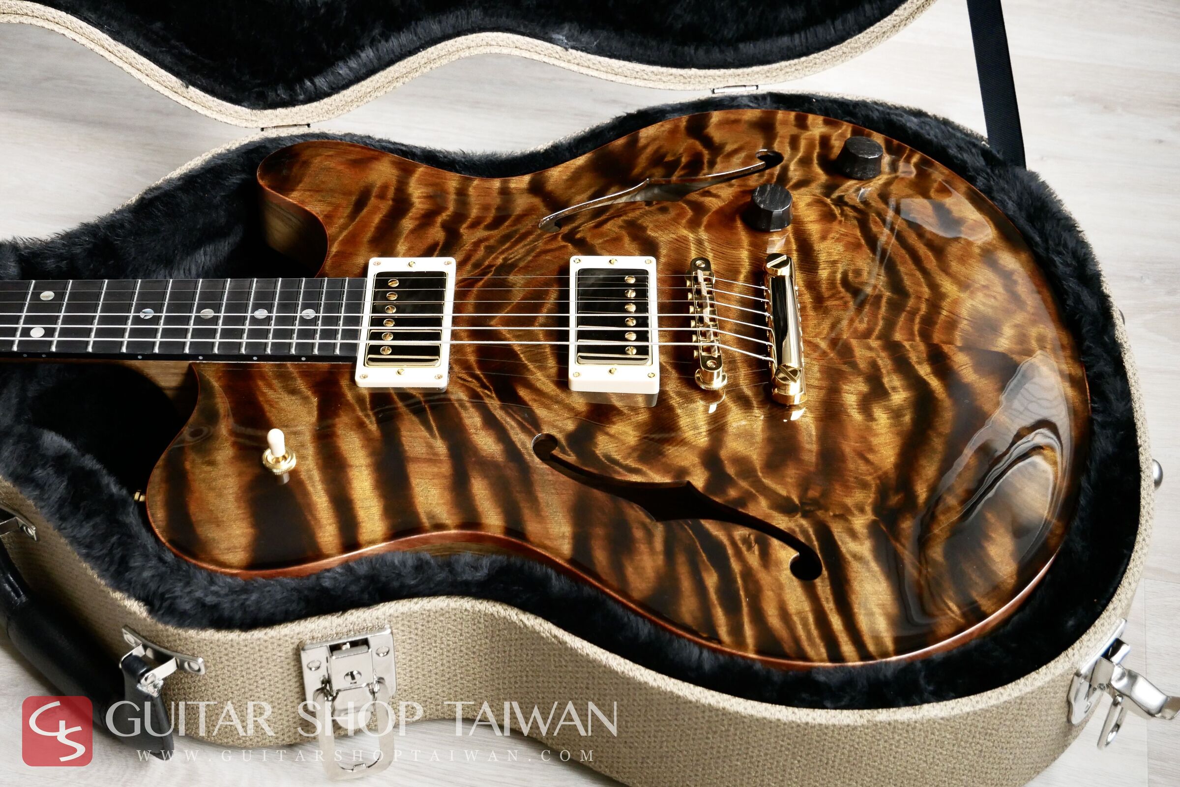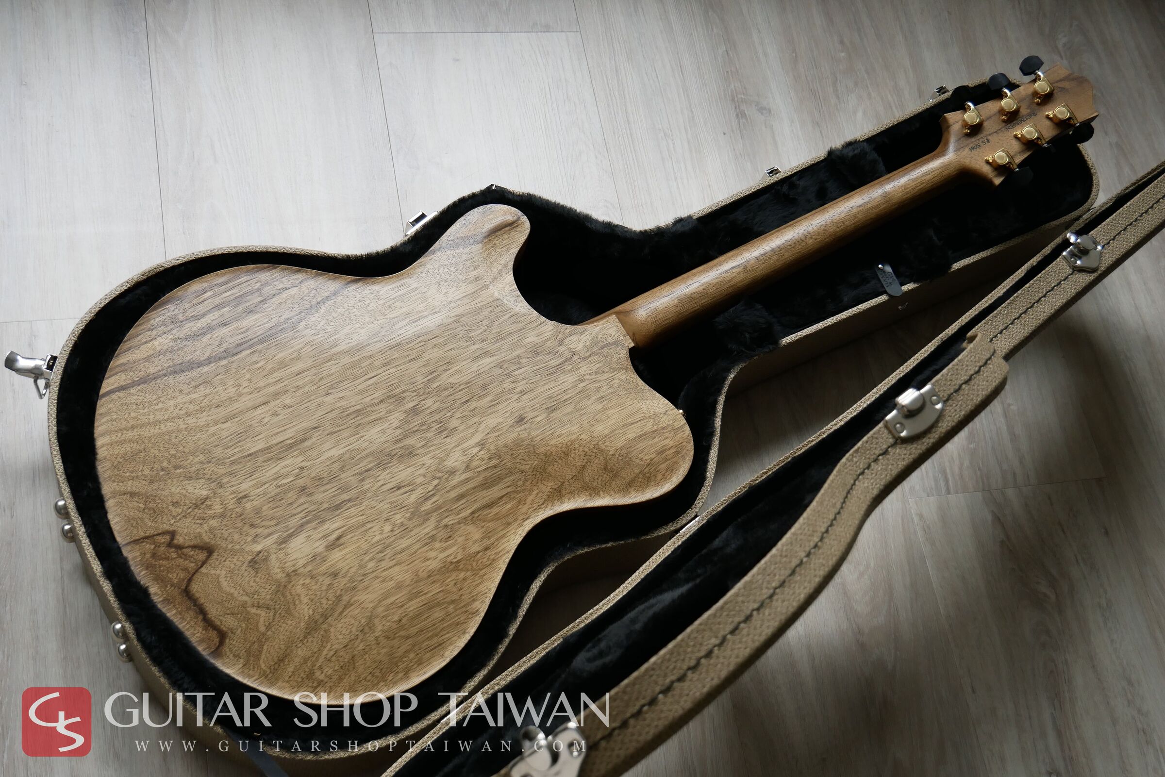 這把吉他以半空心結構為基礎,半空心的結構賦予音色更多延展性與動態反應,使每一個音符都帶有自然的共鳴與生命力。而琴身外觀線條優雅,立體弧面結合柔和的邊緣修飾,每一個角度都散發著無可取代的工藝美感。琴身與琴頸選用嚴選的 One-piece Black Limba,琴面搭配嚴選5A等級的Curly Redwood Top (加價升級),完美的虎紋Top加上精緻手工上色的Custom Color Tigereye,就像是在Top上鋪上一層真正的老虎皮一樣,指板為黑檀木,整把琴音色除了溫暖厚實,更多了清晰的空氣感。