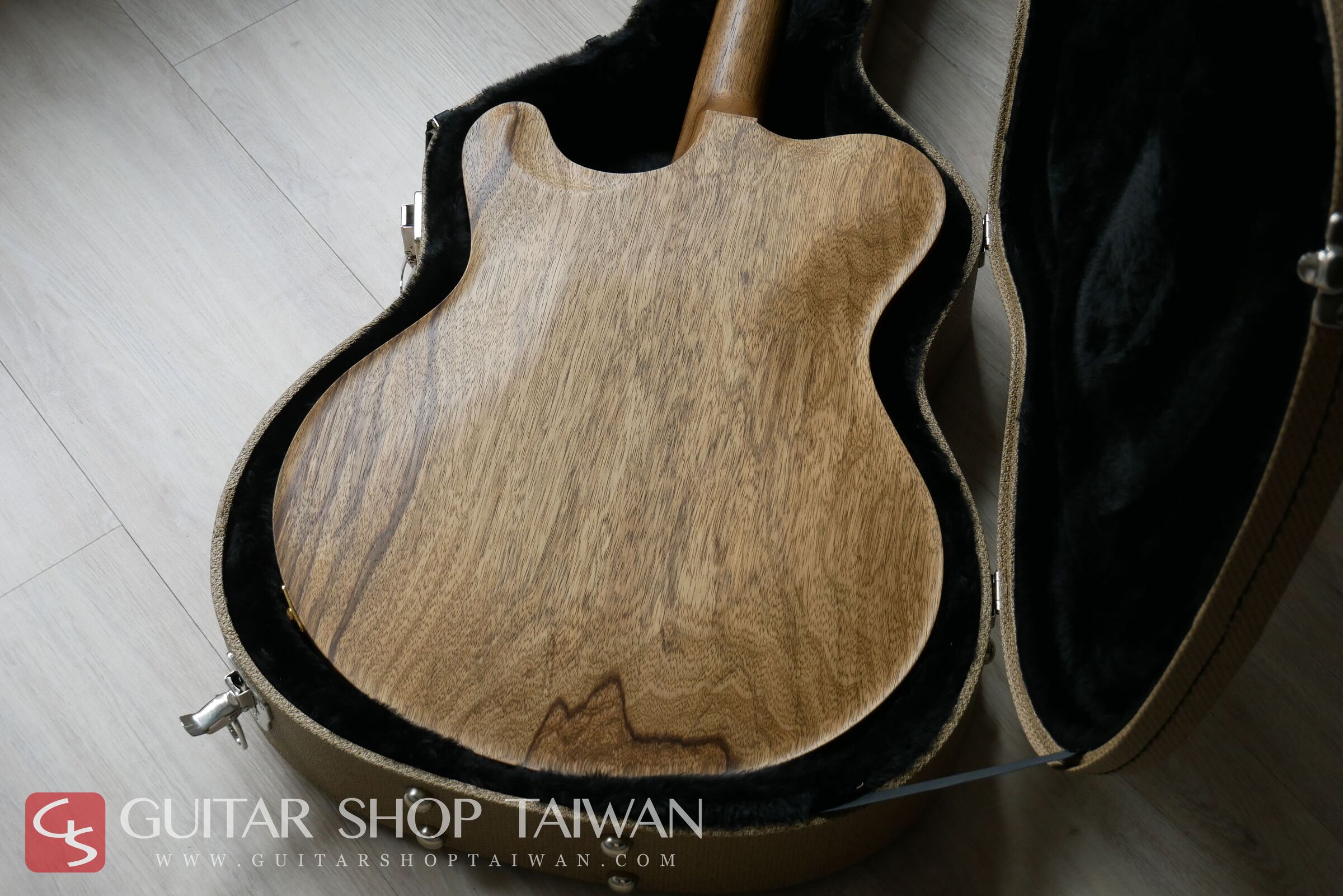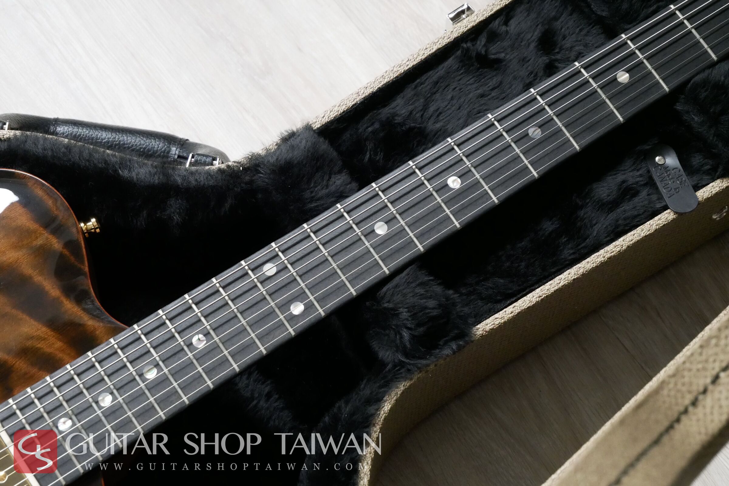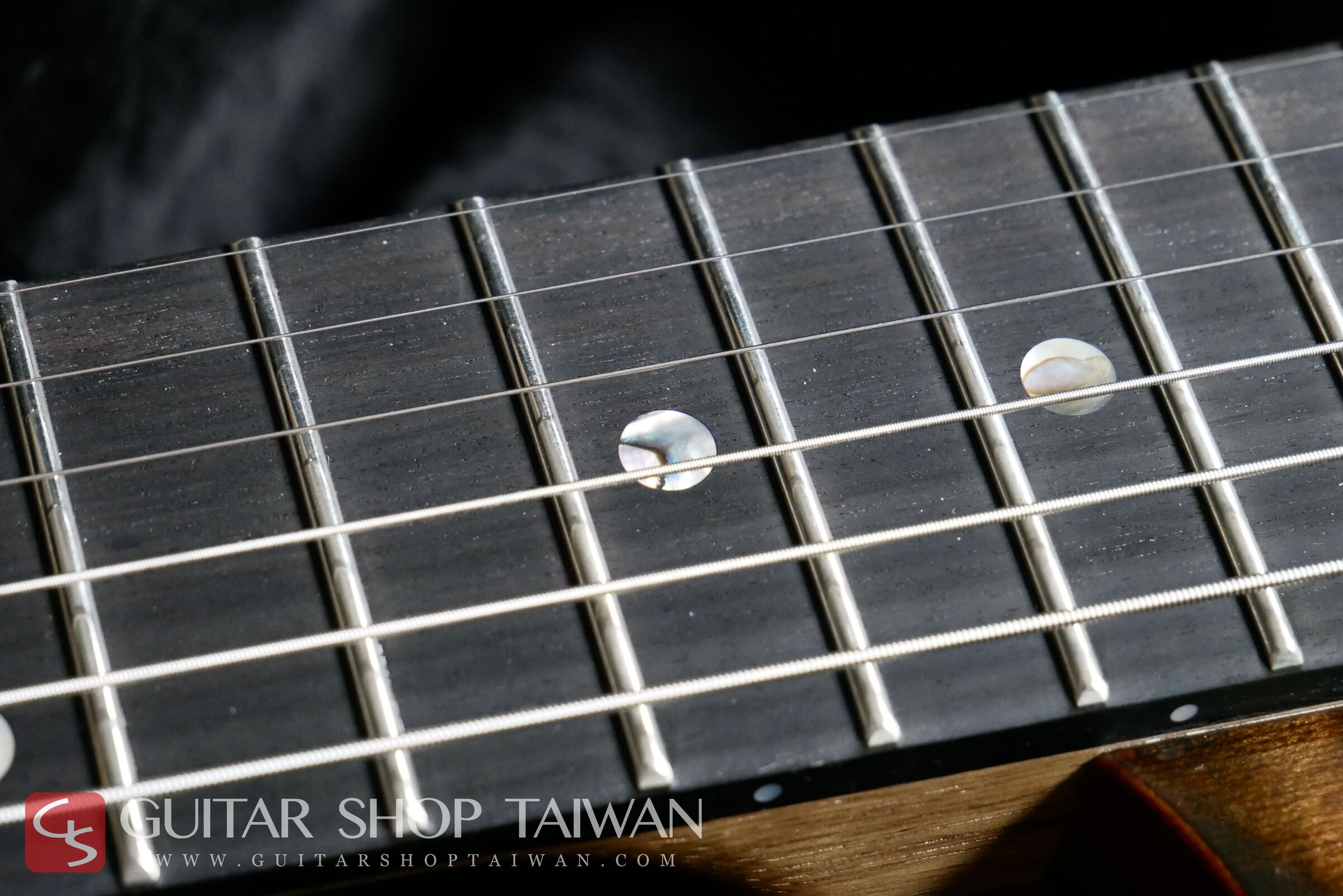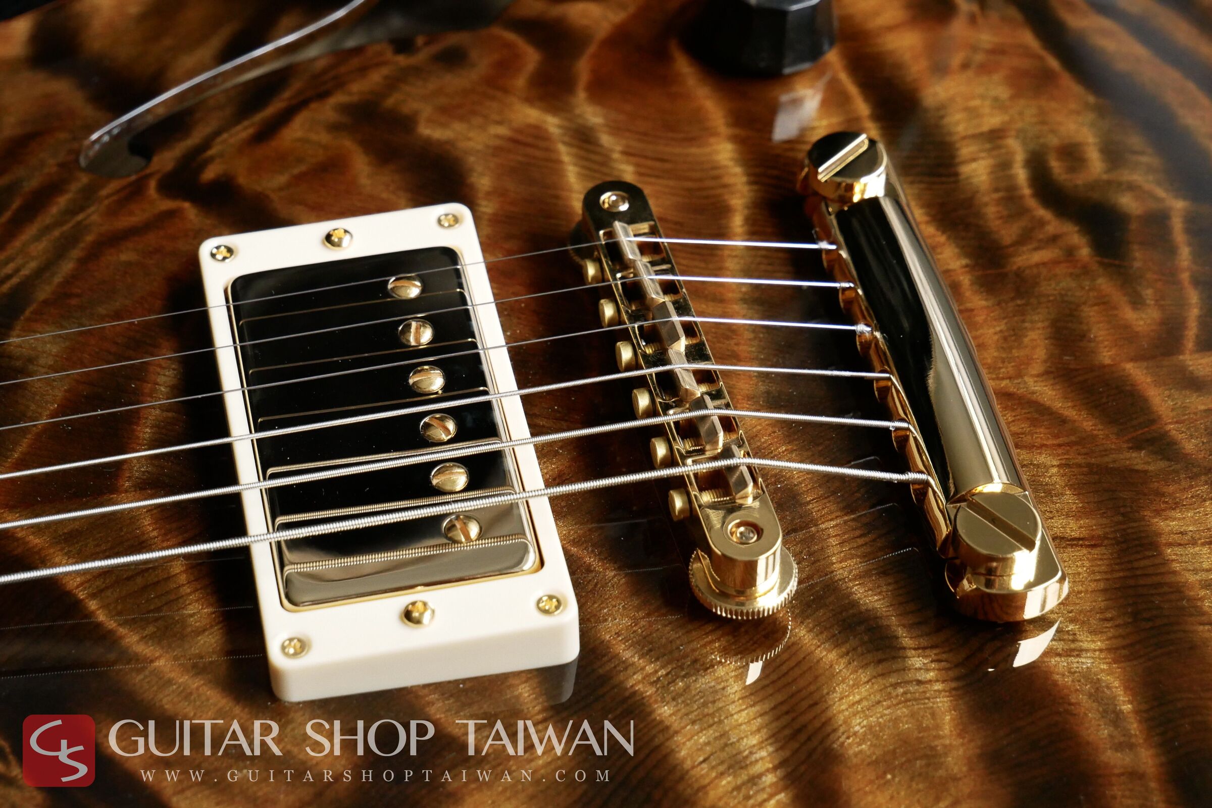 這把吉他以半空心結構為基礎,半空心的結構賦予音色更多延展性與動態反應,使每一個音符都帶有自然的共鳴與生命力。而琴身外觀線條優雅,立體弧面結合柔和的邊緣修飾,每一個角度都散發著無可取代的工藝美感。琴身與琴頸選用嚴選的 One-piece Black Limba,琴面搭配嚴選5A等級的Curly Redwood Top (加價升級),完美的虎紋Top加上精緻手工上色的Custom Color Tigereye,就像是在Top上鋪上一層真正的老虎皮一樣,指板為黑檀木,整把琴音色除了溫暖厚實,更多了清晰的空氣感。