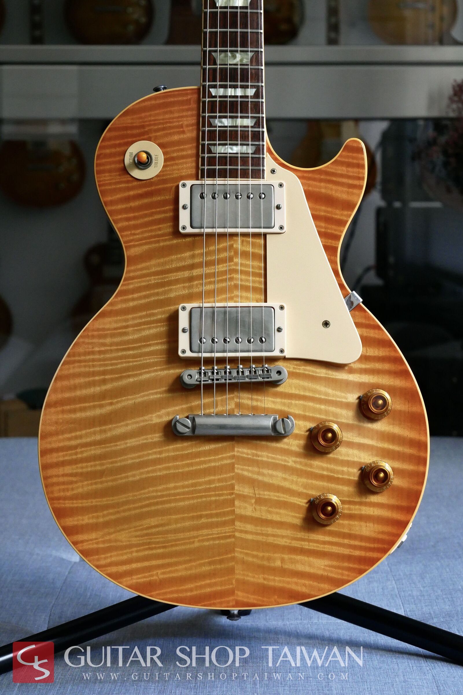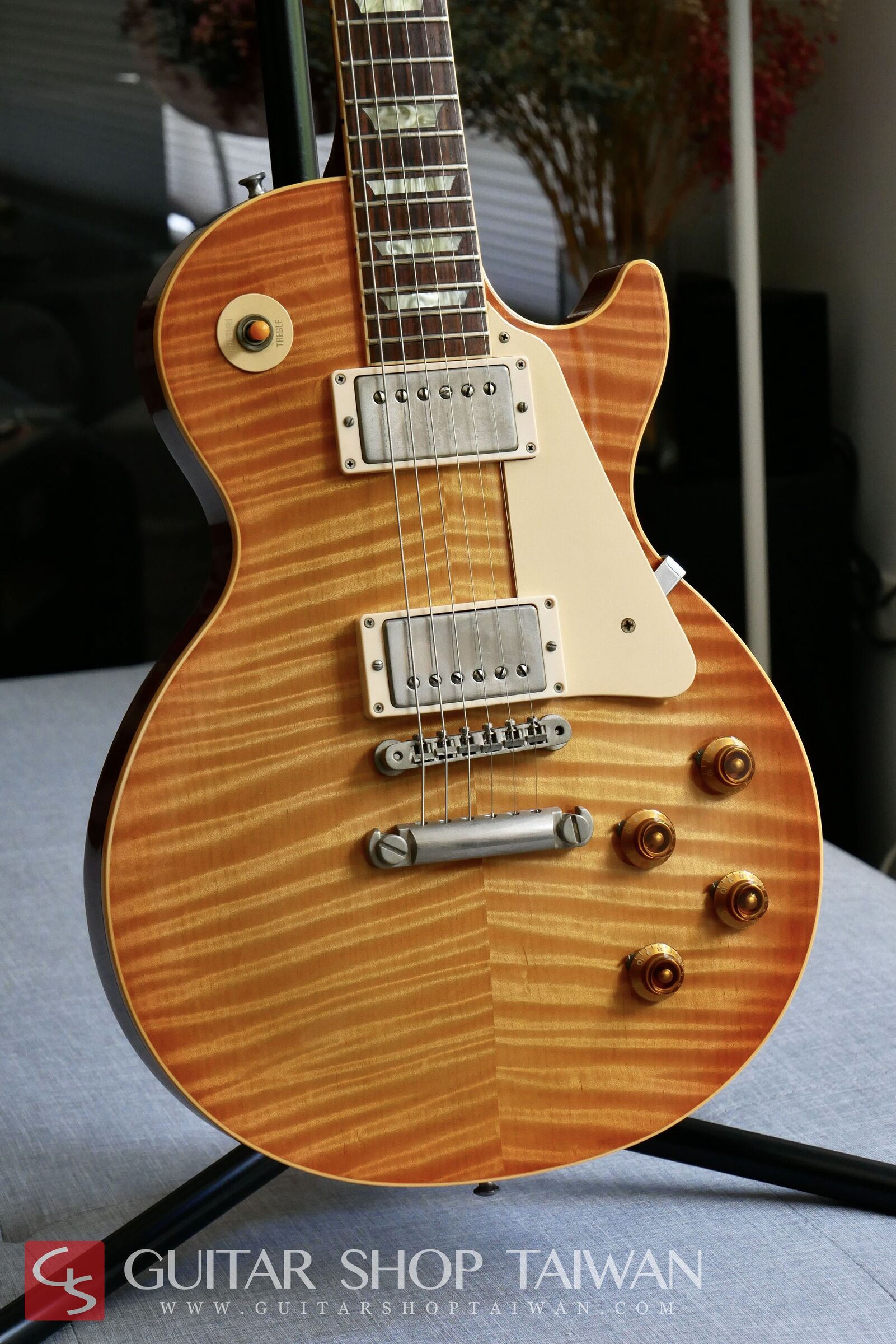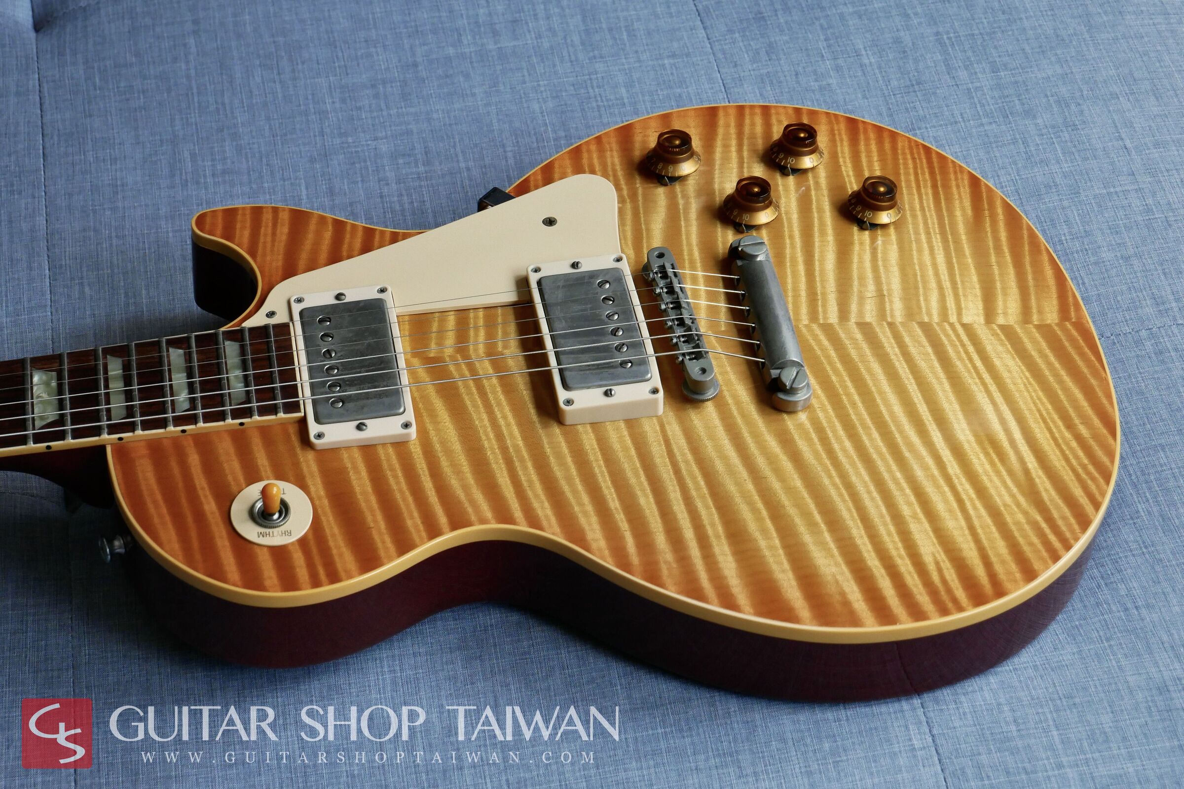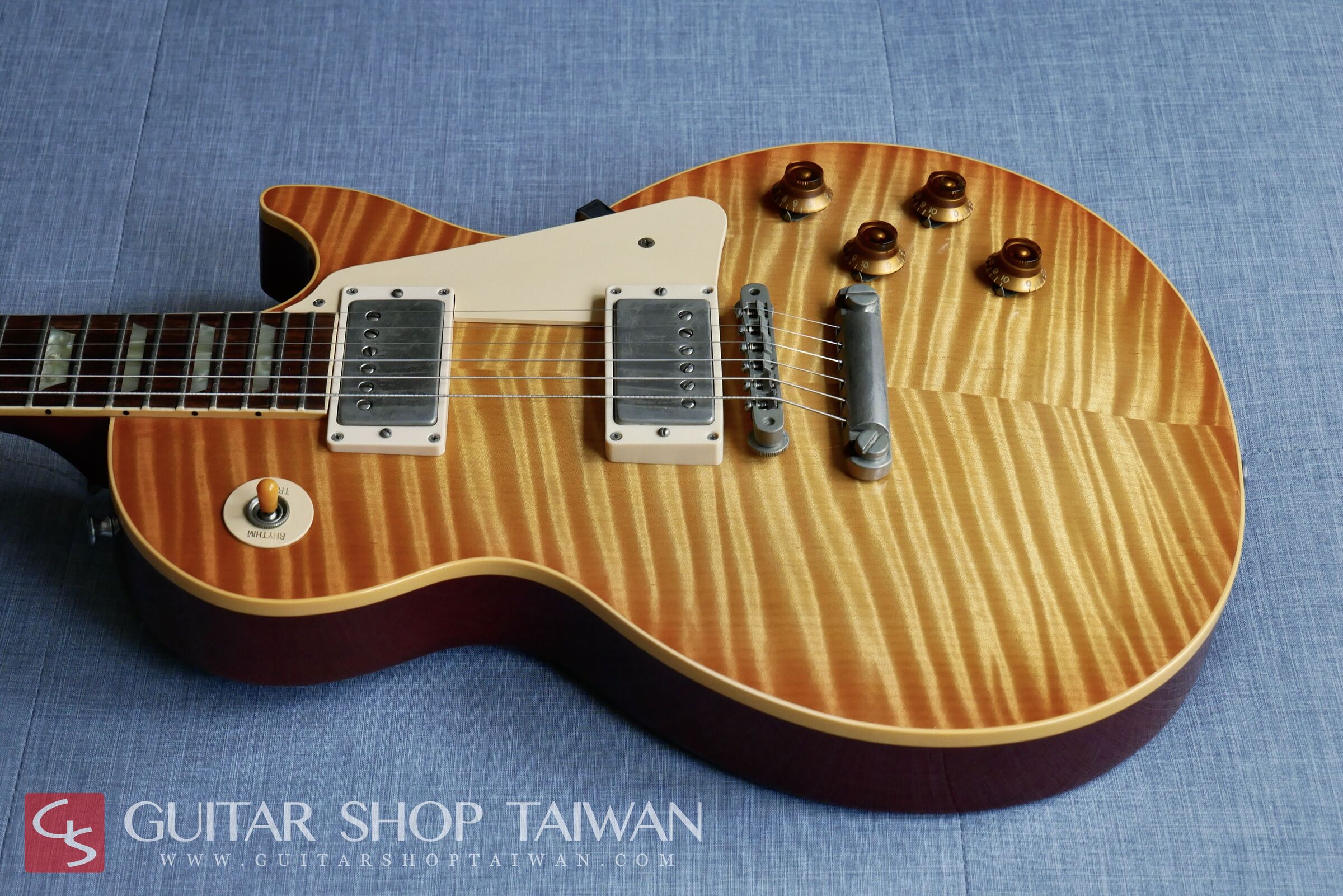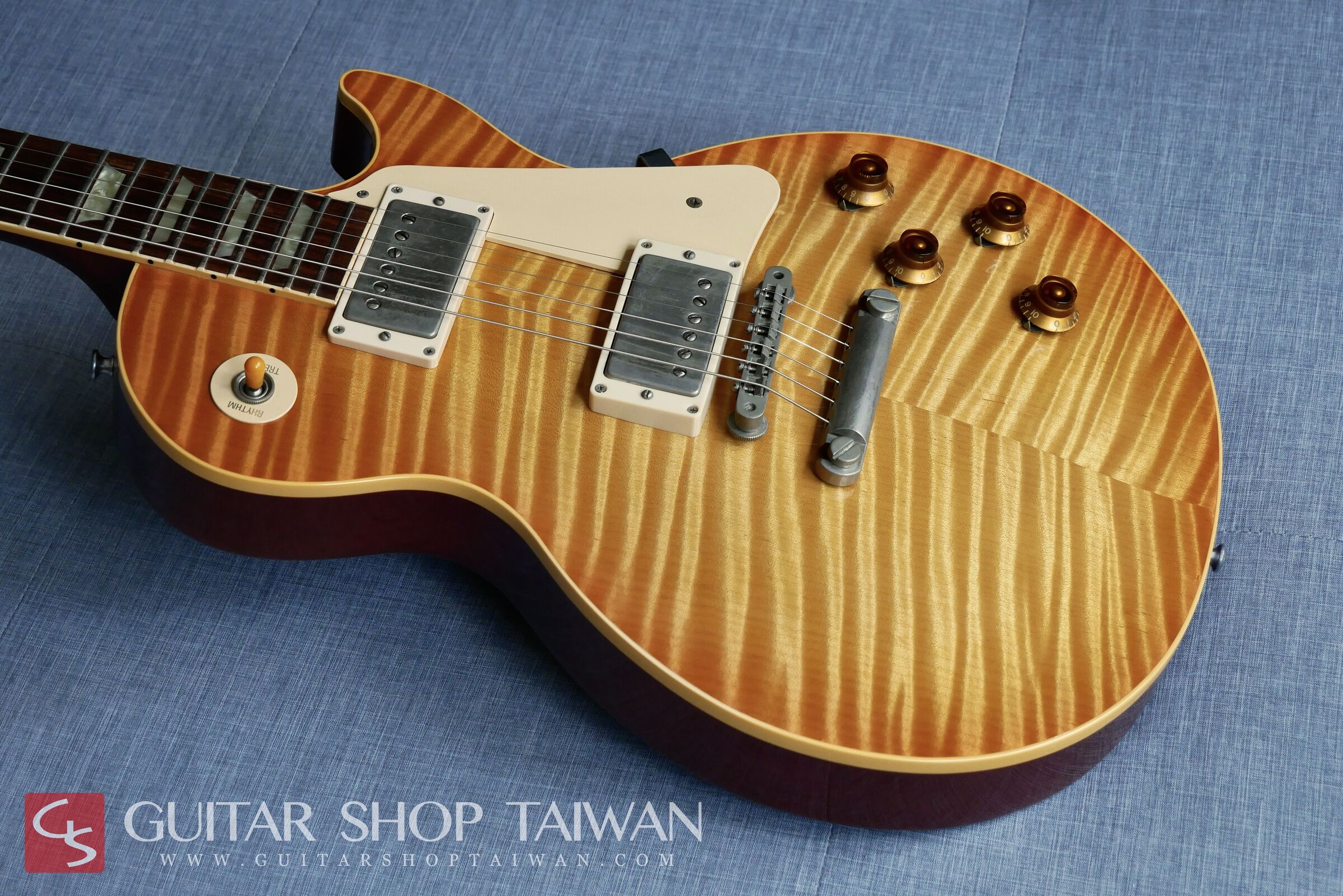 1992 Gibson Custom Shop 1959 Les Paul Reissue 1 of 21 NRG Edition Tom Murphy Painted. Gibson Custom Shop於1992年創廠前一年與美國Normans Rare Guitars共同推出的第一批1959 Les Paul Reissue NRG限定版,由Norman本人親自挑選的大虎紋楓木交由Gibson Custom製作,並由傳奇技師Tom Murphy親手上色,限量21支,這是90年代初期唯一一款有證書的Les Paul Reissue。