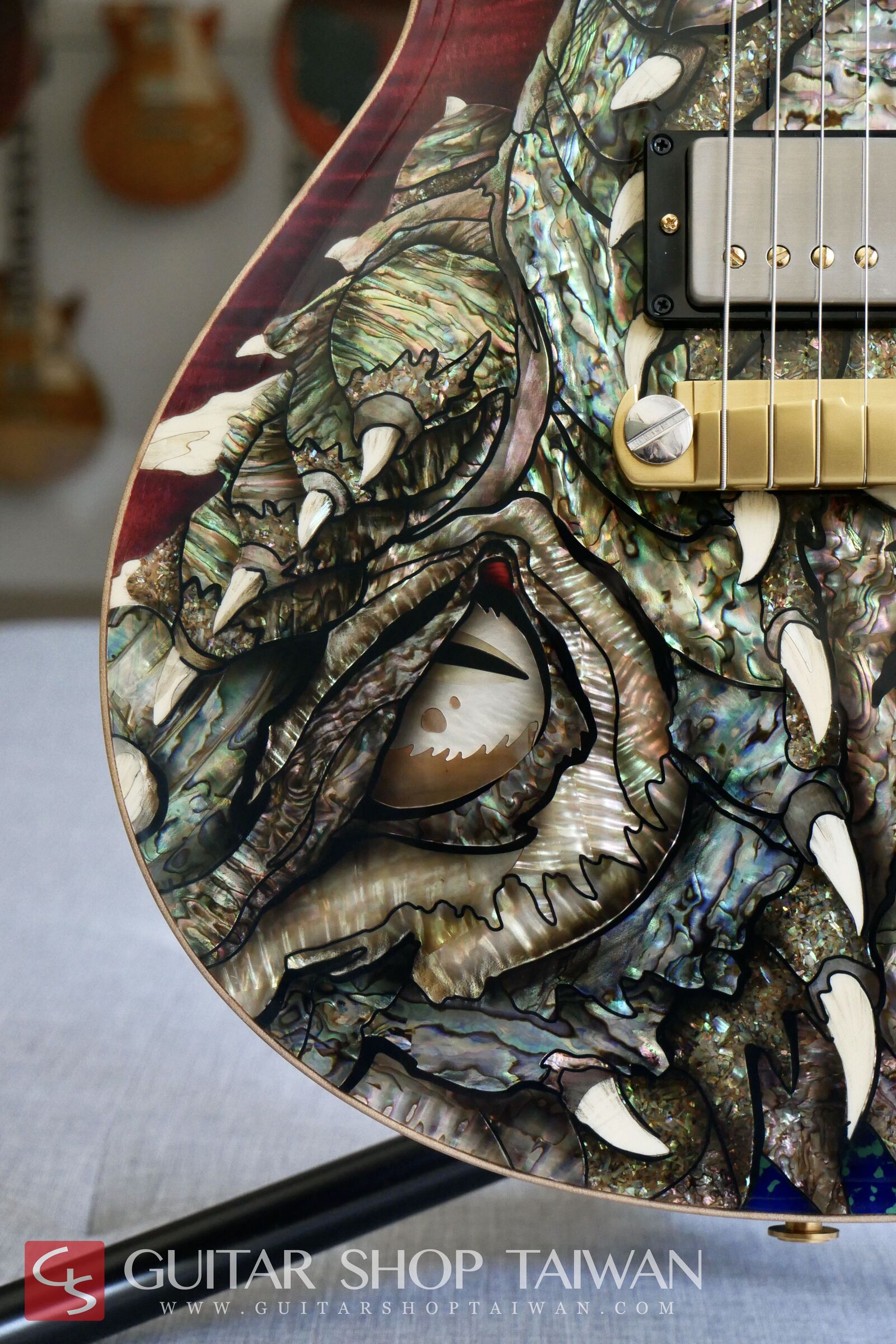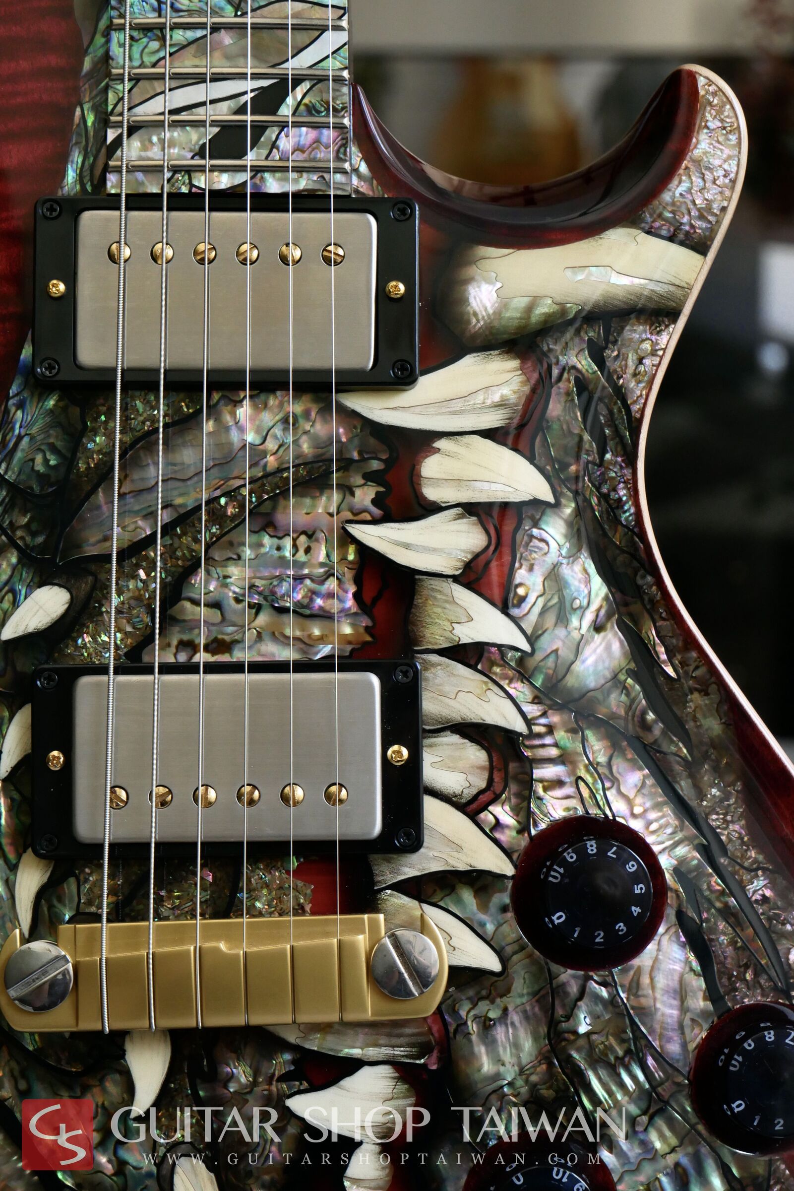 回顧每一代的PRS Dragon系列,這款2002年的Dragon絕對是PRS迄今為止最具有侵略性的鑲嵌作品,與知名鑲嵌工藝公司「Pearl Works」合作,共272塊天然鑲嵌物零件,以純手工鑲嵌,貫穿琴身至指板,使整把琴具有相當霸氣的3D視覺衝擊力,其中使用了12種不同種類的貝殼、5種石頭、甚至還有乳齒象牙化石,而仔細觀察琴面上的乳齒象化石,會發現它們還經過精細的雕刻與配色,使牙齒看起來更加立體真實,要知道PRS琴面是有弧度的,鑲嵌除了非常耗時以外也需要高超的技術,如此精細的手工藝術完美的呈現在吉他上。除了琴身上精細的鑲嵌工藝以外,用料也選用高級木材,整支琴頸與指板為目前CITES公約禁止砍伐的巴西玫瑰木,彈奏相當舒適、順手,觸感一流,琴身為嚴選的桃花心木。