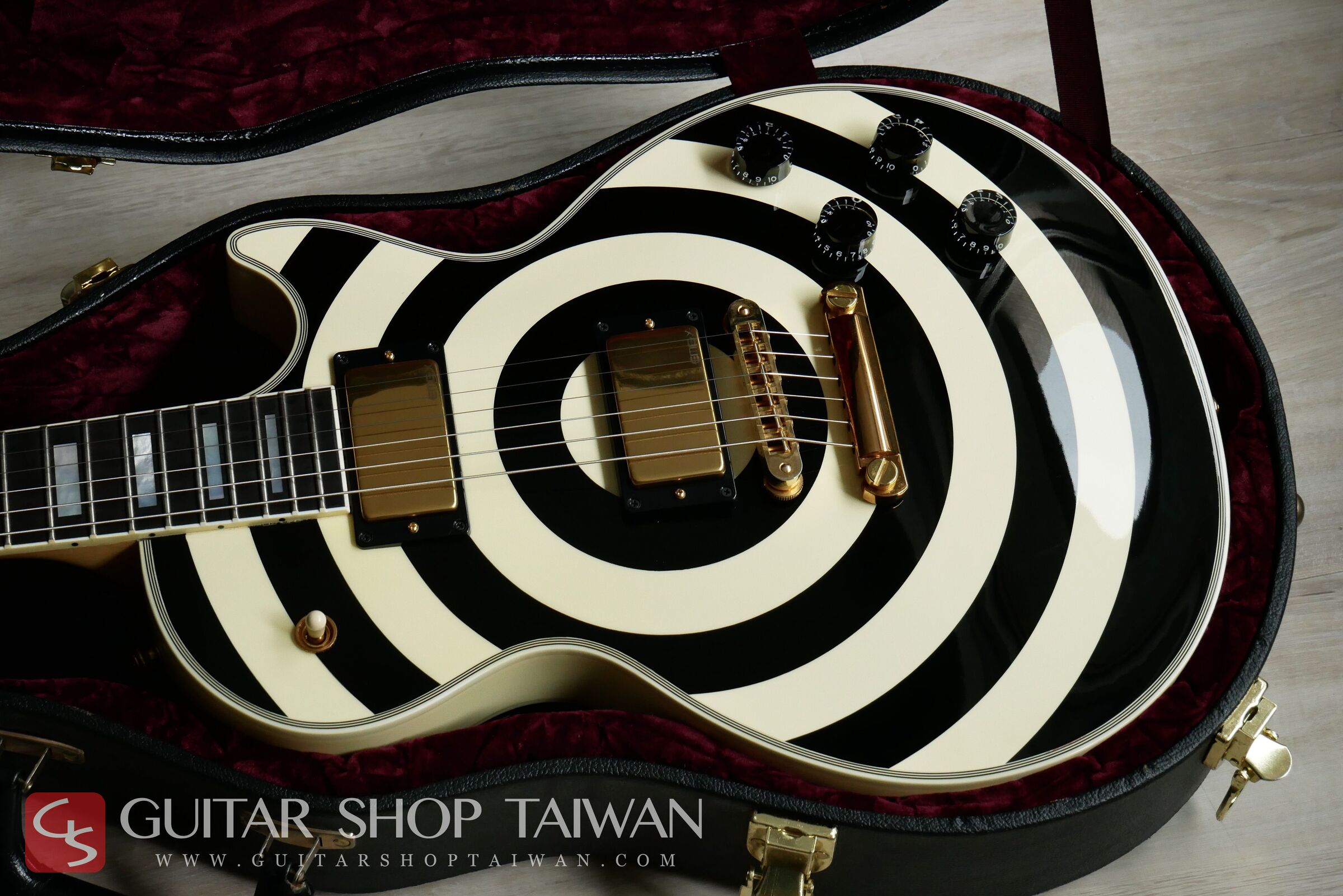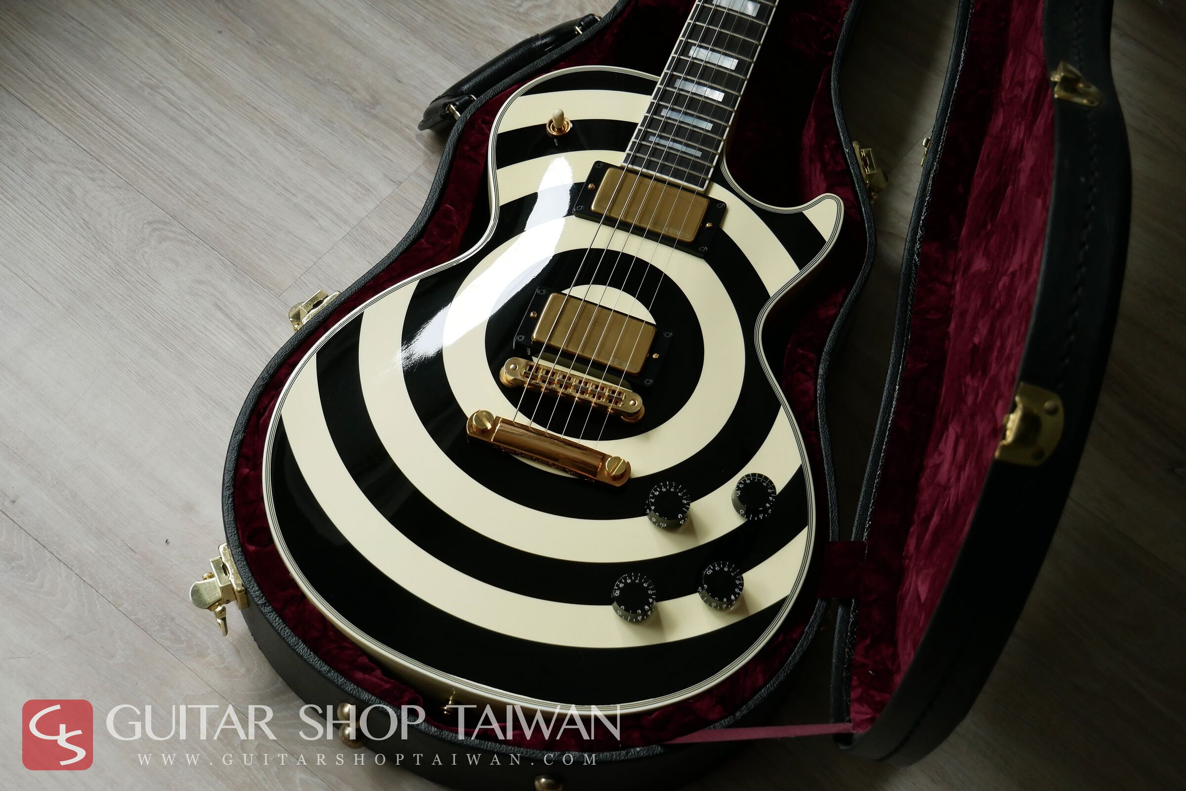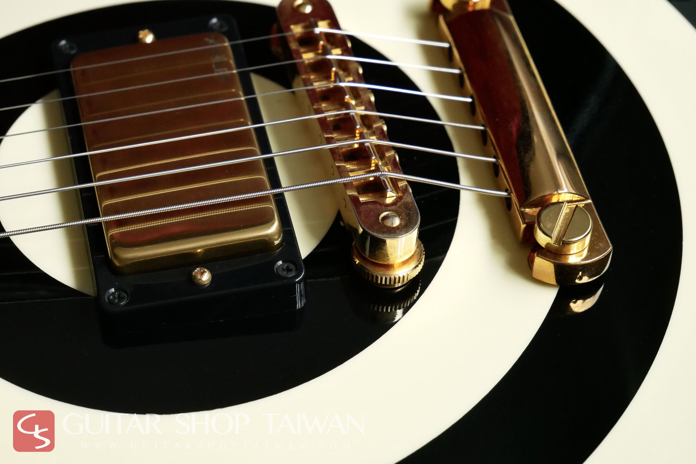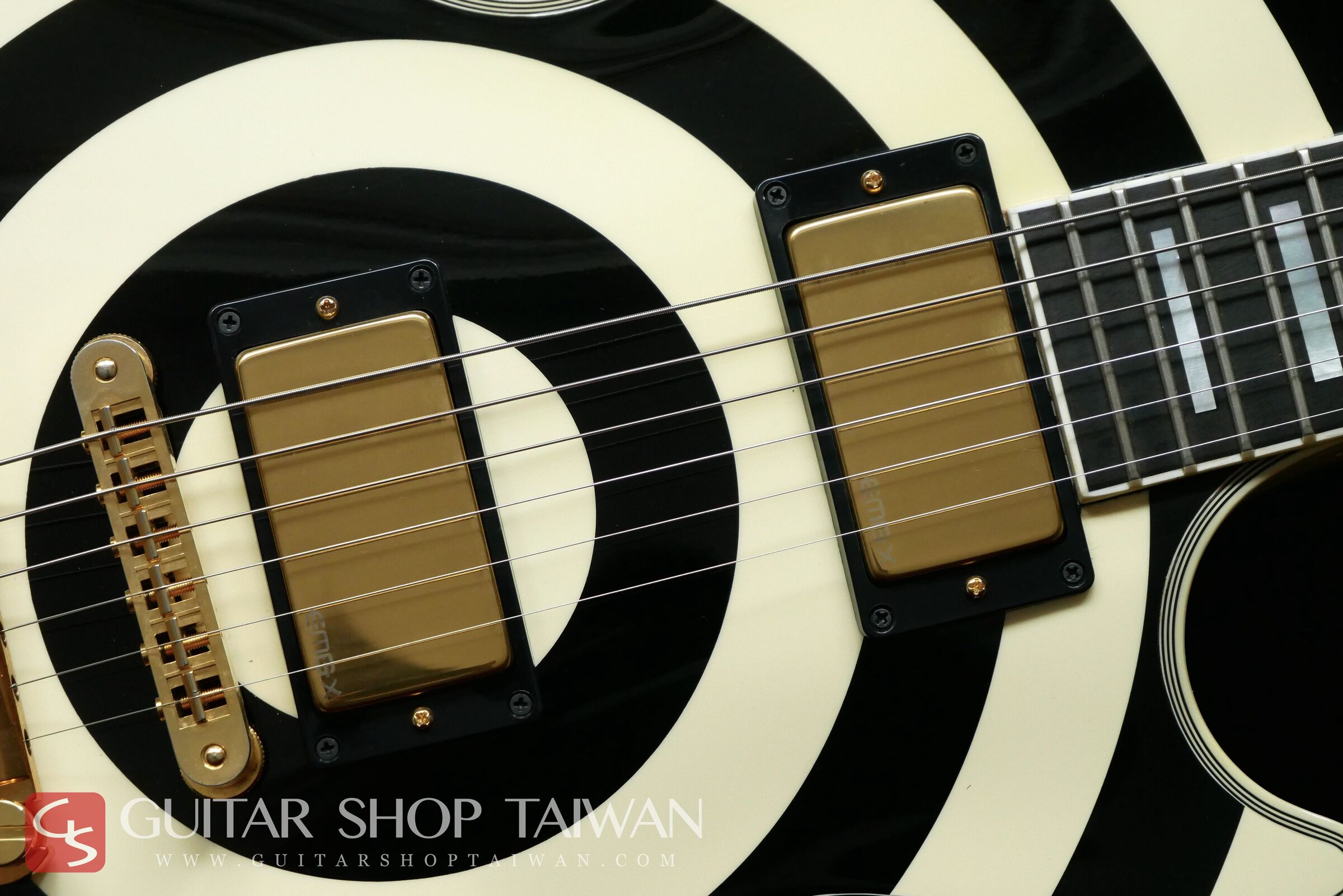 Made in 2008, this guitar is a reissue of the 1981 Les Paul Custom owned by Zakk Wylde. During his time with Ozzy Osbourne, he painted black circles on his white Les Paul Custom, inspired by the spiral pattern from Hitchcock's Vertigo movie poster. However, when the guitar was returned from being painted, the design had become a black and white "bullseye" pattern. This mistake turned the guitar into an iconic symbol for Zakk Wylde and it became his main guitar for most of his career. The Les Paul Bullseye is one of the most classic and recognizable models from Gibson. In 1999, Gibson and Zakk Wylde released a reissue, which was produced in limited quantities over the following years.