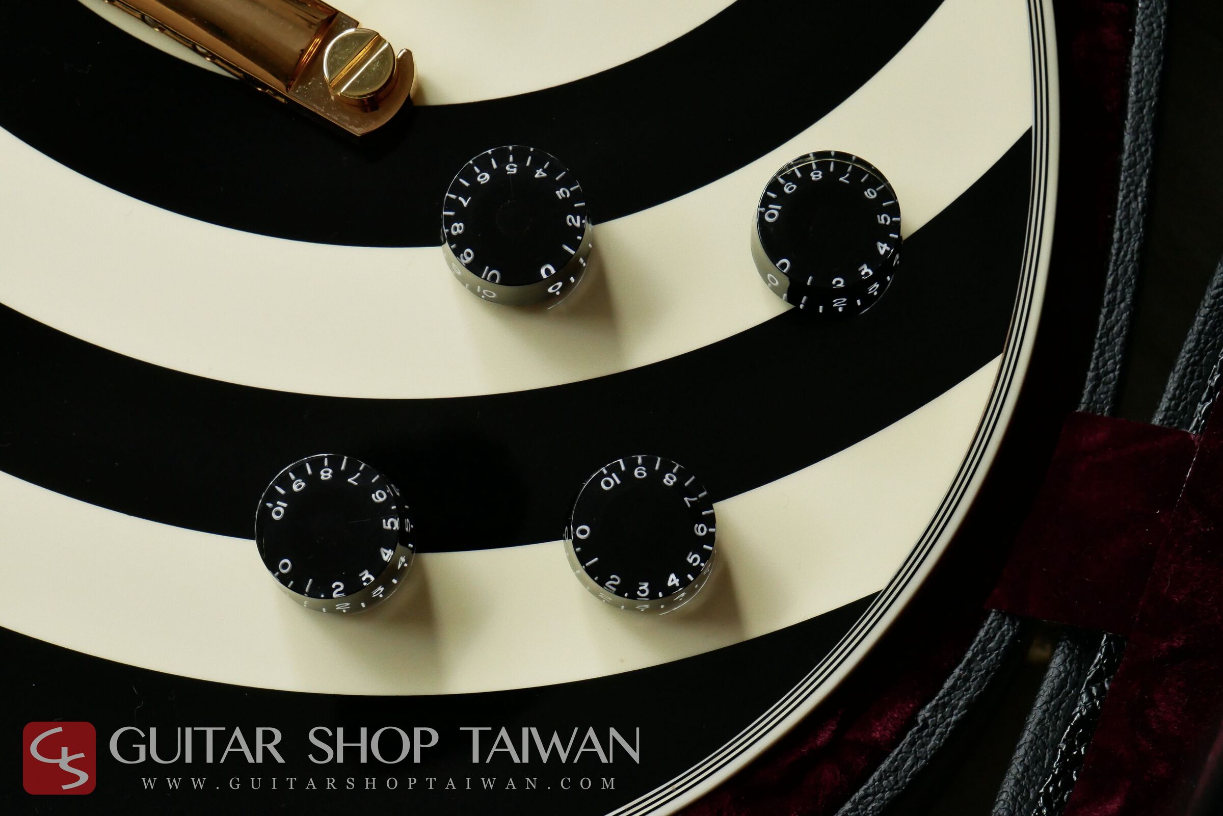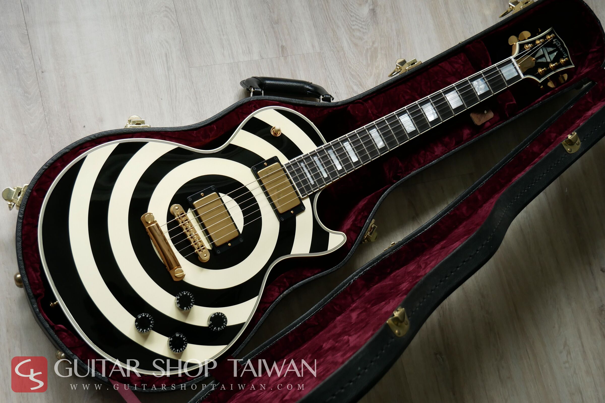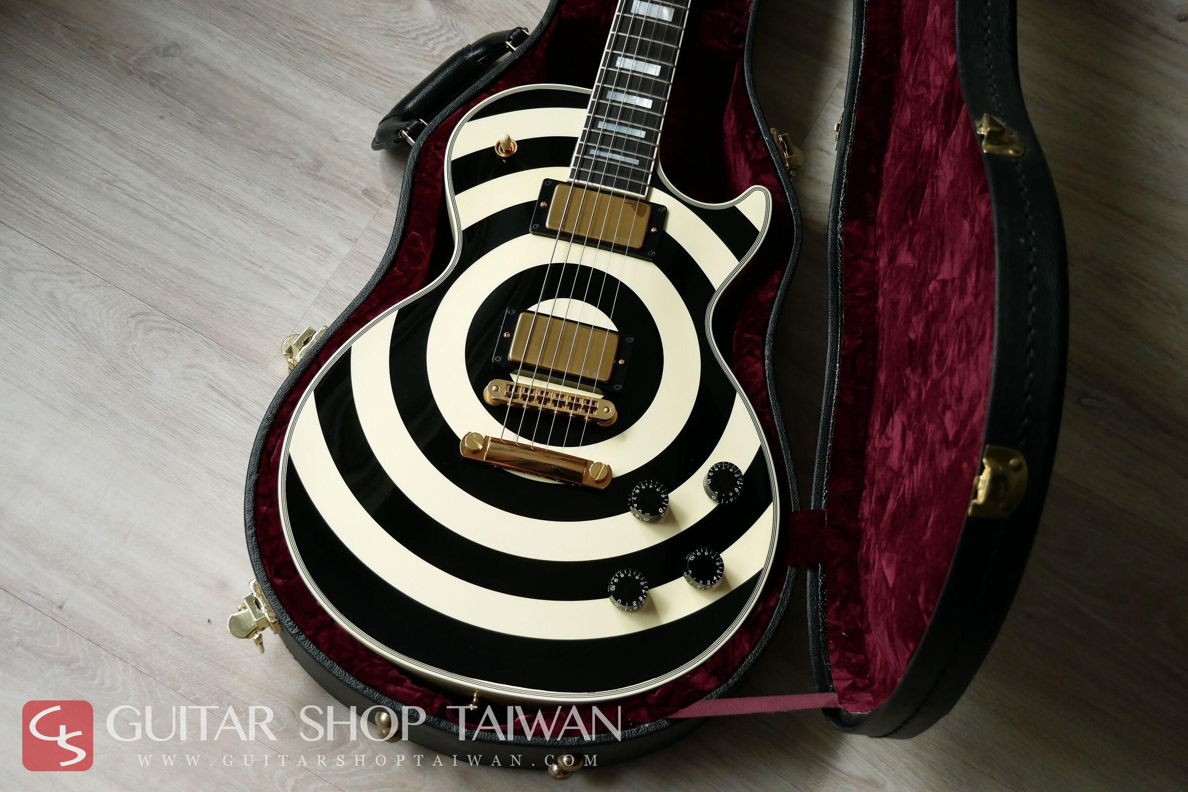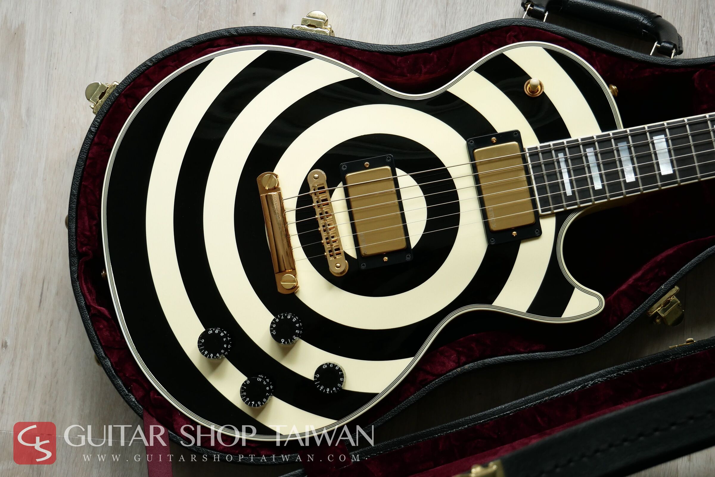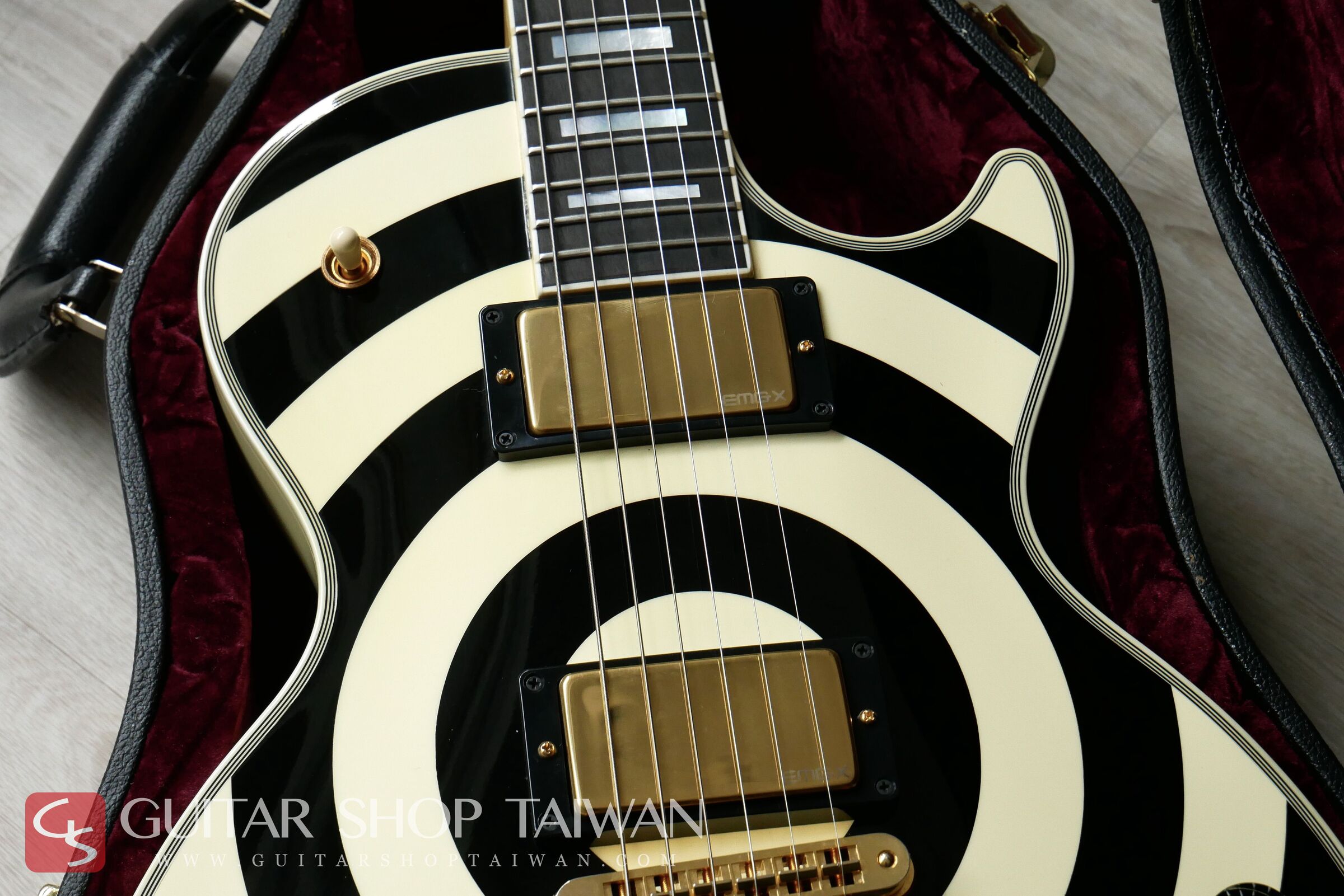 Made in 2008, this guitar is a reissue of the 1981 Les Paul Custom owned by Zakk Wylde. During his time with Ozzy Osbourne, he painted black circles on his white Les Paul Custom, inspired by the spiral pattern from Hitchcock's Vertigo movie poster. However, when the guitar was returned from being painted, the design had become a black and white "bullseye" pattern. This mistake turned the guitar into an iconic symbol for Zakk Wylde and it became his main guitar for most of his career. The Les Paul Bullseye is one of the most classic and recognizable models from Gibson. In 1999, Gibson and Zakk Wylde released a reissue, which was produced in limited quantities over the following years.