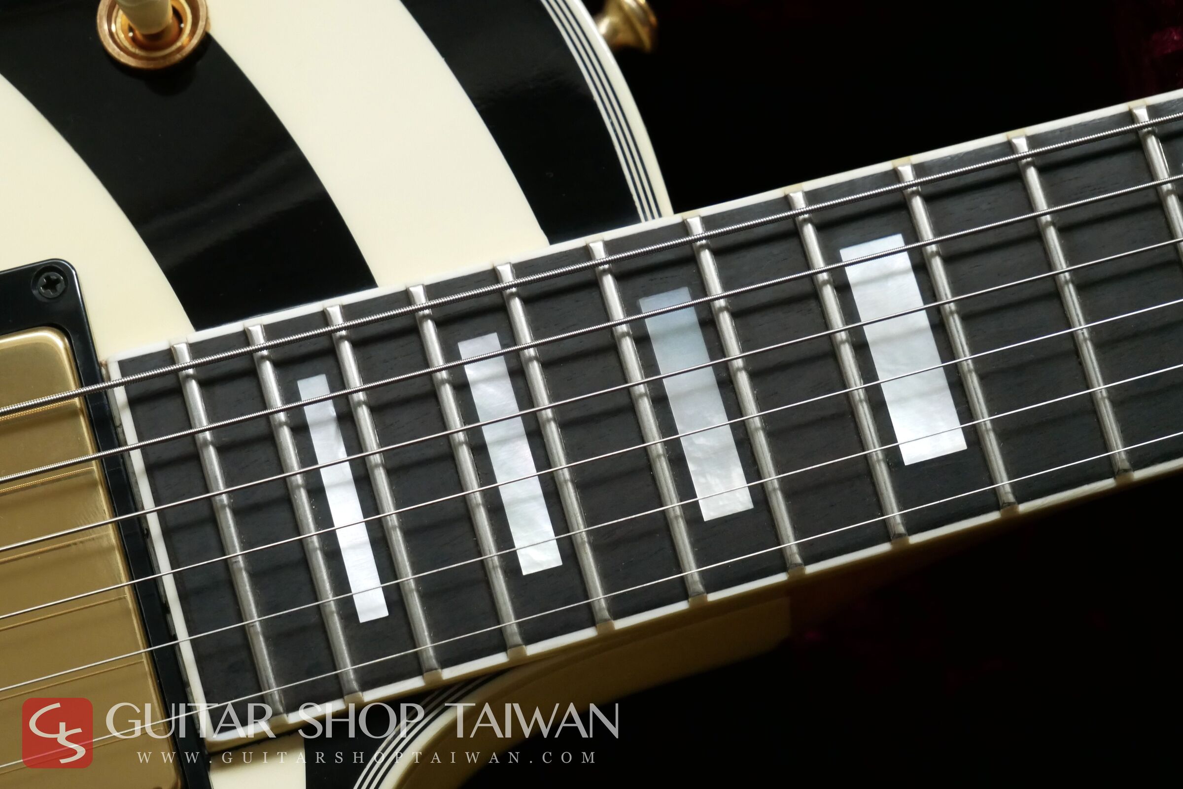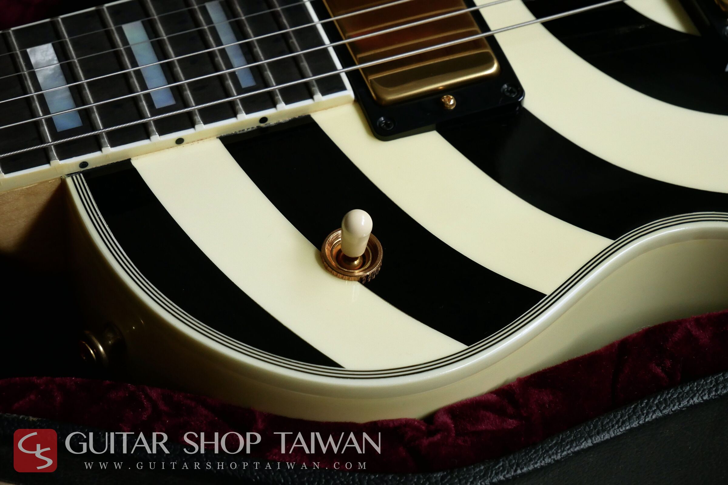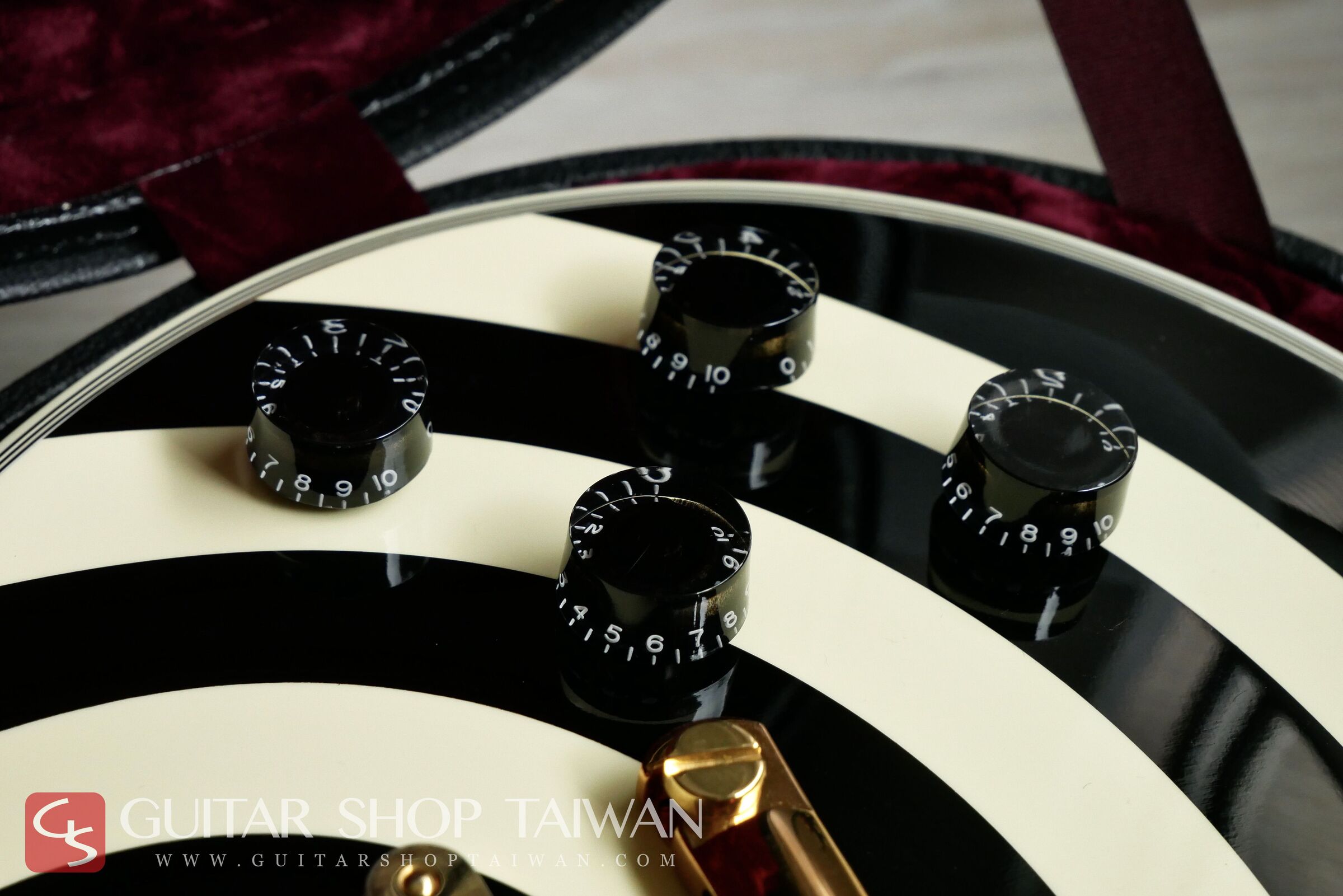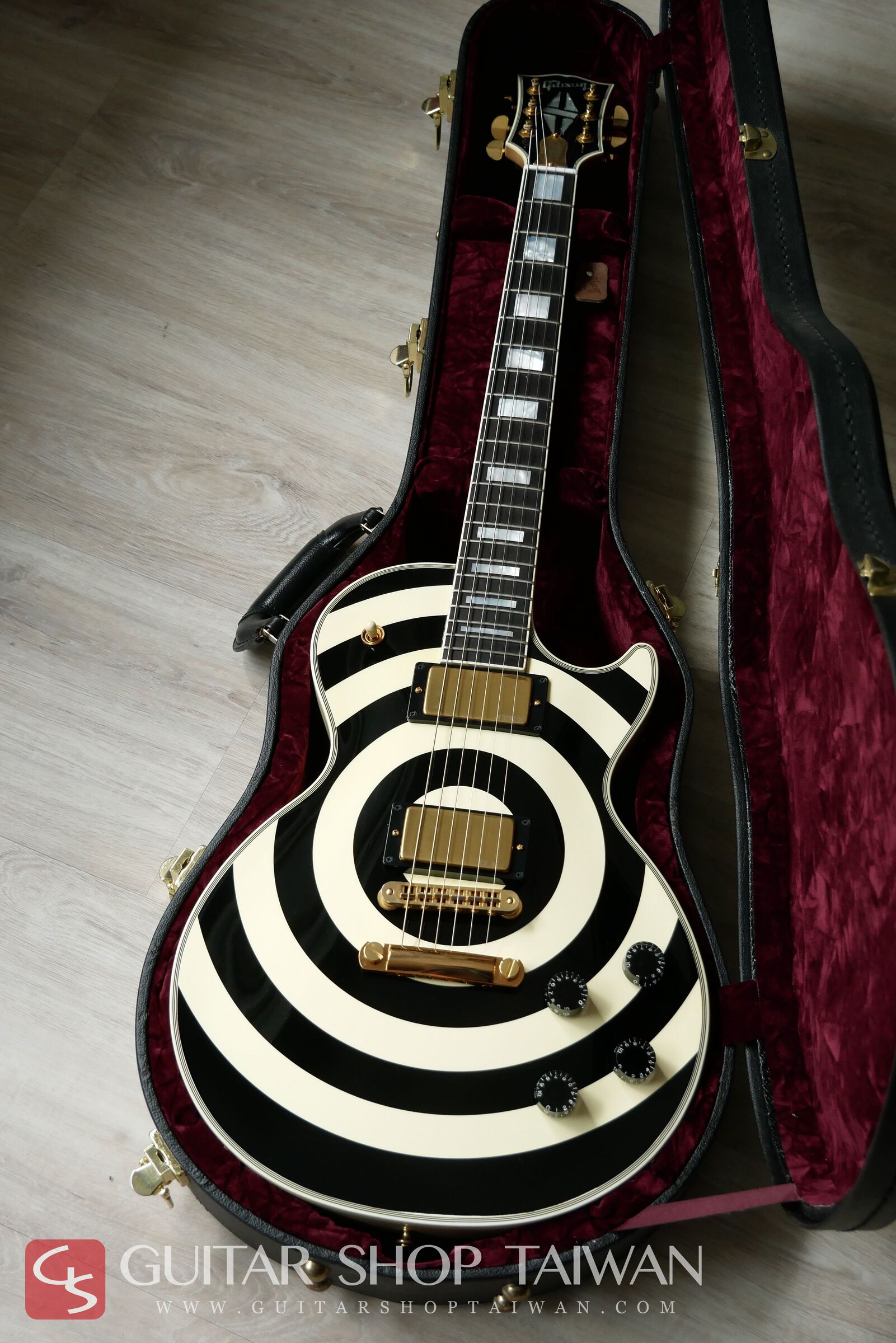 Made in 2008, this guitar is a reissue of the 1981 Les Paul Custom owned by Zakk Wylde. During his time with Ozzy Osbourne, he painted black circles on his white Les Paul Custom, inspired by the spiral pattern from Hitchcock's Vertigo movie poster. However, when the guitar was returned from being painted, the design had become a black and white "bullseye" pattern. This mistake turned the guitar into an iconic symbol for Zakk Wylde and it became his main guitar for most of his career. The Les Paul Bullseye is one of the most classic and recognizable models from Gibson. In 1999, Gibson and Zakk Wylde released a reissue, which was produced in limited quantities over the following years.