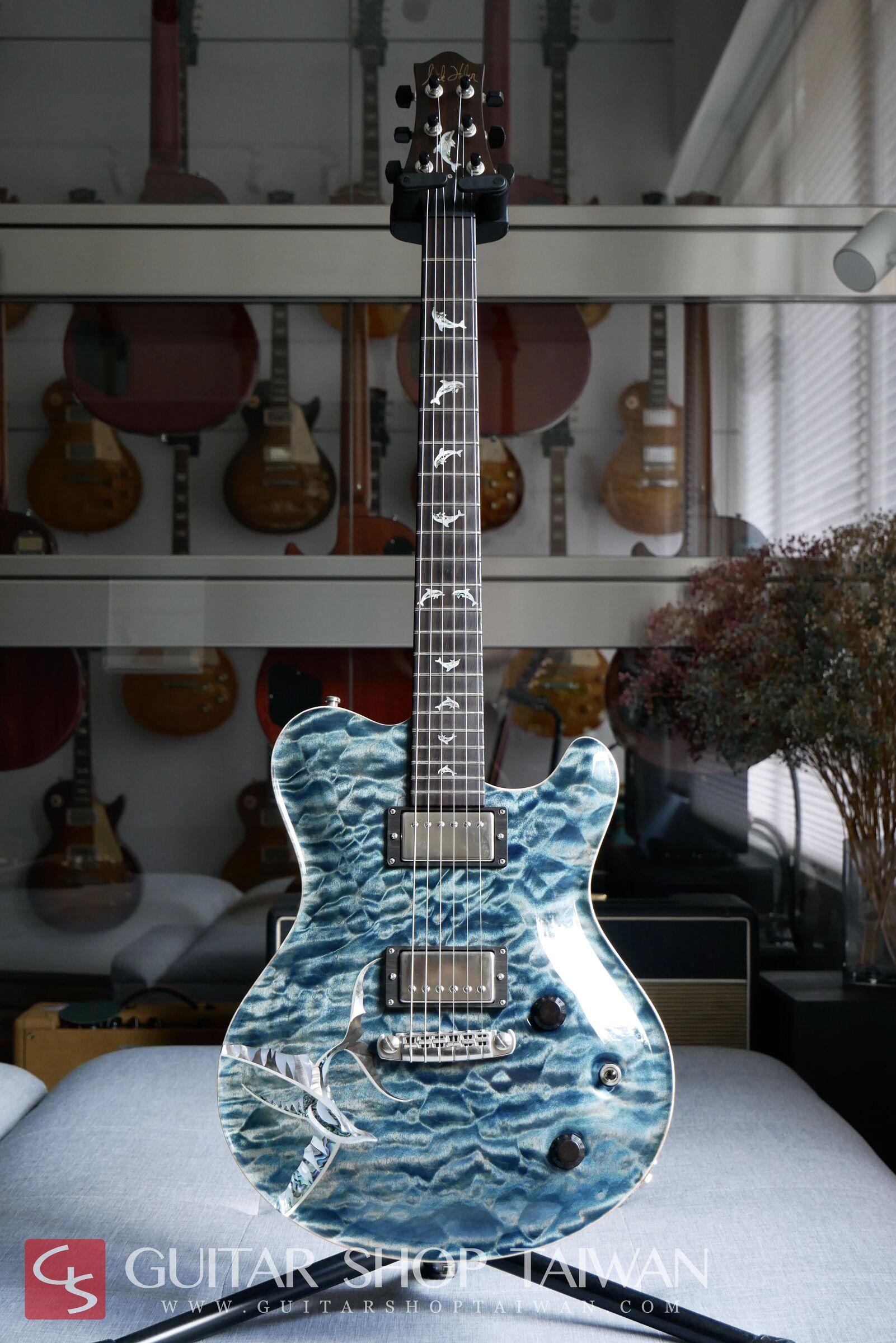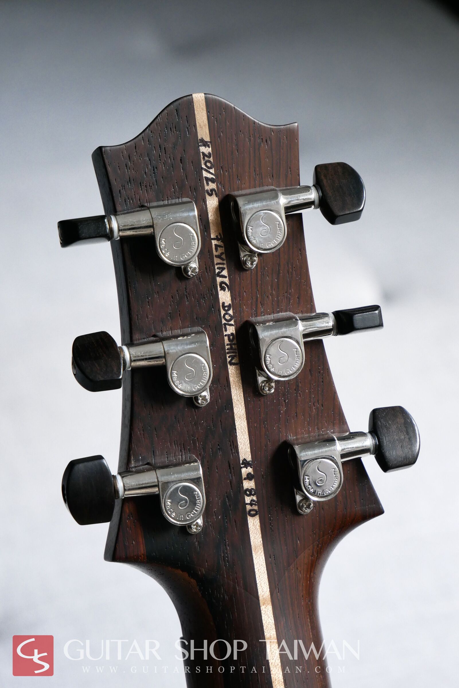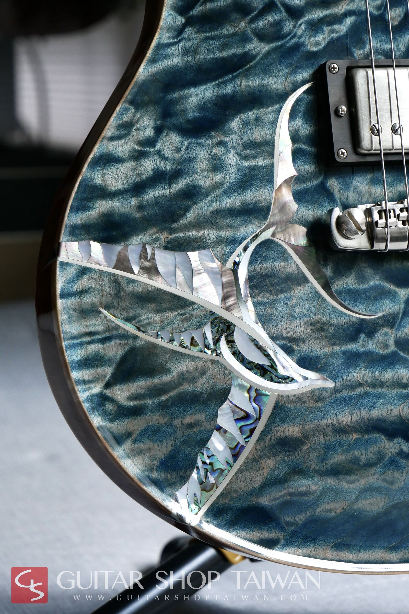 皆為本公司多年收藏,無對外販售。For display only. Not for sale. Flying Dolphin為2009年Nik Huber推出的全球限量25支作品,由Nik本人製作,這是Nik最頂級的作品。琴身為整片One-piece無切割的雲狀楓木,配色為Atlantic Blue大西洋藍,琴面上鑲著由85塊不同種類的貝殼打造的Flying Dolphin,而整支琴頸、指板、拾音器環、弦鈕、轉鈕皆是由巴西玫瑰木製作,琴身則是頂級的虎紋桃花心木。