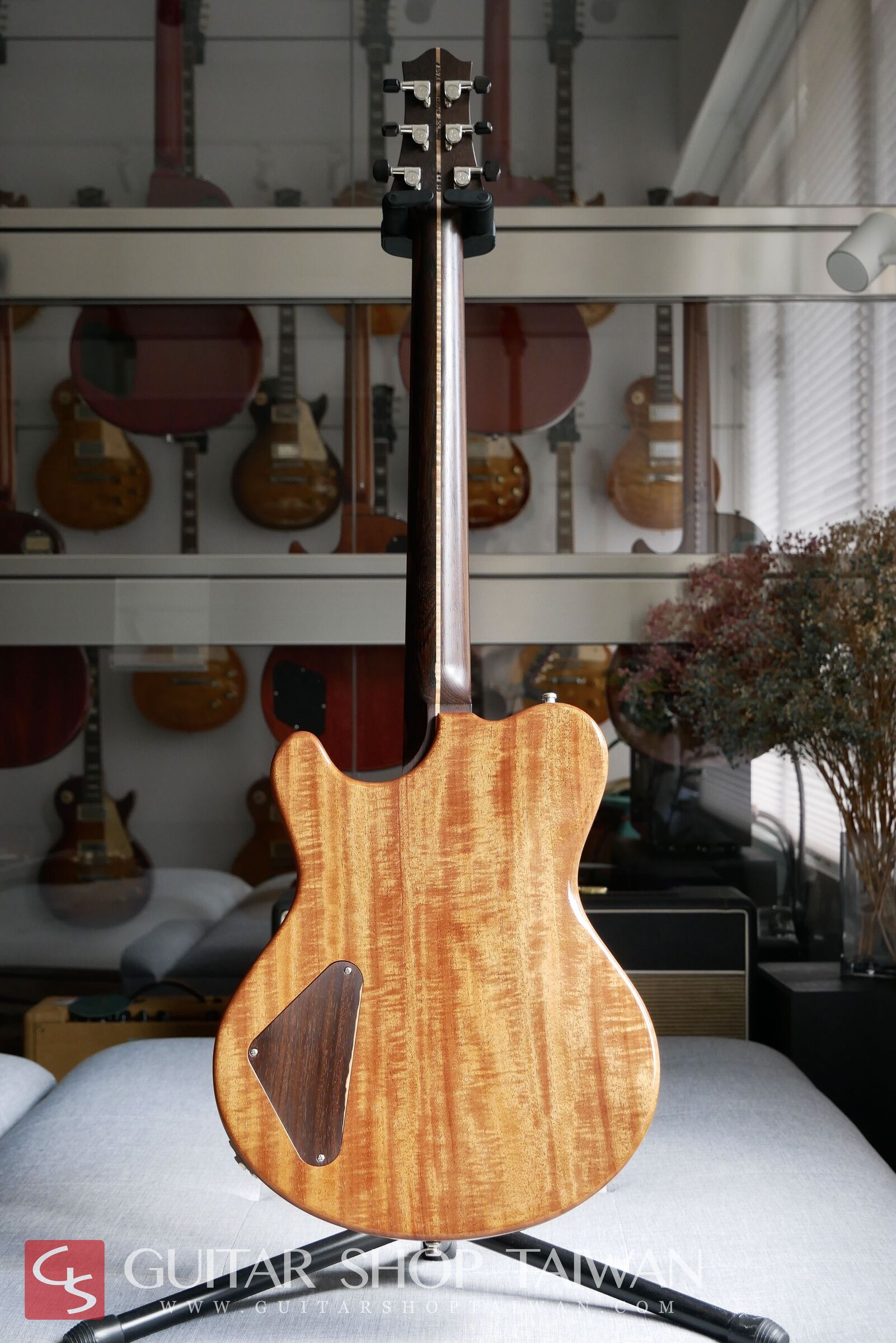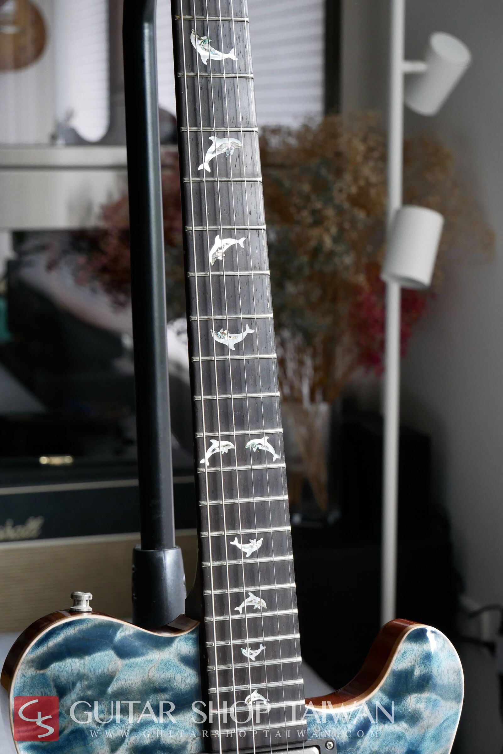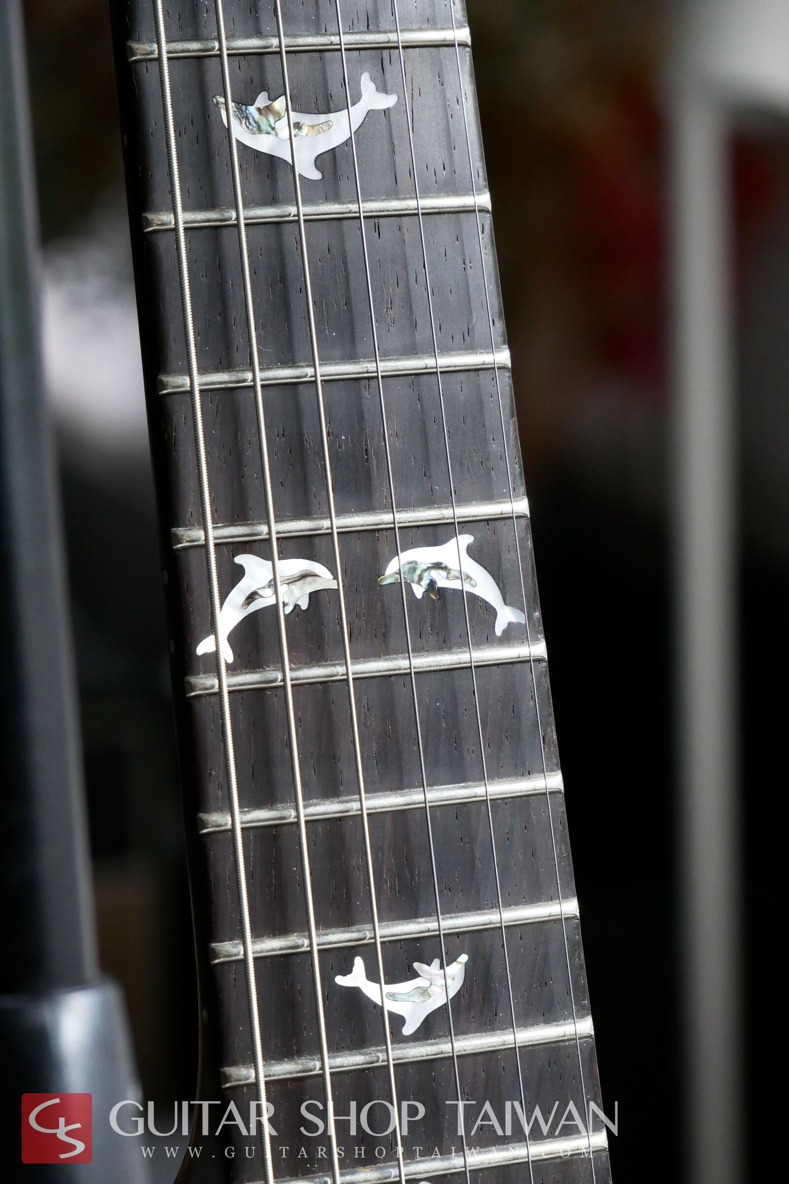 皆為本公司多年收藏,無對外販售。For display only. Not for sale. Flying Dolphin為2009年Nik Huber推出的全球限量25支作品,由Nik本人製作,這是Nik最頂級的作品。琴身為整片One-piece無切割的雲狀楓木,配色為Atlantic Blue大西洋藍,琴面上鑲著由85塊不同種類的貝殼打造的Flying Dolphin,而整支琴頸、指板、拾音器環、弦鈕、轉鈕皆是由巴西玫瑰木製作,琴身則是頂級的虎紋桃花心木。