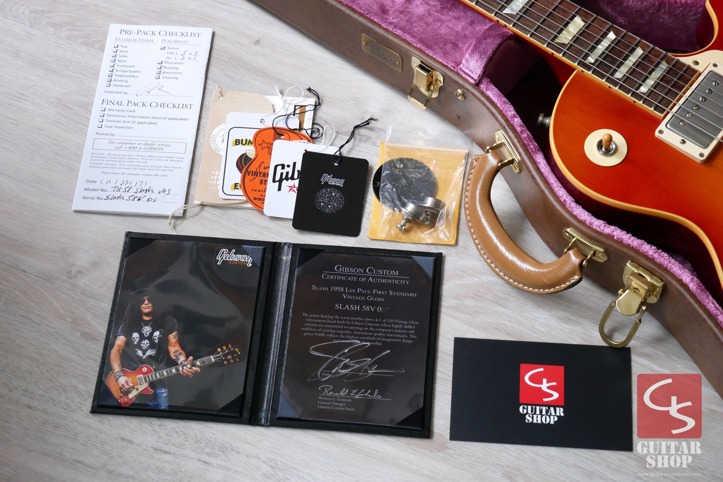 全新收藏品,2017年Slash Les Paul 1958 Reissue “First Standard” #8 3096 Replica Vintage Gloss全球限量150支。以Custom Shop產線中最高等級的True Historic系列為基礎,從最頂級的木料、色漆、黏膠、配件等都和以往的Reissue完全不同,比起過去琴款更精細的複製技術與更完美的音色,不接音箱光是空弦就能感受到木頭共鳴回饋,原廠給True Historic的定義是一把音色幾近完美的Gibson復刻琴。原廠搭配一組複製原琴音色的CustomBucker拾音器,前中段音色非常甜,後段則是出力大且有Gibson獨特濃厚帶有粘膩的鼻音,非常棒的音色。Neck Profile為特規'58 C-shape Profile,手感相當舒適。目前Slash 1958 “First Standard” Replica Aged這款琴在海外市場上已經飆漲超過台幣四十五萬,尚未漲價的Vintage Gloss版本收藏價值與保值性非常高,市場出現的機會也越來越少,有興趣的玩家們把握收藏機會。