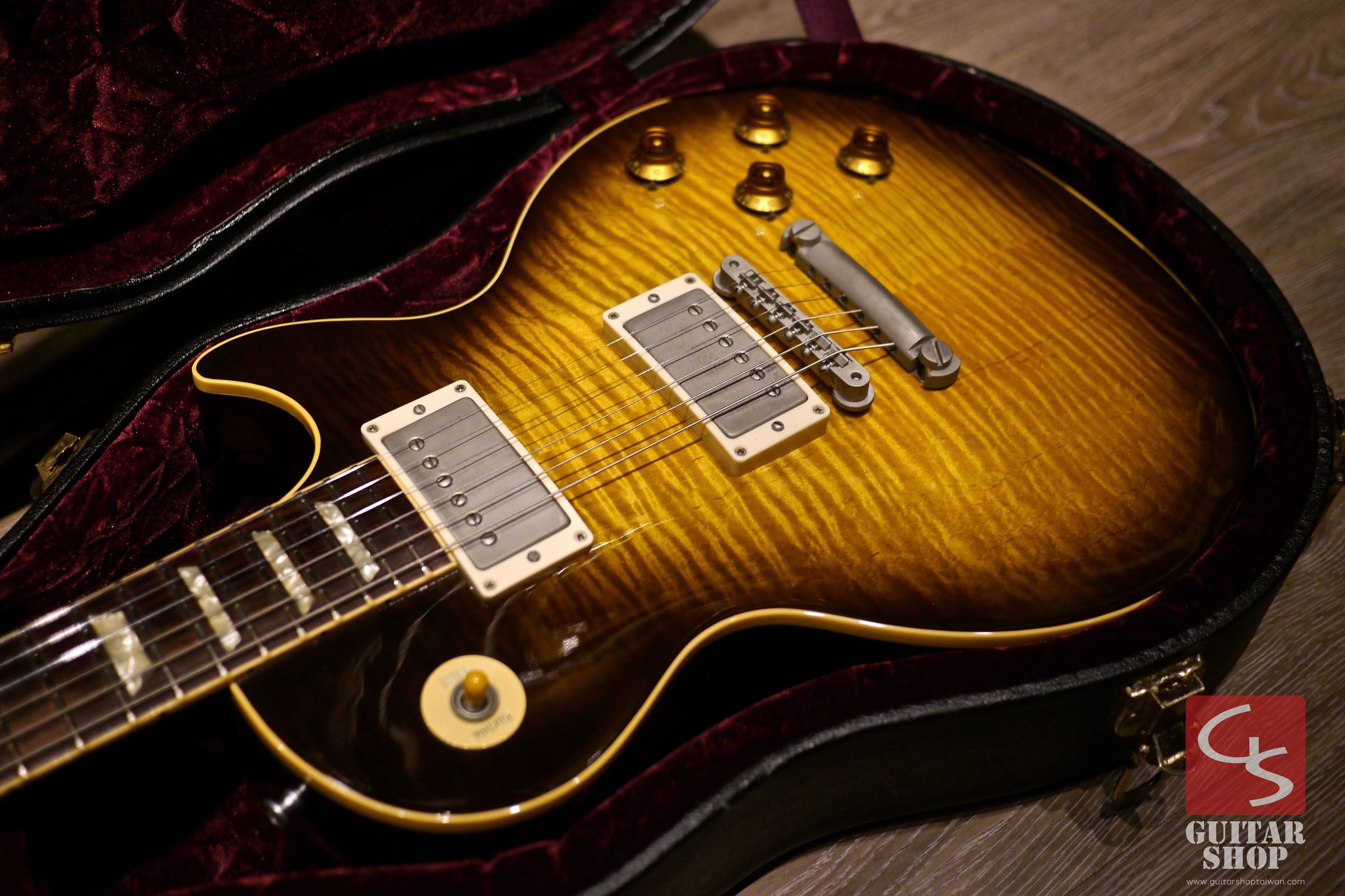 1993年製,這是Gibson Custom Shop正式創廠與R9正式發表的第一年,也是Reissue系列二十六年歷史的第一批的R9,相當經典的一年,包含前25支Tom Murphy上色,原廠僅製作約100支的R9,全搭配AAAA Grade Soft Maple Top,紋路非常漂亮,並在琴頭後方印著Historic Collection的印記。當年除了Cherry Burst配色以外,還製作了一批Heritage Darkburst,而此配色數量只製作約十支左右,因數量過於稀少的關係幾乎沒有相關資料與照片。桃花心木琴身、玫瑰木指版,琴頸為'59 Neck Profile,原廠配置'57 Classic拾音器,整體的質感與音色和後期的R9有著完全不同的感受。二十六年的琴,狀況九成新,些許不明顯的使用痕跡,狀況維持得相當完好。目前市面上90年份的R9已經非常少見,更別說是1993年份且是更為稀有的Heritage Darkburst配色。