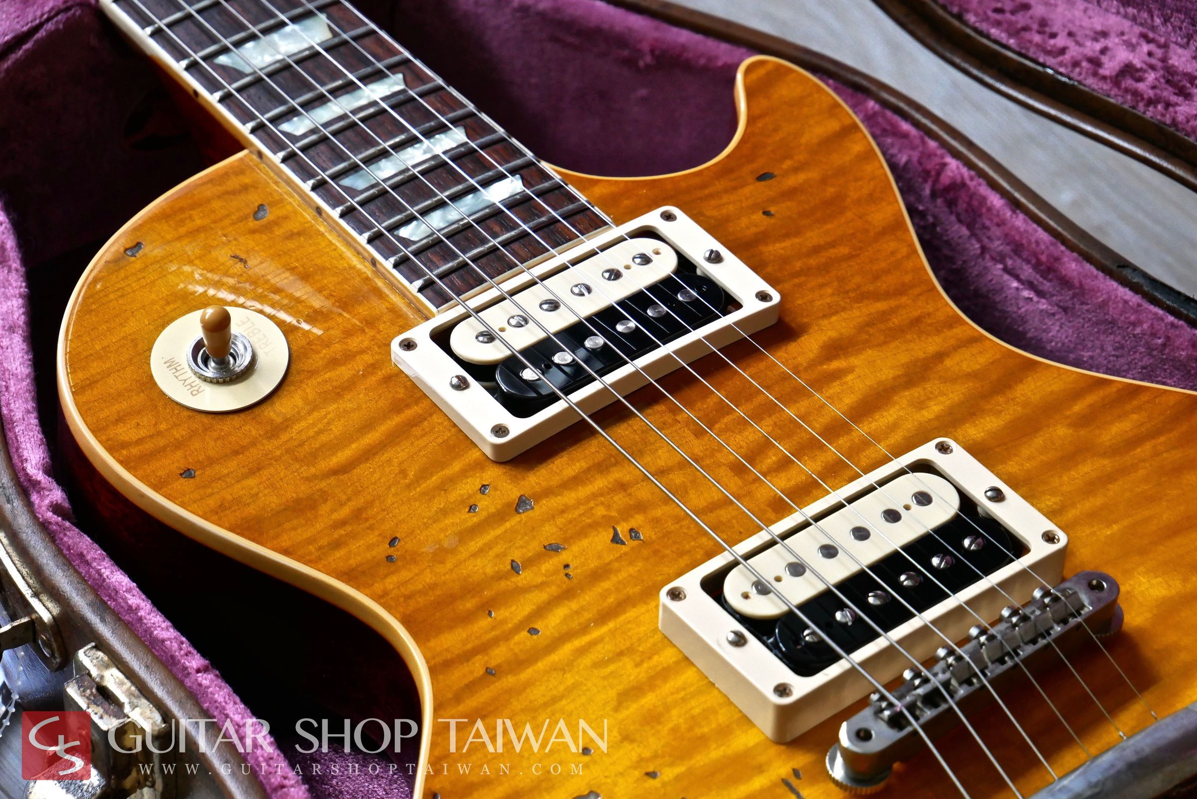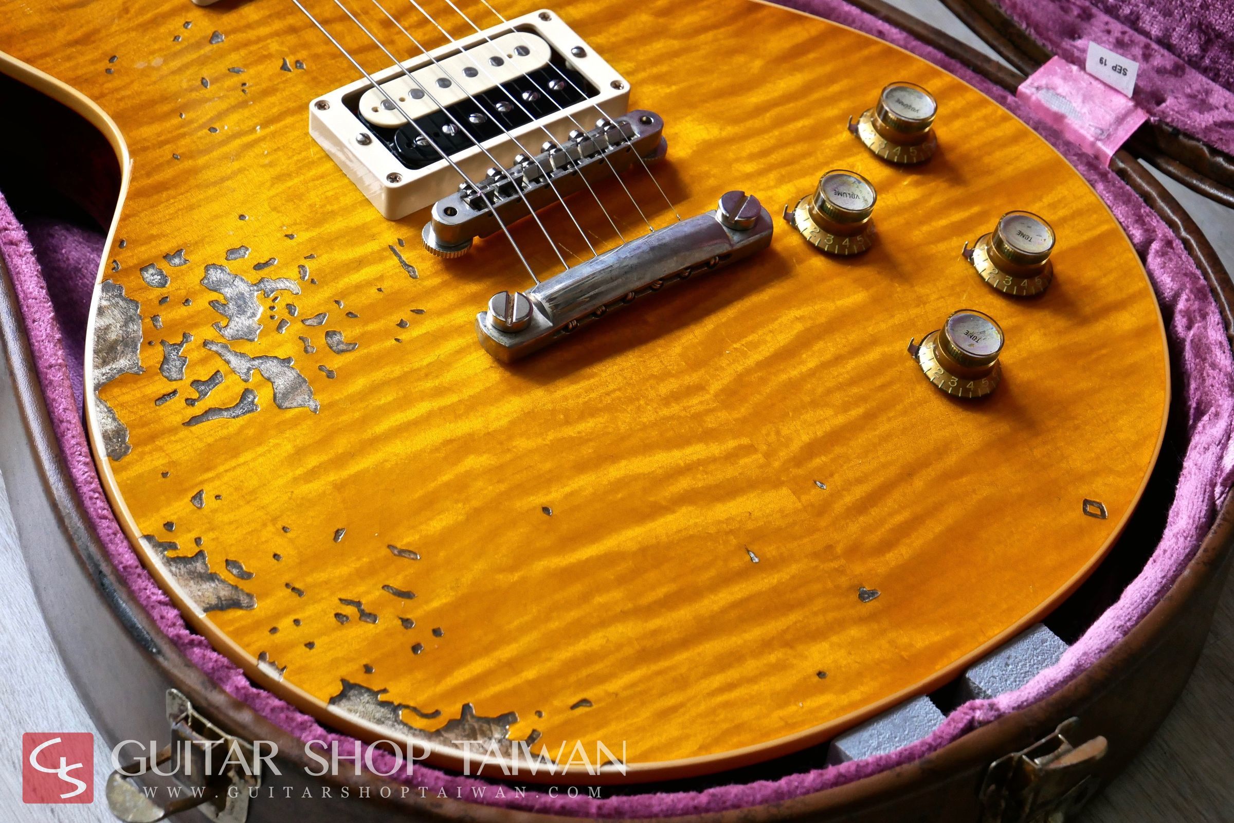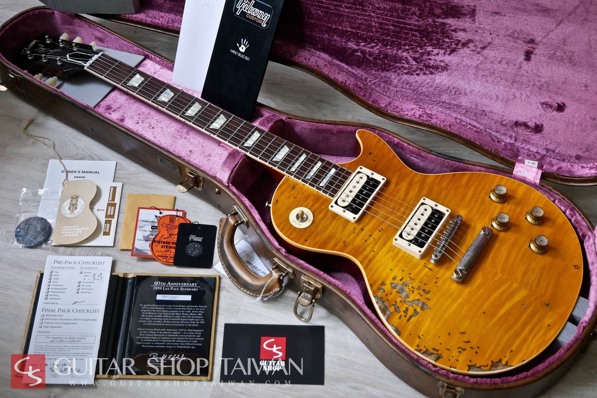 2019年Gibson Custom全新推出的新款六十週年紀念版,和市面上的六十週年不同,這是日本經銷的Hand Selected Editon手選特別版,以Slash最為經典的1959 Les Paul AFD為基底,製作僅僅約15支,於日本當地限定販售,包括琴身傷痕位置、零件配置、拾音器配色等都與2010年Gibson Custom Shop推出的Slash AFD相似,整支琴看起來幾乎沒有差異,但此Hand Selected手選限定版規格等級更高,用料也更好。由日本經銷商親自前往美國Nashville Custom Shop工廠進行紋路、木材重量等挑選後製作,木頭重量只有3.65公斤/8.05磅左右,這是非常難得的重量,音色也會來得比普通版本更好。這款六十週年紀念版R9是被原廠譽為Gibson最好、最復古的Les Paul Standard Reissue,且在市場上的評價相當高。新款的Les Paul Reissue加入了多年來研究Collector's Choice與True Historic系列的成果,從3D掃描的Top弧度以及琴頸規格和利用化學重建的塑膠料件,當然也包含了近年來一直使用的Hide Glue,而在今年原廠將電容改為了Luxe的全新手工大黃蜂,而這些細節都確實影響了吉他的音色,盡可能接近真正的50年的Les Paul,而VOS版本的金屬與漆面輕微舊化使得這支琴更加的復古。桃花心木琴身、Indian Rosewood指板,搭配一組Seymour Duncan Alnico II Pro Slash APH2N/AP Pickups簽名版拾音器,完整濃烈的Slash音色。2010年的Custom Shop Slash AFD Aged在目前市面上中古價格約落在台幣百萬上下,如果想要外觀相似、用料等級更高,這款絕對是首選。