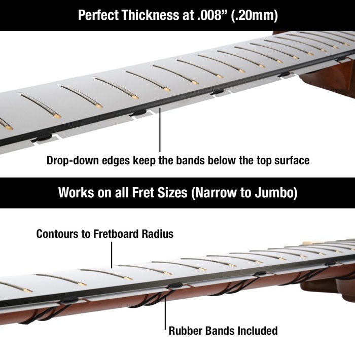 Fret Shield 使用優質的不銹鋼,厚度僅為0.2mm,精密的製造工藝:無毛邊,邊緣光滑圓潤既不傷琴也不割手。